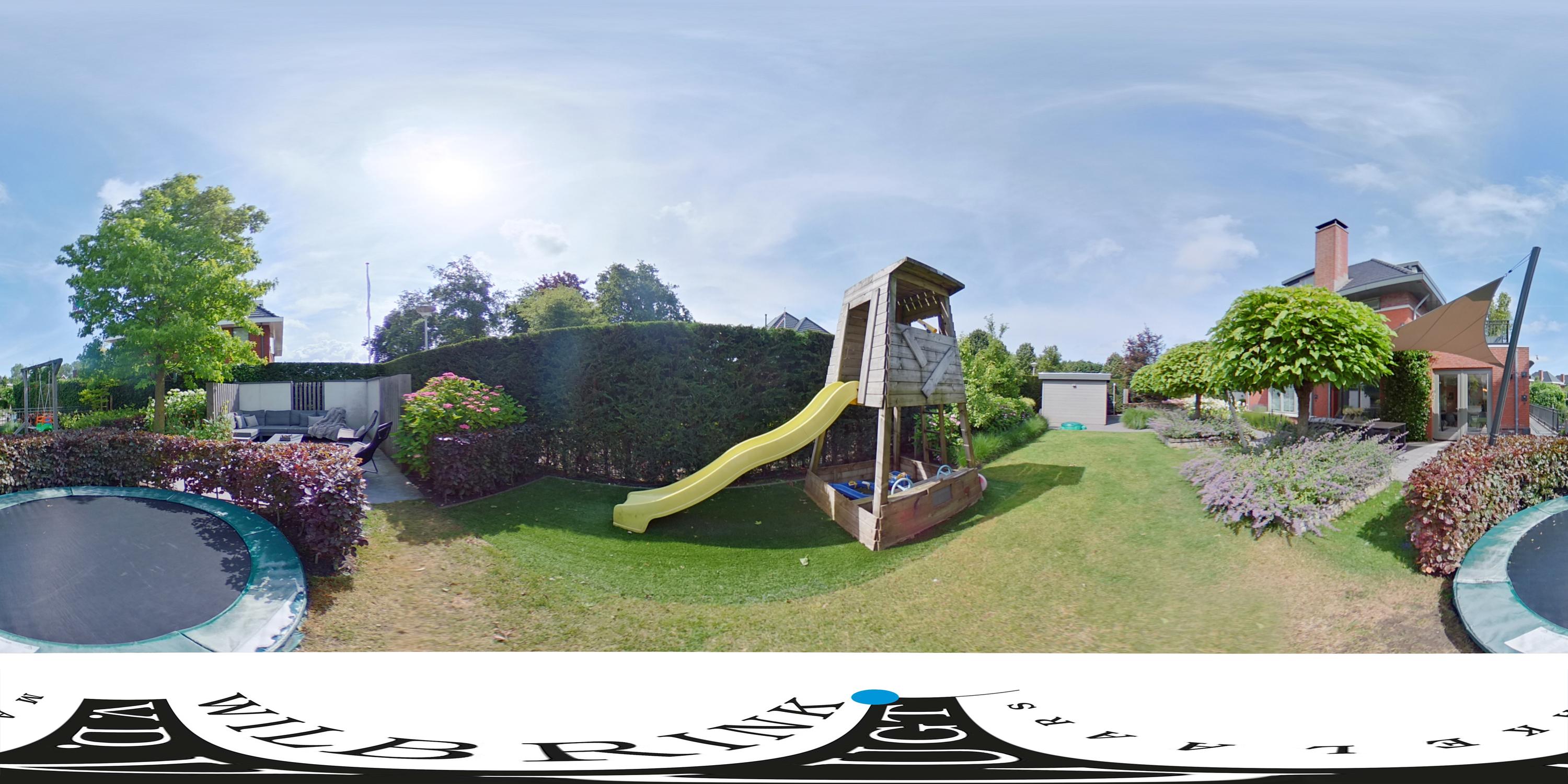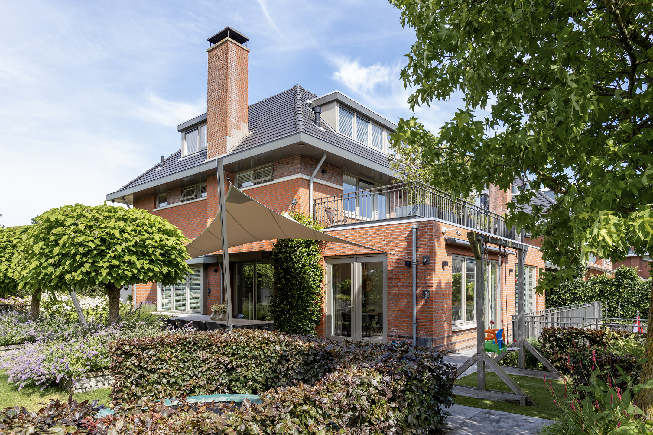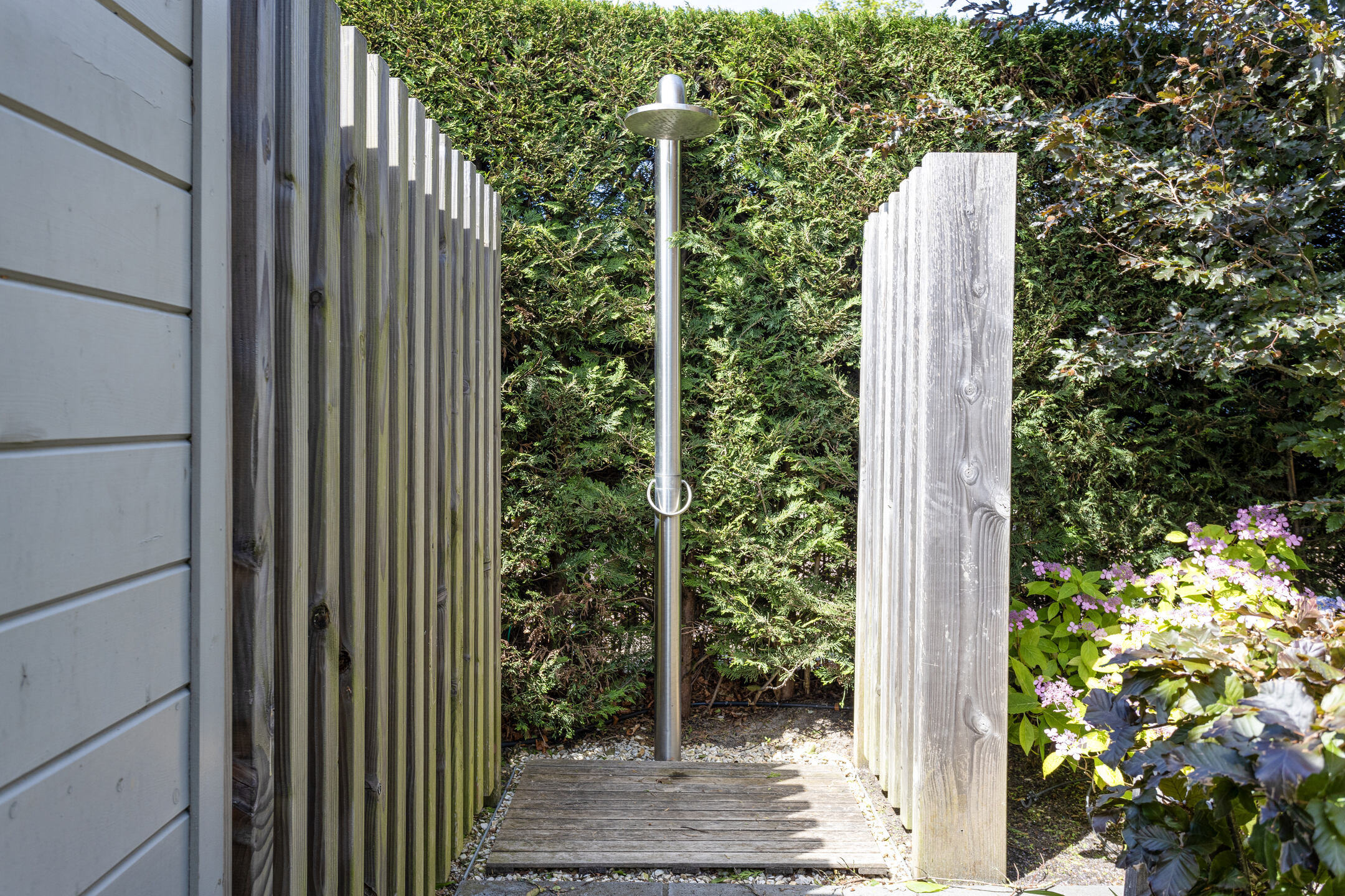 The beautifully landscaped garden has several terraces, grass, planters, flower borders, hedges and an outdoor shower. The spacious terrace facing the living room (Z) has a large sunshade. The garden is surrounded by a beautiful green hedge and can be closed with an electrically operated ornamental fence, which not only provides privacy but also extra security.