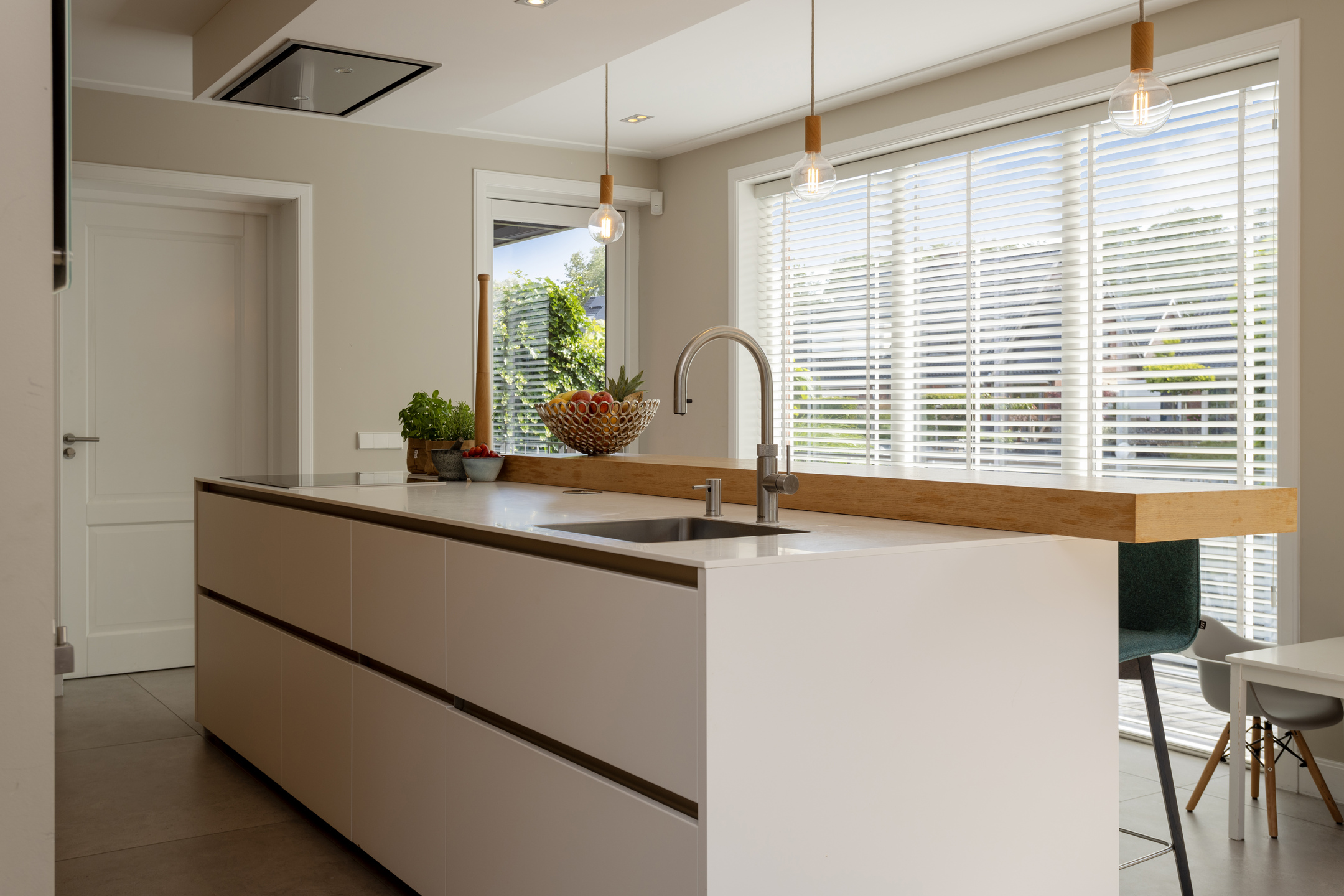Upon entering there is a generous bright entrance with beautiful staircase and toilet room. Through the steel door we enter the generous, very bright living room with work corner and French doors to the beautiful garden. At the rear of the house is a large modern kitchen with cooking/sink island and breakfast bar; plenty of space for cozy dinners with friends and family. Again, large windows provide an abundance of light. A utility room is of course not missing; this is also where the washing equipment is located.