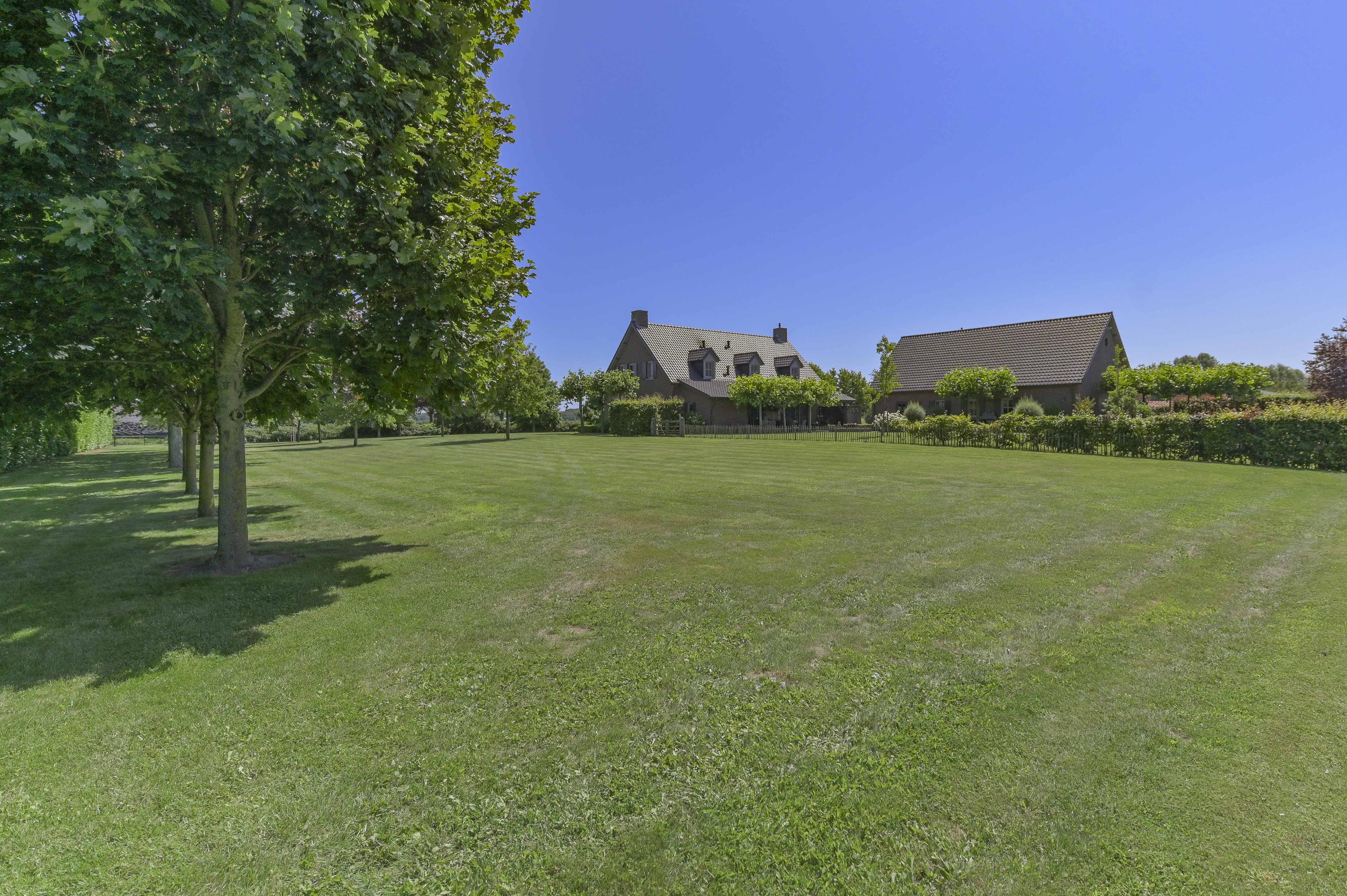 The villa sits on a large plot of 8,832 m² with a beautifully landscaped garden surrounding the house. Expansive lawns, fruit trees and mature plantings create a lush, green setting. At the front, the view stretches across meadows and the river.