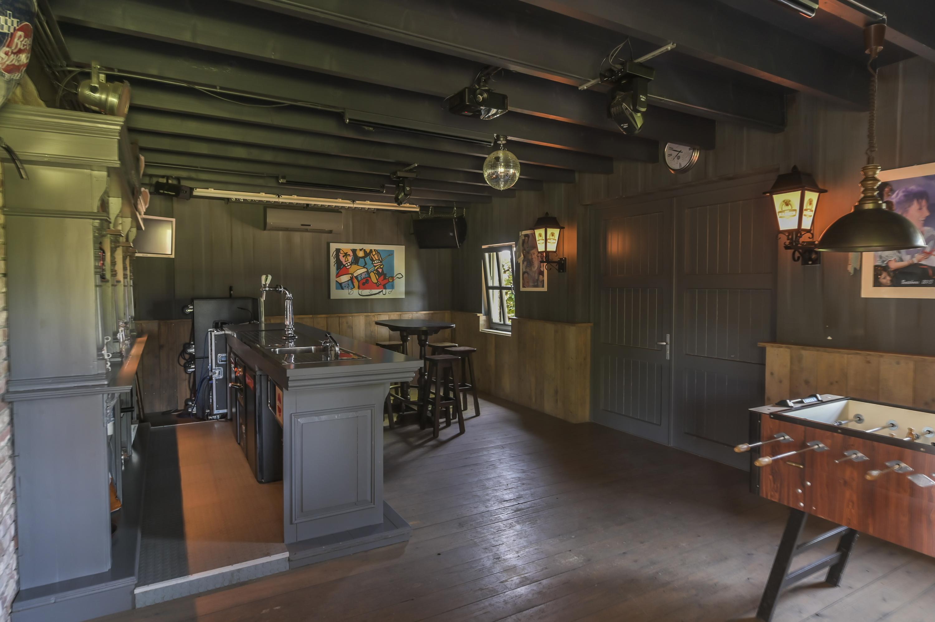 The exceptionally spacious garage provides room for multiple cars and is fully insulated. It features a separate boiler, electric sectional door, pedestrian door, toilet, and mezzanine with window. The high ceiling offers multiple possibilities. At the rear, part of the garage has been converted into a private bar with wooden flooring and air conditioning. French doors open directly to the garden.