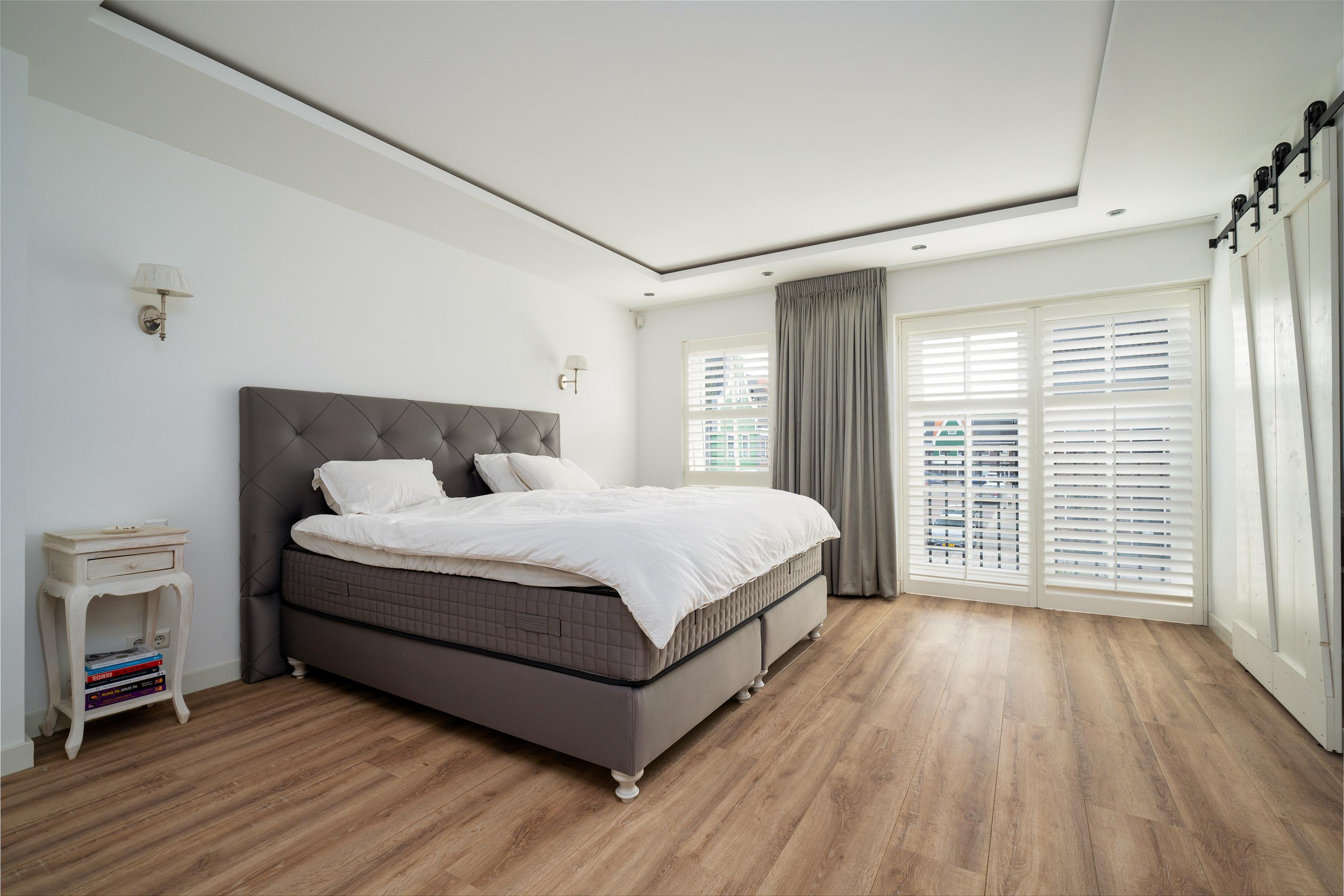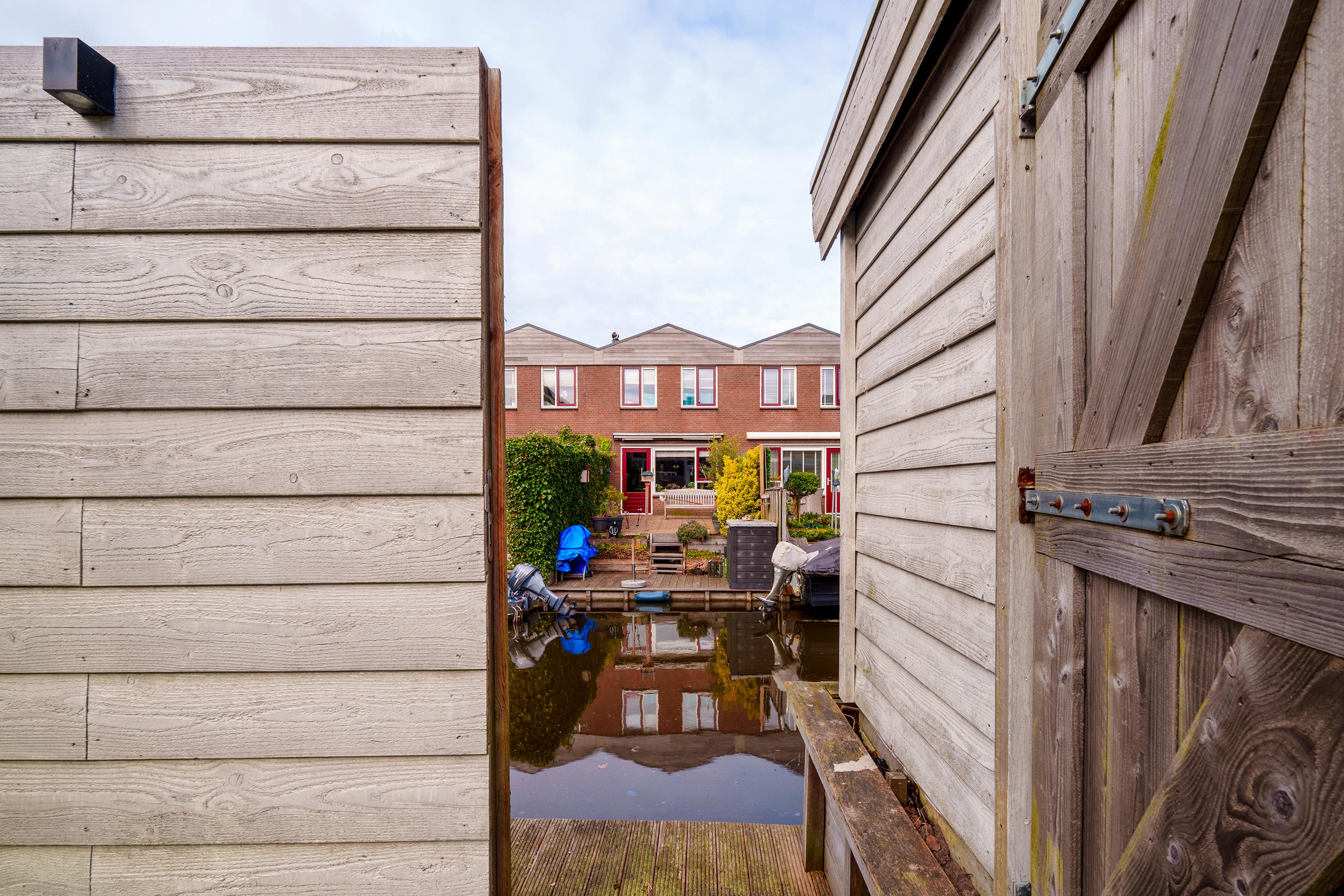 The living room at the garden side is cozy, with a striking cinewall and fireplace. From here, you walk through the double doors into the garden with a very large porch. Perfect for long evenings and outdoor gatherings on the terrace. Built-in trampoline and a swing for the kids. With a glass of wine in hand, you can keep a (small) eye on things. The garden cushions and those of your sloop can be neatly stored in the wooden shed. And that sloop? You simply moor it directly behind the house. On a beautiful summer day, you can sail straight to Amsterdam.
