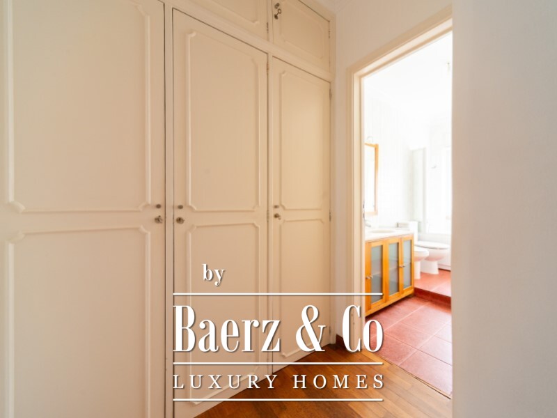 The three bedrooms offer distinct and versatile features: one with a built-in bookcase, another with a wardrobe, and the third with an enclosed sunroom and built-in storage cabinets. There is also a large closet for household linen, two full bathrooms, and a balcony.