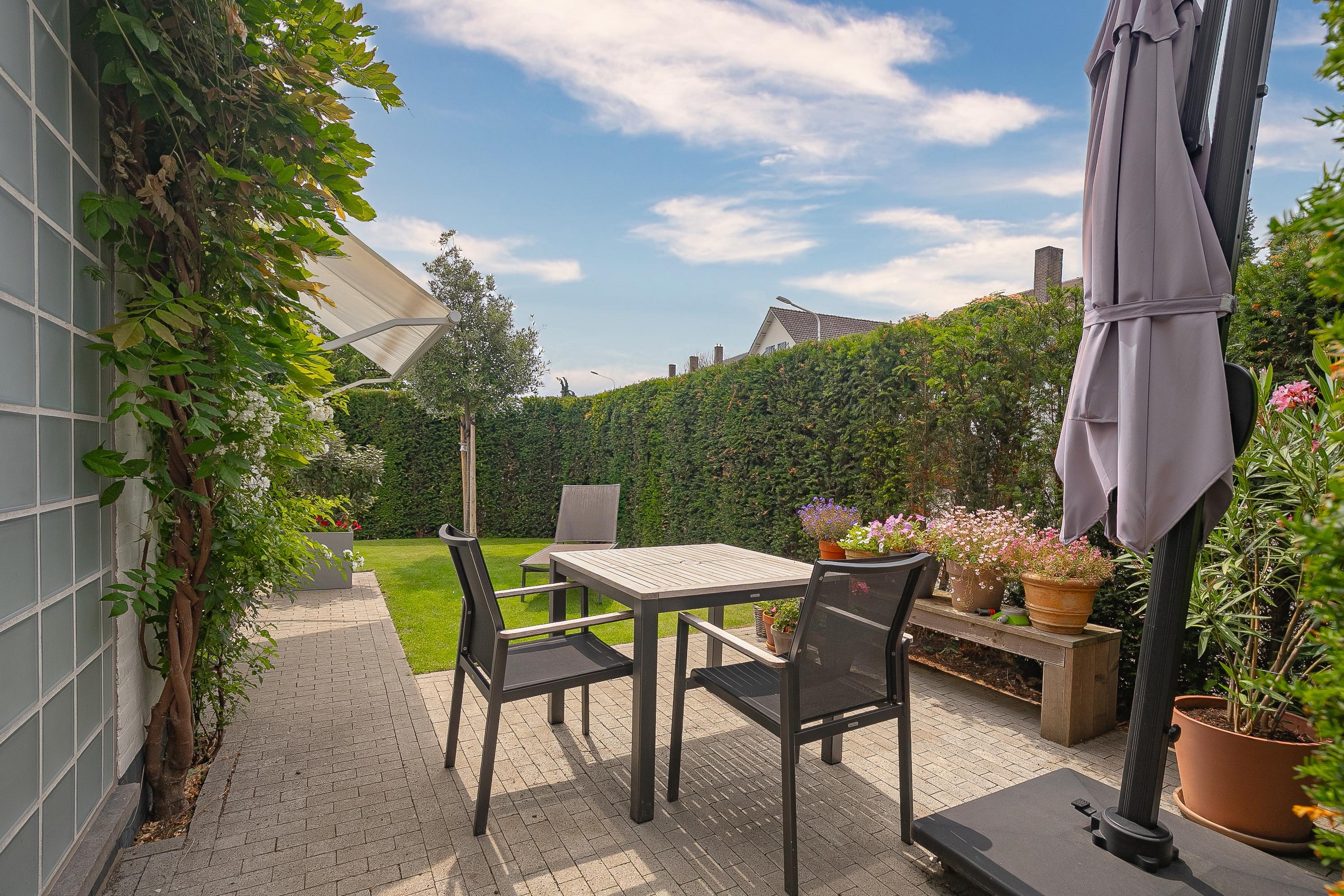 The beautifully landscaped and enclosed city garden faces northeast and offers plenty of privacy. Thanks to the awning, the garden forms a natural extension of the living space. At the front is an attractive front garden with evening sun. The back garden also has a practical external storage room of approx. 5.3 m². The garden also has a back entrance.