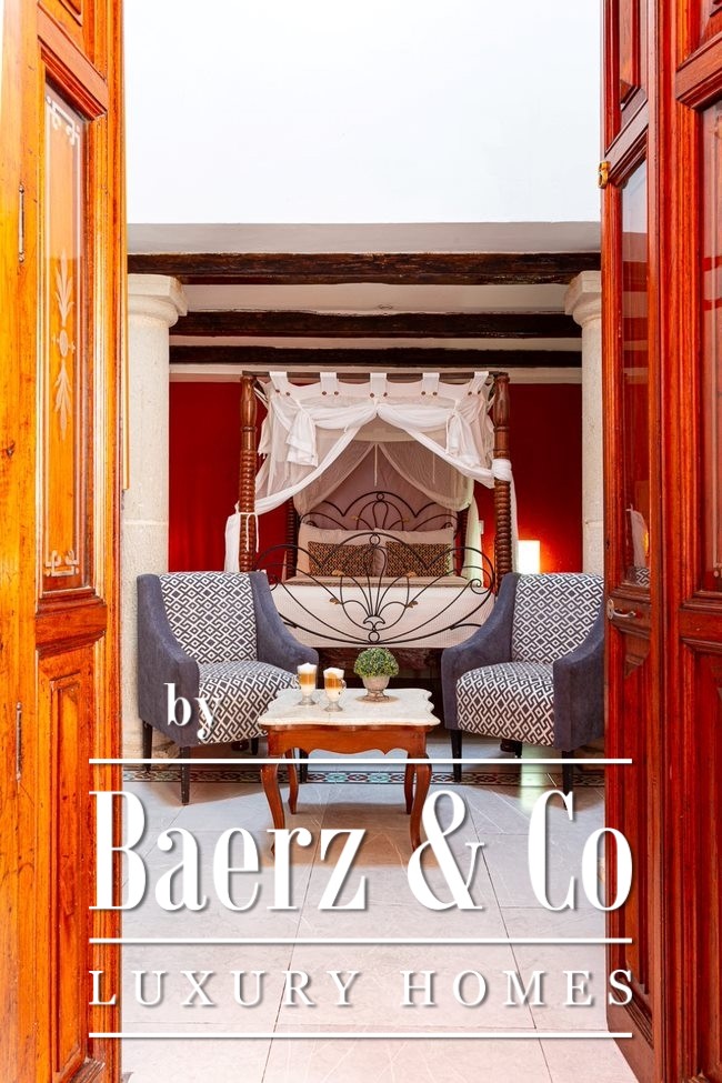 Within 1,264 m² of interior living space, the property arranges 12 bedrooms and 16 bathrooms across a historic mansion footprint of 935 m², providing a spatial rhythm that balances privacy and hospitality. Solar panels and an automatic retractable awning have been recently installed above the main patio, bringing subtle efficiency to the grandeur of its central courtyard.