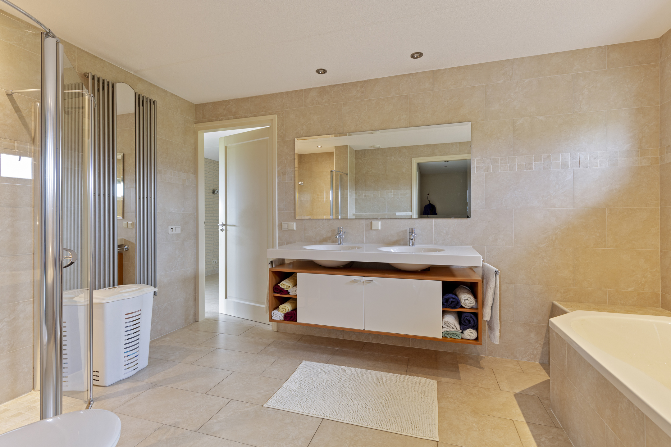 The master bedroom is at the head at the rear and has a beautiful view of the garden and the ash tree. Next to the room a large bathroom, complete with WC, double sinks, a shower with seat and a wonderful whirlpool. For your wardrobe there is a spacious walk-in closet.