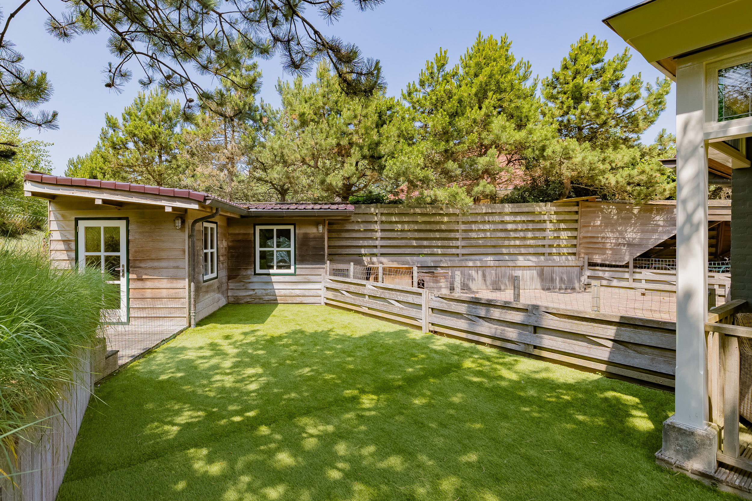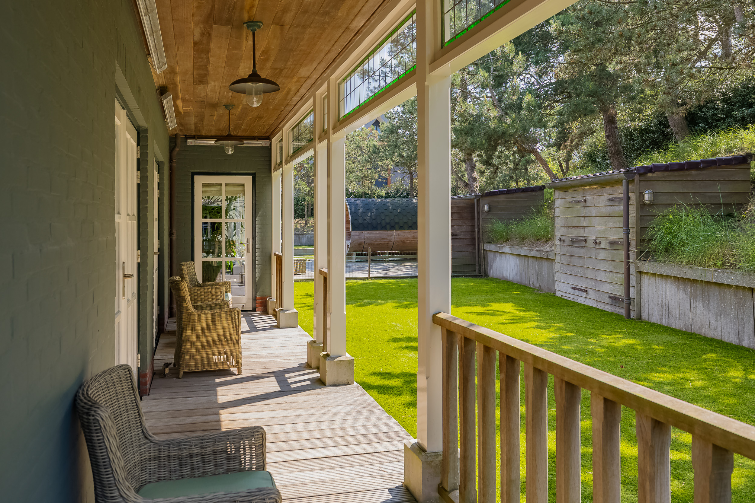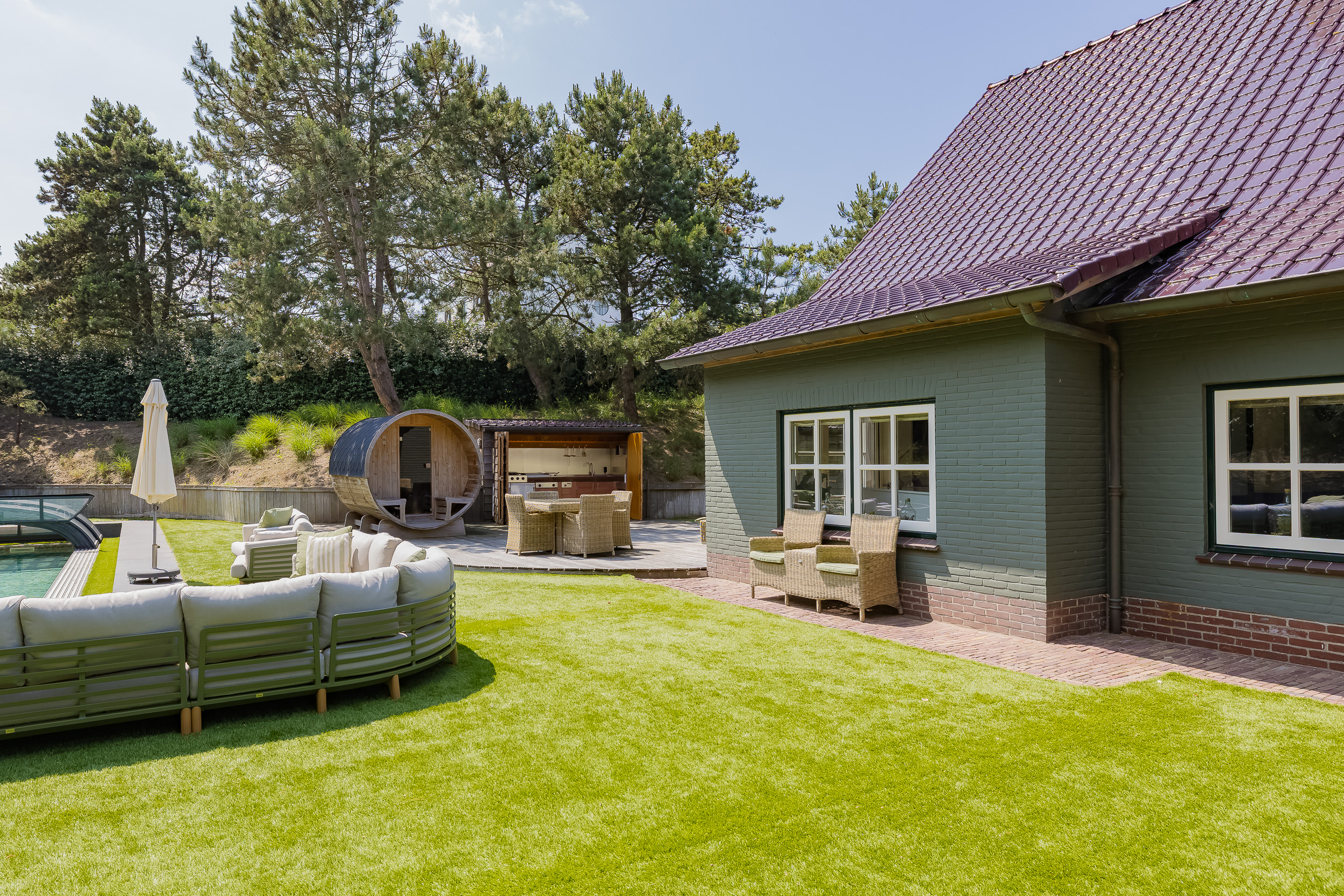 The plot is thoughtfully designed with natural, sustainable materials: from the garage path in old bricks to the Red Cedar garden houses, shed and gym. Everything is designed to blend stylishly into the natural environment. The garden offers absolute privacy.
