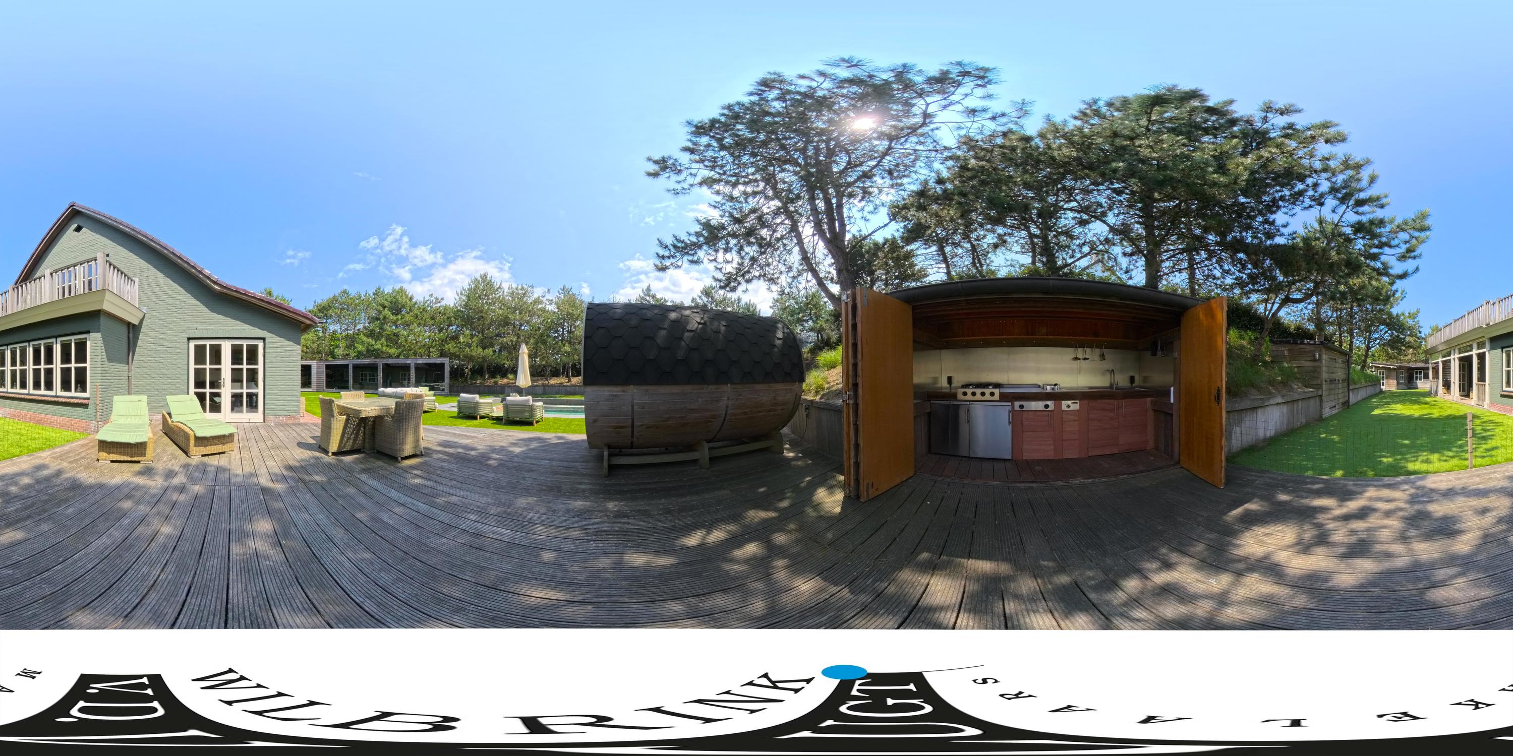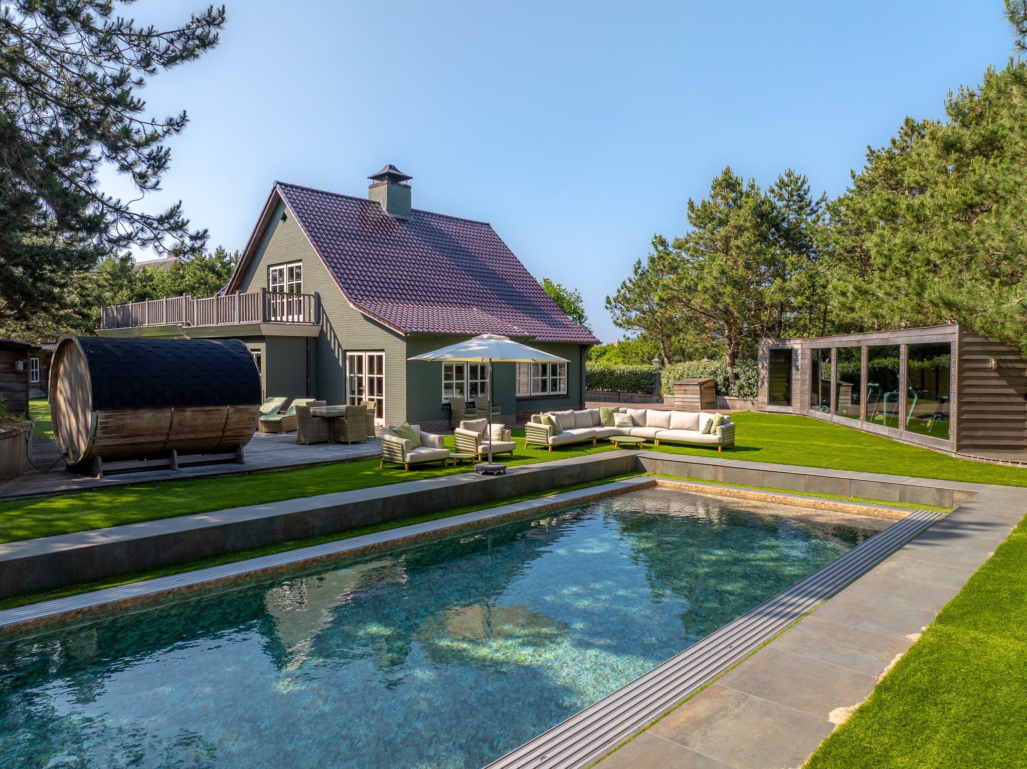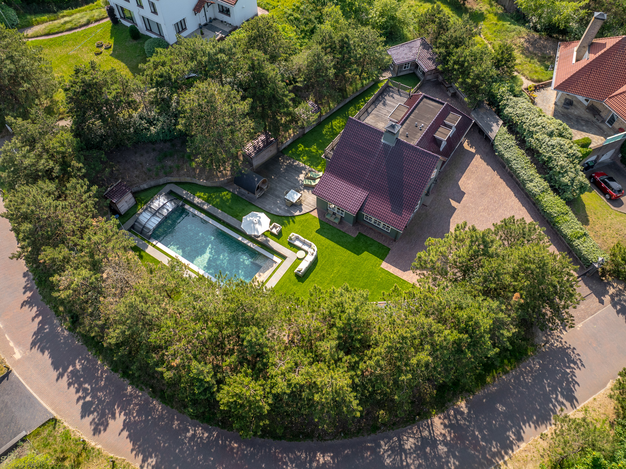 The plot is thoughtfully designed with natural, sustainable materials: from the garage path in old bricks to the Red Cedar garden houses, shed and gym. Everything is designed to blend stylishly into the natural environment. The garden offers absolute privacy.