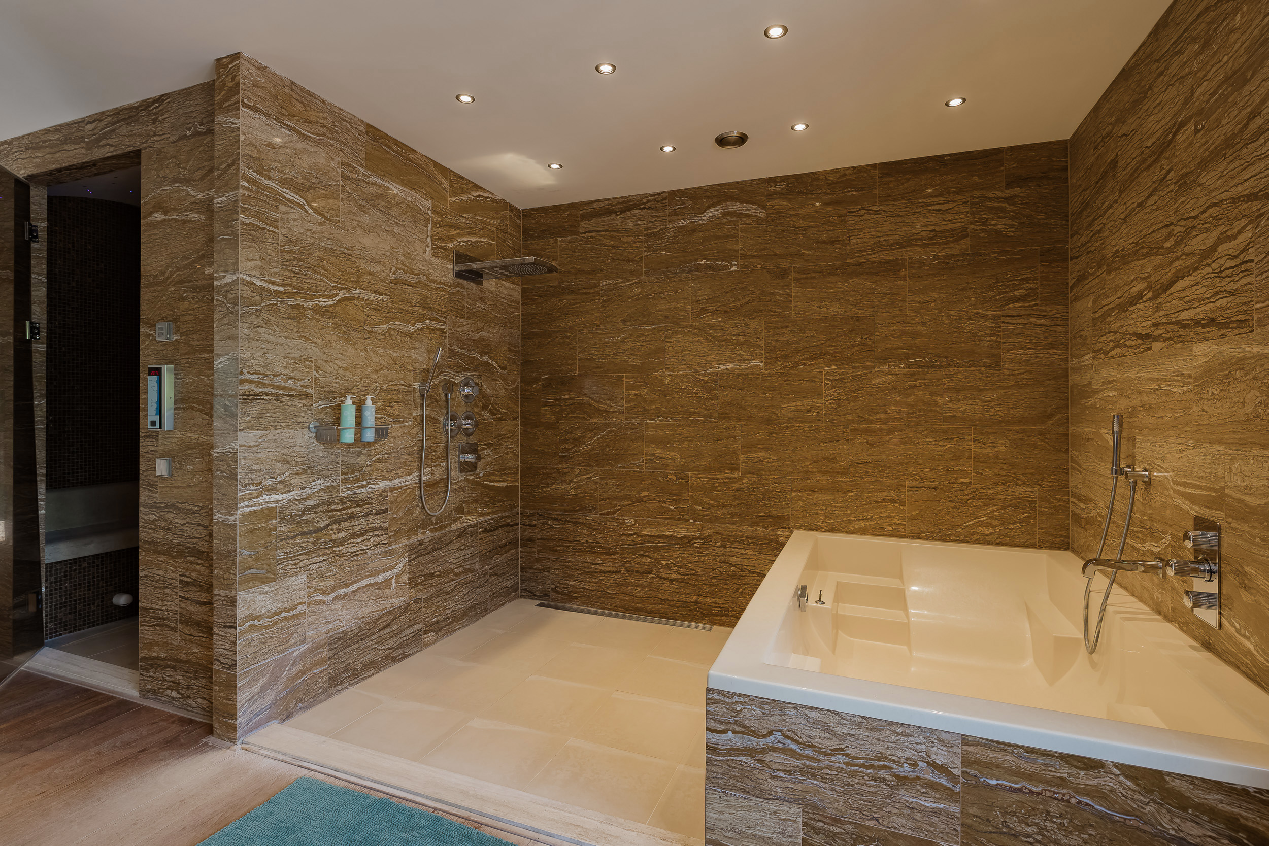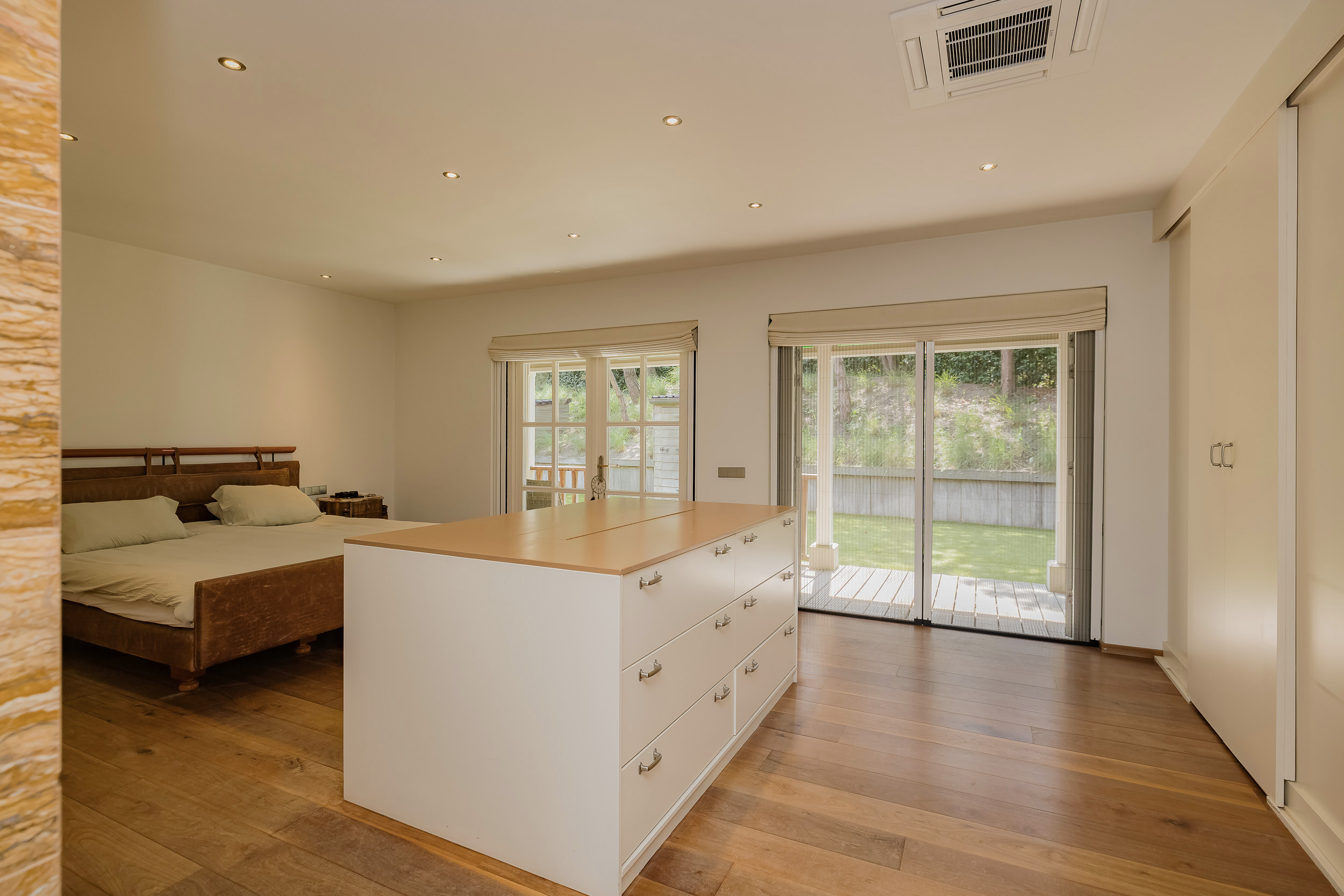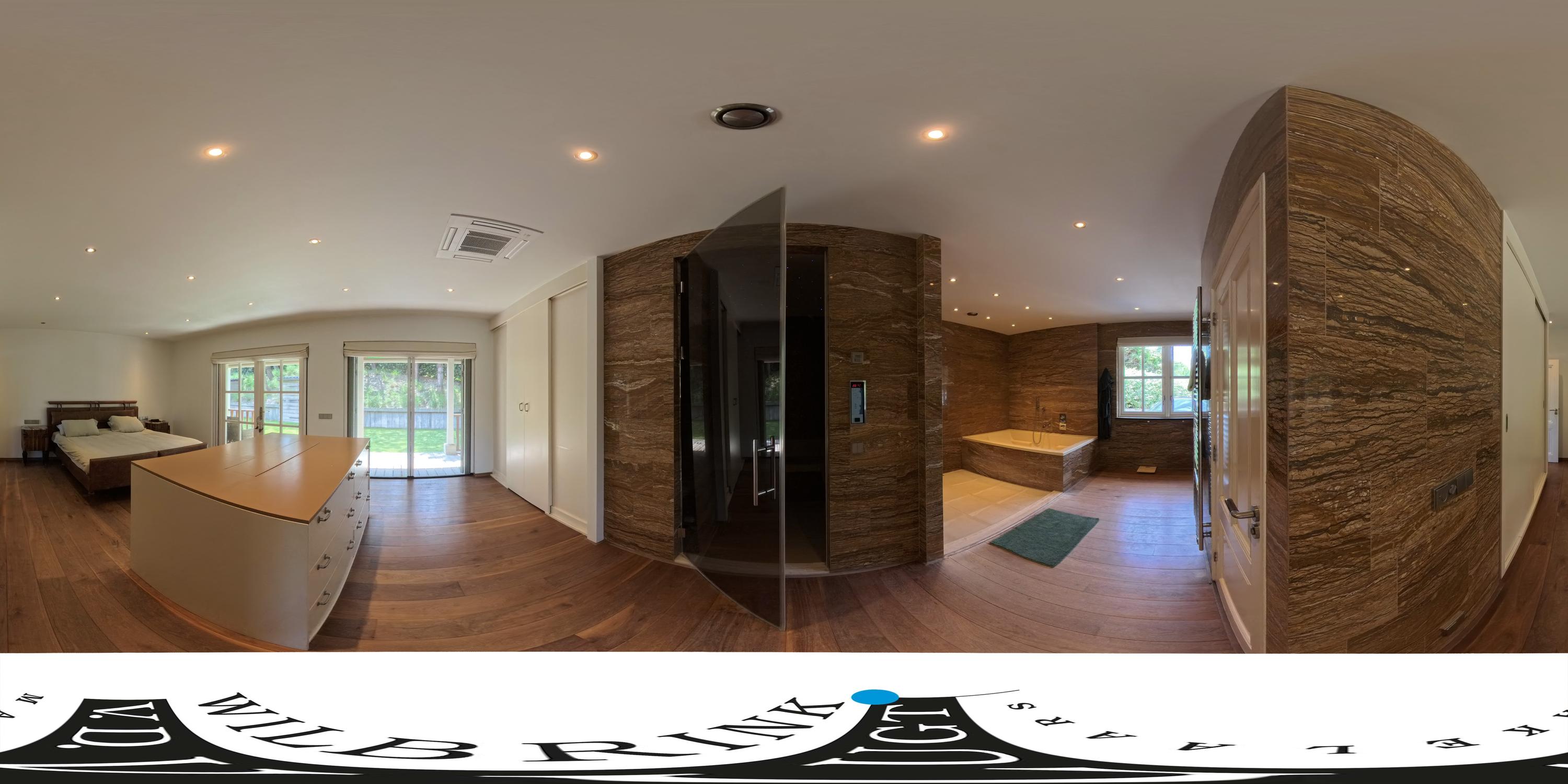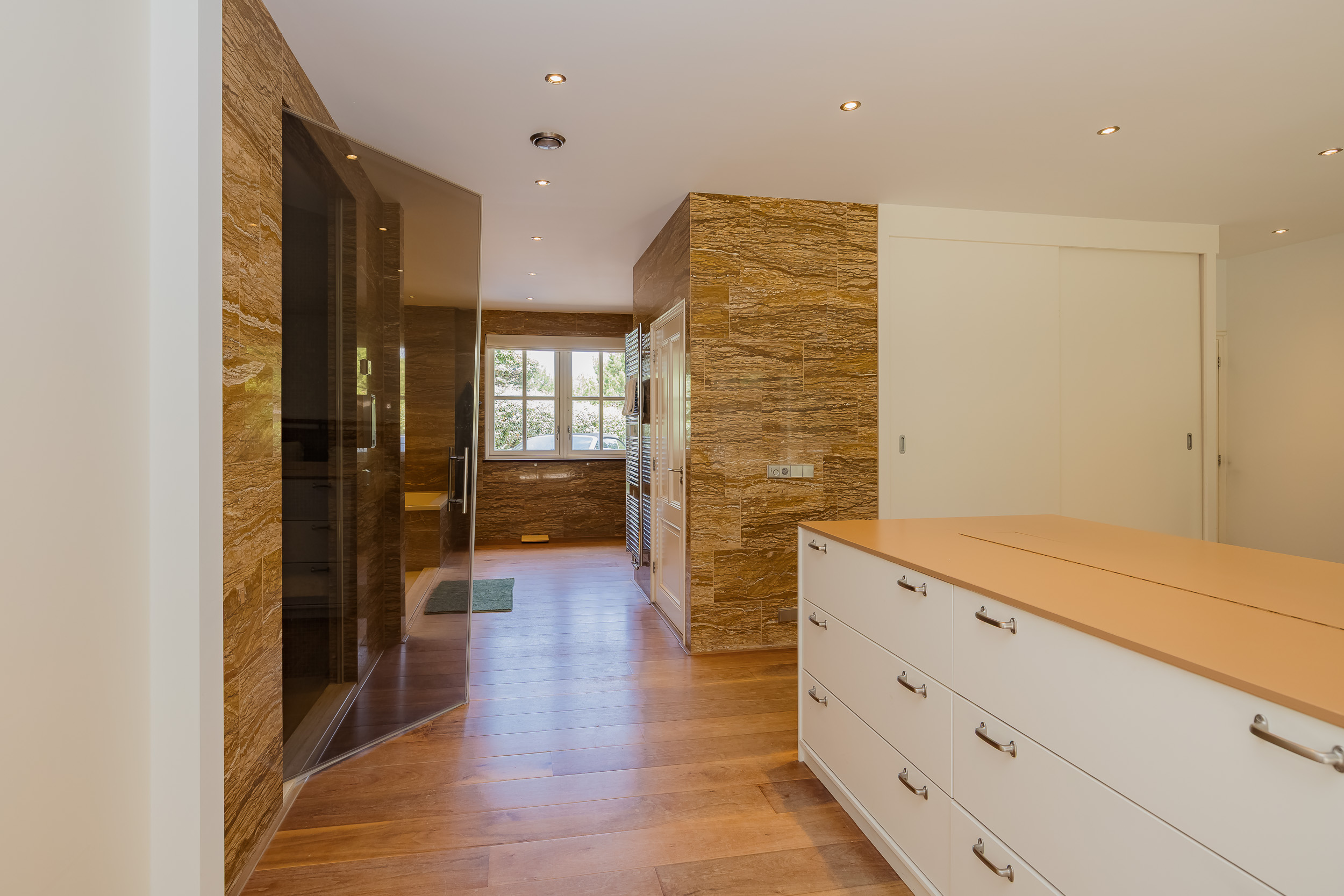 The ground floor bedroom forms its own wing, including a luxurious bathroom with marble tiles in warm terra tones, a walk-in shower with massage functions, a steam room with starry sky and double sinks with unique leather wash basins. The room has a fine walk-in closet and plenty of closet space. The custom-made TV cabinet with elevator completes the feeling of comfort and luxury. From the bedroom you step right onto the beautiful porch with heaters and lighting - a place where inside and outside blend seamlessly.