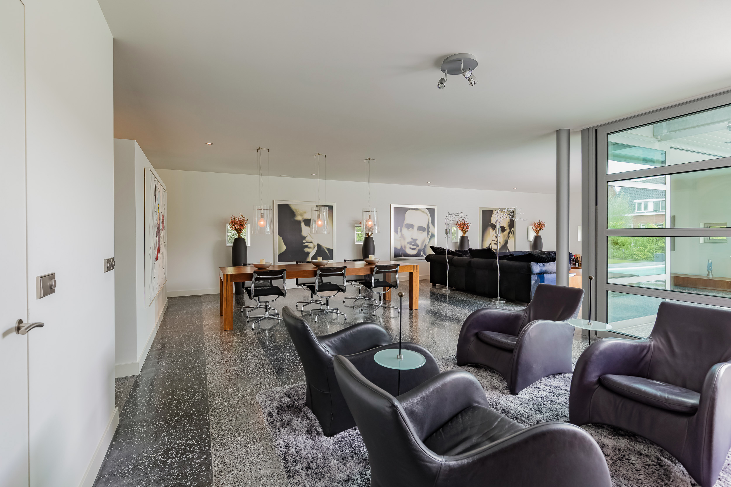 The indoor garage of 76 m2 is fully insulated and also here the terrazzo floor has floor heating. The glass inner wall is easily removed so that the entire first floor becomes one space. The living area thus comes to 356m2 (€ 7.008,43 m2)