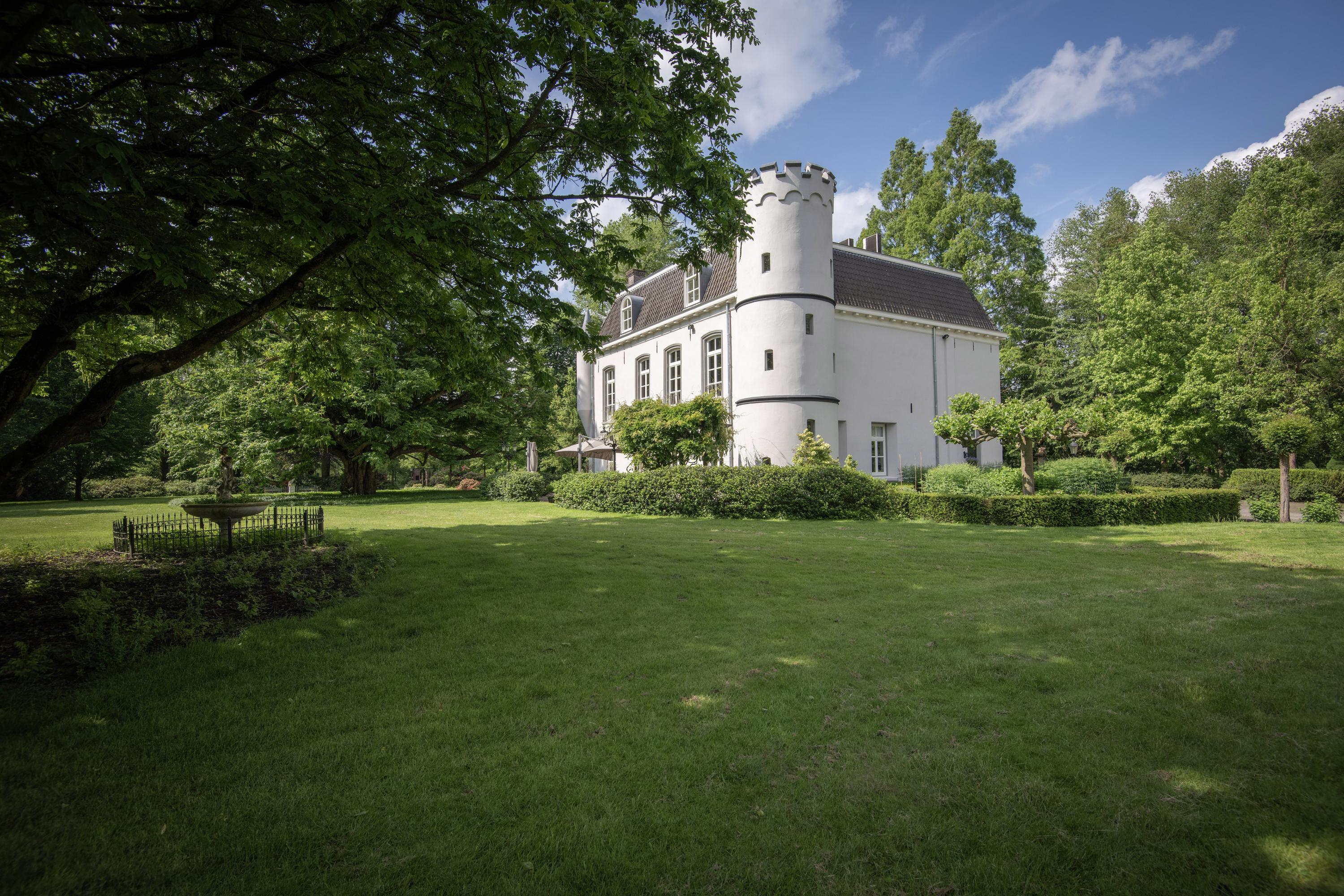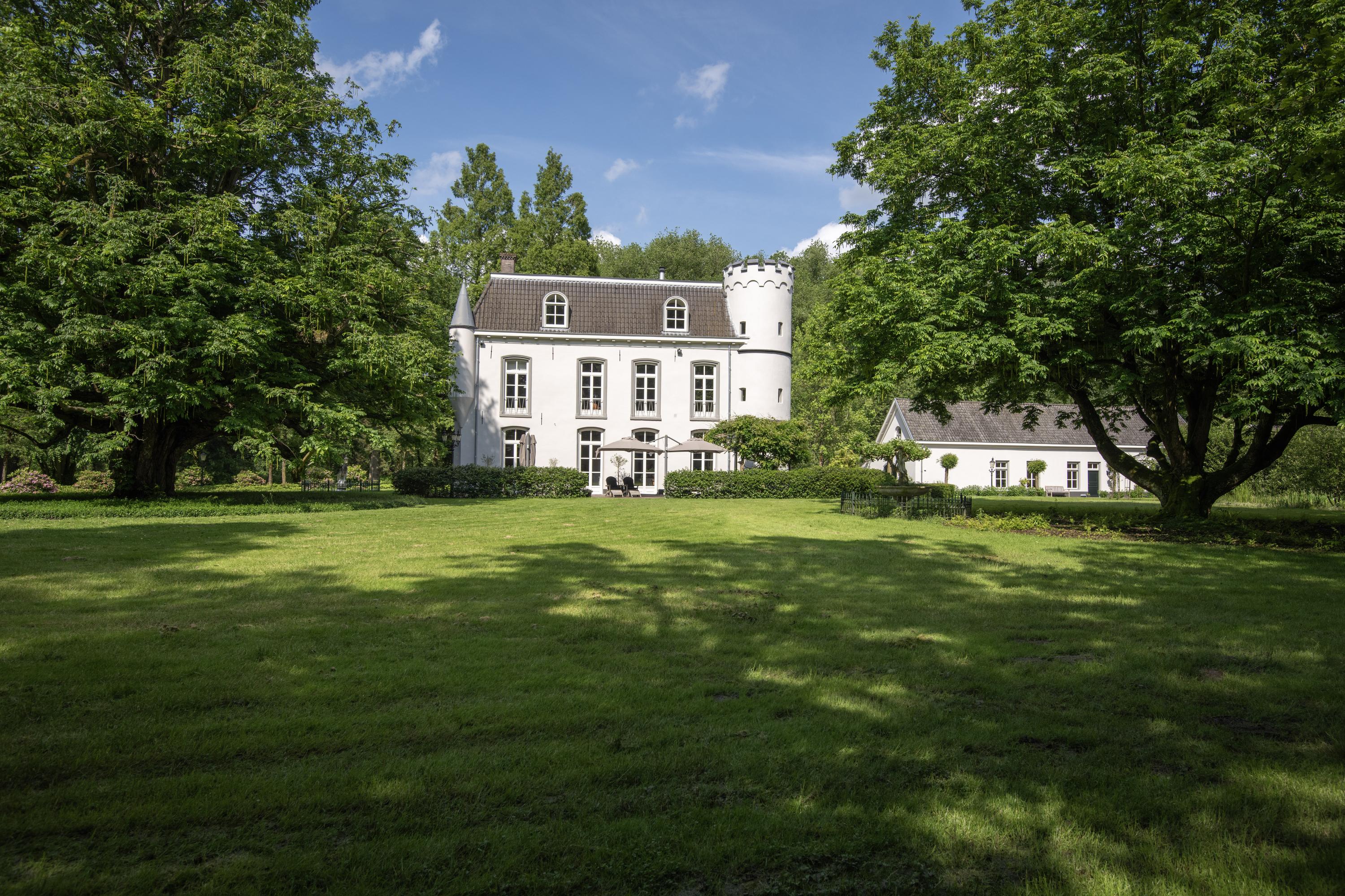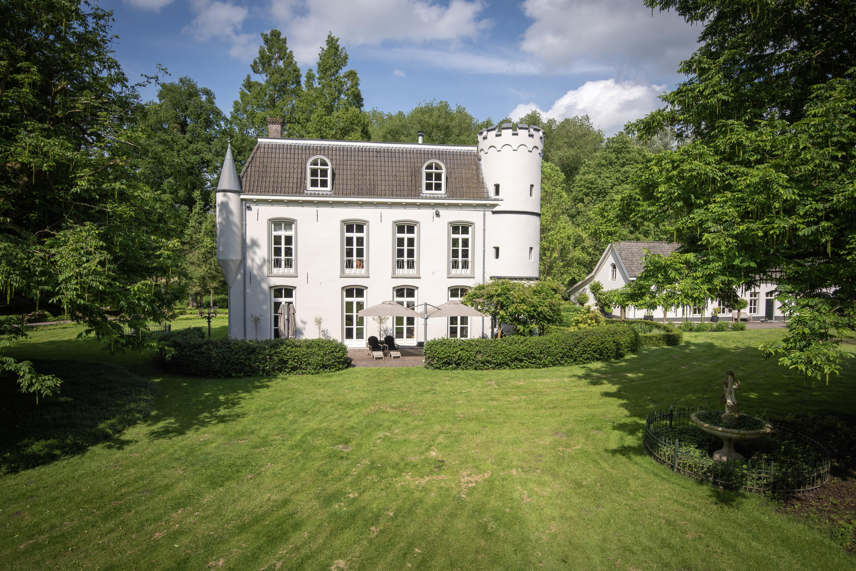 The manor house is characterised by white rendered façades, hipped roofs, corner turrets and one round corner tower with battlements. Although the original year of construction cannot be determined precisely, its history dates back to approximately 1864. In 1998, the manor house was largely destroyed by fire and subsequently rebuilt with great craftsmanship, care and attention, and fully renovated, modernised and made more sustainable. Among other features, the presence of 40 solar panels and two heat pumps has resulted in an exceptional A+ energy label.