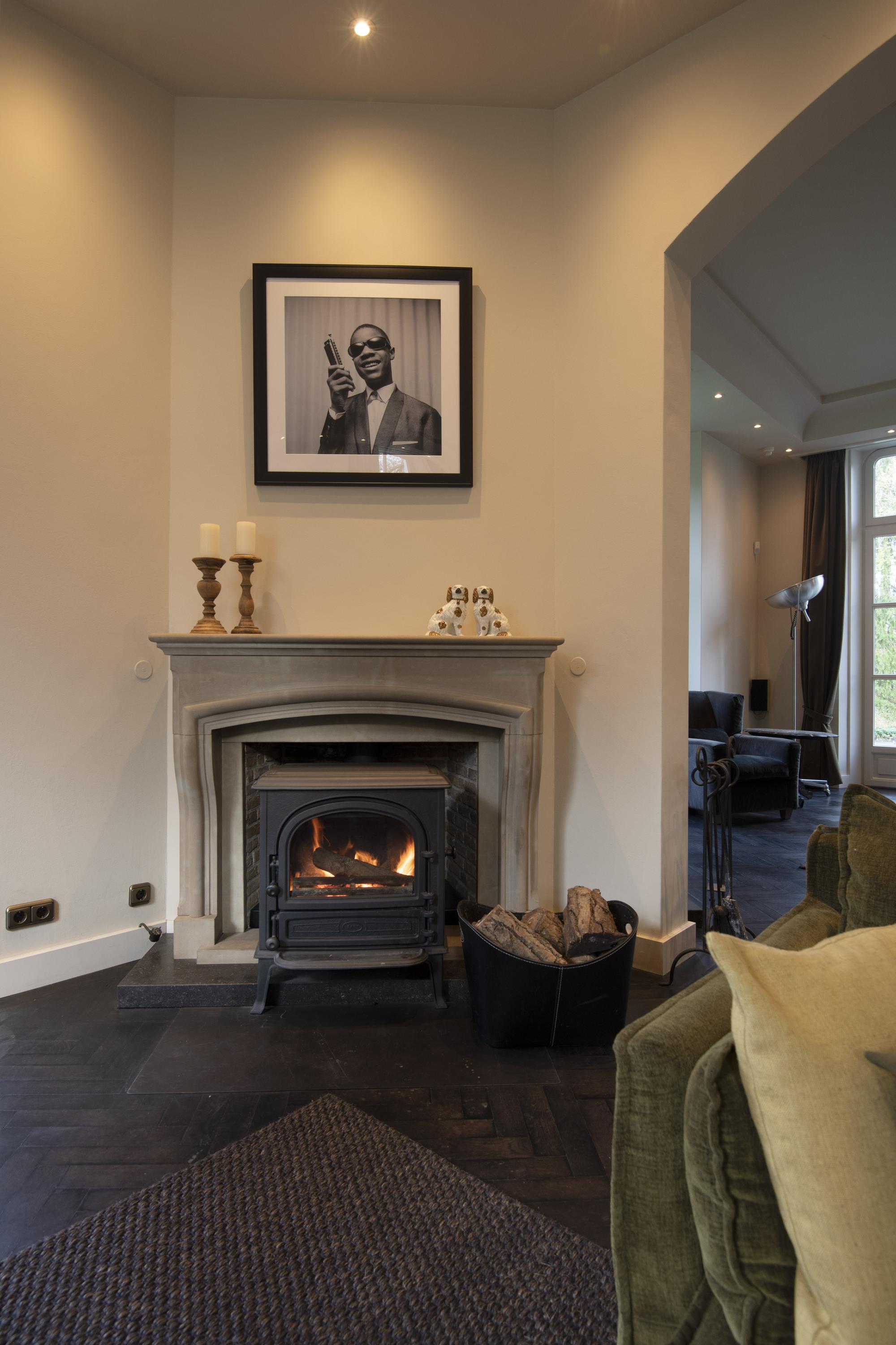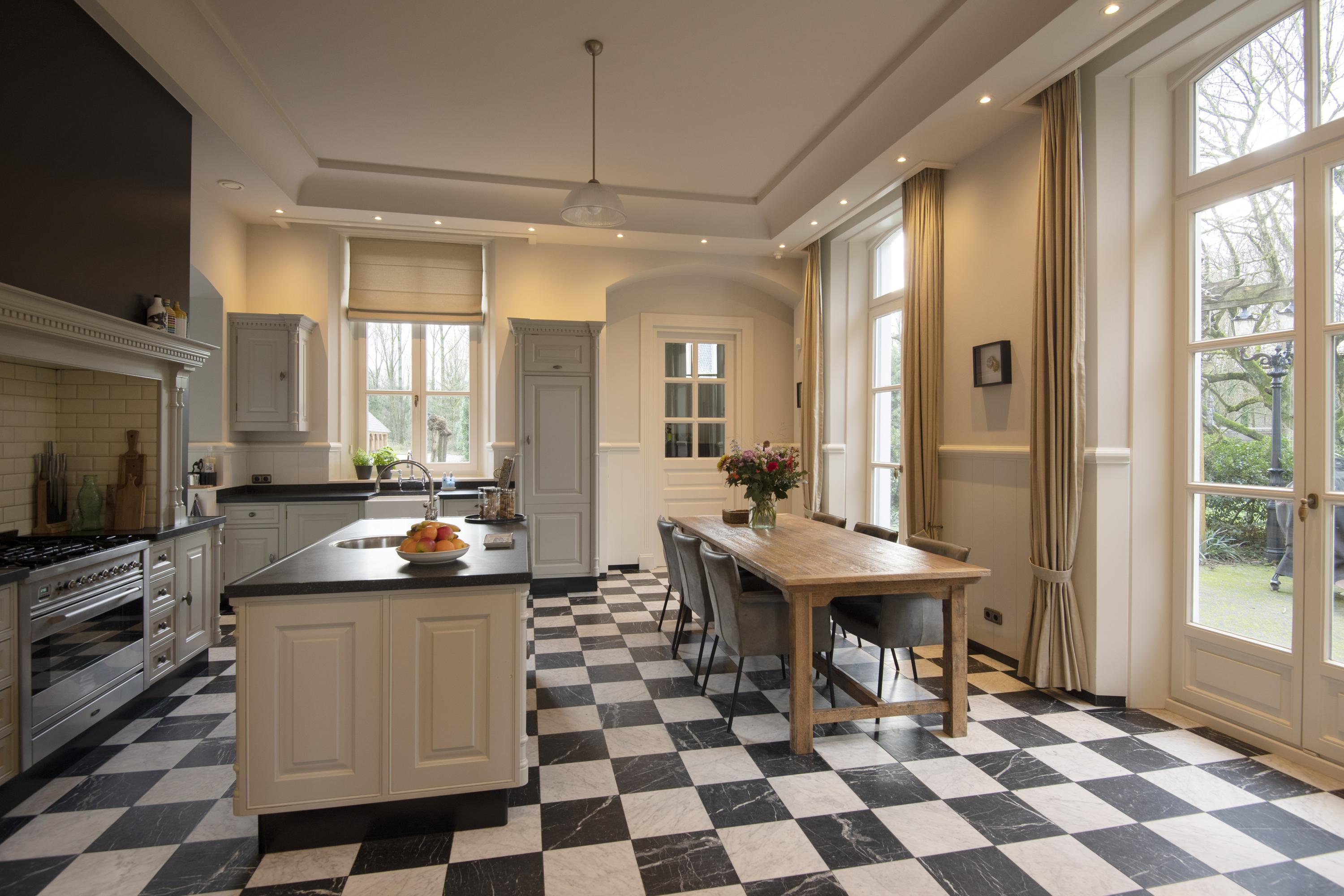 The completely nature-oriented living room consists of a sitting room and a dining room. There are two fireplaces and four pairs of French doors to the garden. The 3.60m high stucco ceilings combined with the amount of light through the high windows create a magnificent spatial experience. Double doors lead into the cozy eat-in kitchen. This fully equipped kitchen is furnished with a classic Tinello kitchen unit with a natural stone worktop, sink island and high-quality appliances. In the tower adjacent to the kitchen diner is a pantry. In the living kitchen are two pairs of double doors to the garden. The entire first floor has underfloor heating.