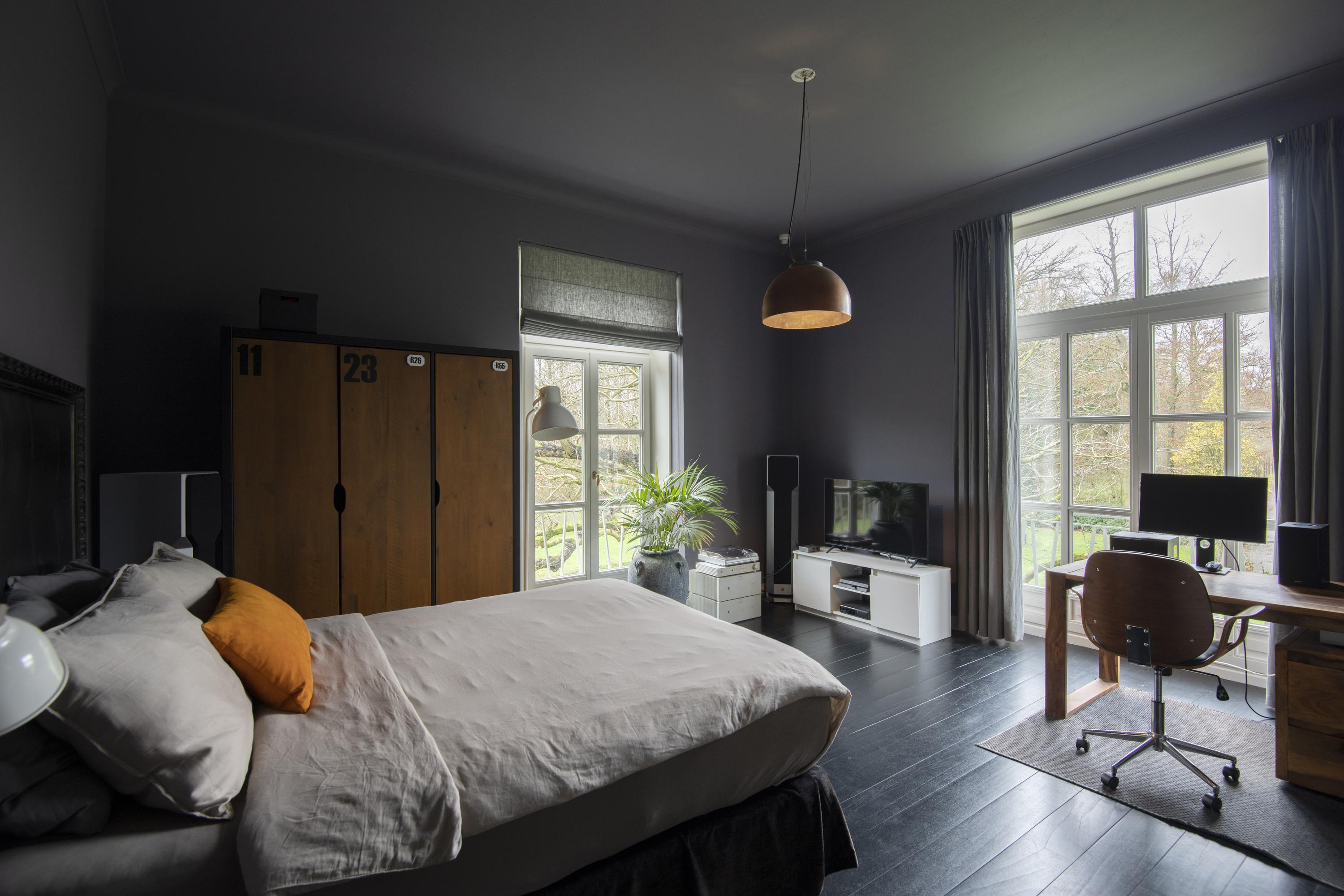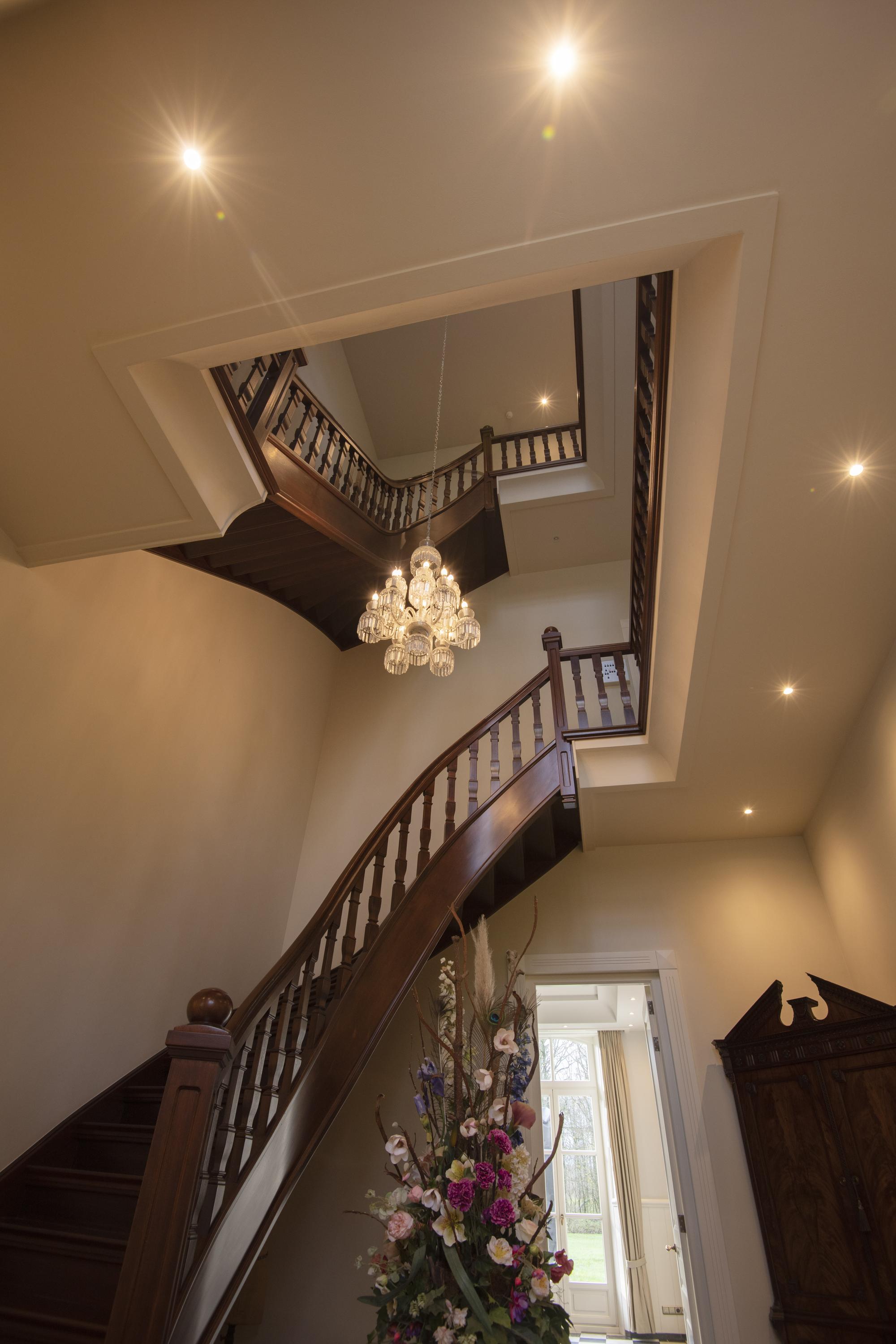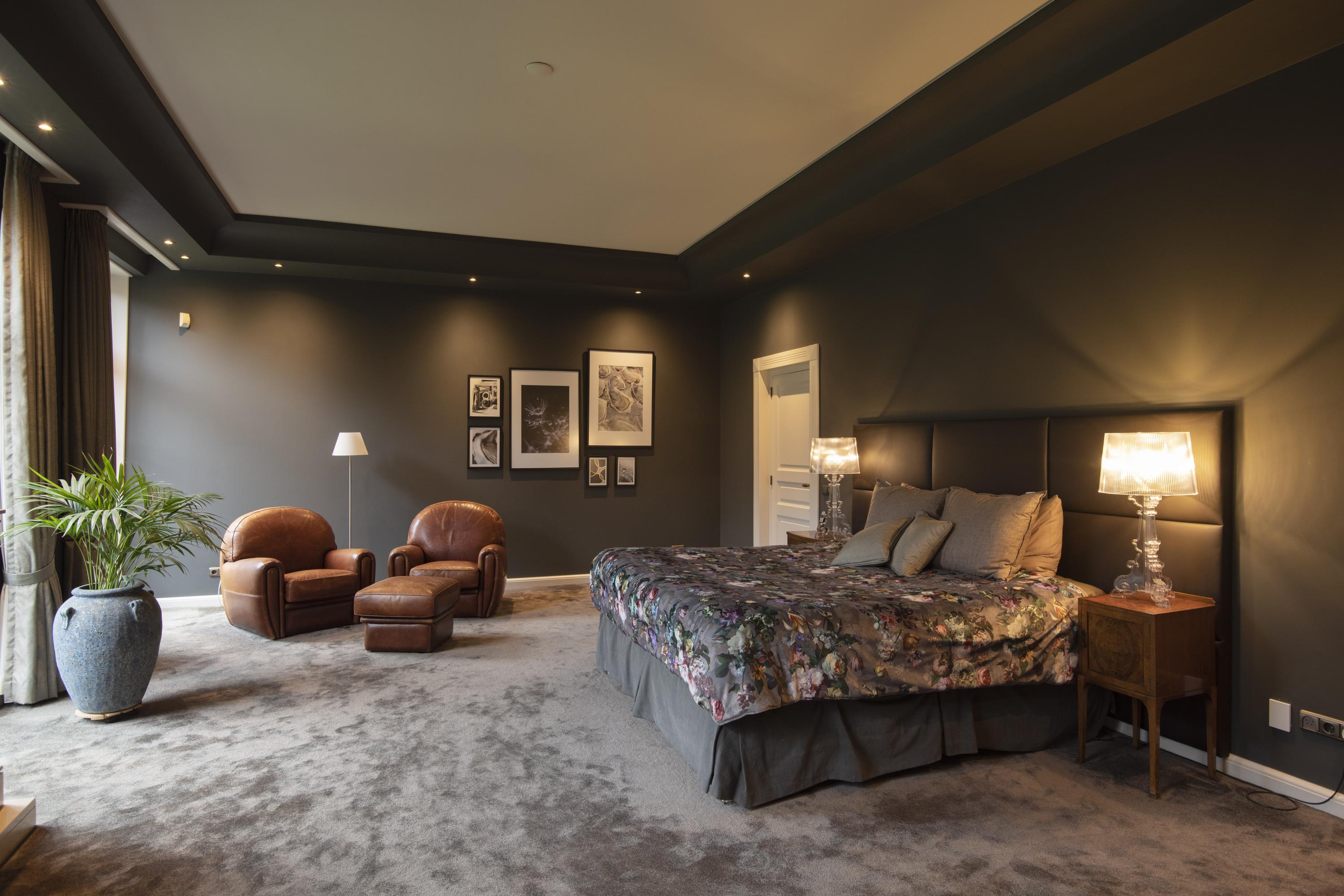 The imposing staircase leads to the second floor. The eye-catcher on this floor is the suite; a nature-oriented bedroom of 45 m2 with high stucco ceiling, three pairs of double doors to the French balconies, an adjoining dressing room and private bathroom. From this suite is also access to the tower where there is space for a shoe collection if desired. On this floor are two more bedrooms, also with French balconies. Between these bedrooms is the 2nd bathroom with double sink vanity, walk-in shower and toilet. On the landing is another separate 2nd toilet. The floor in the suite is covered with luxury carpet and the floors of the other two bedrooms are covered with parquet. This floor is also fully equipped with underfloor heating.
