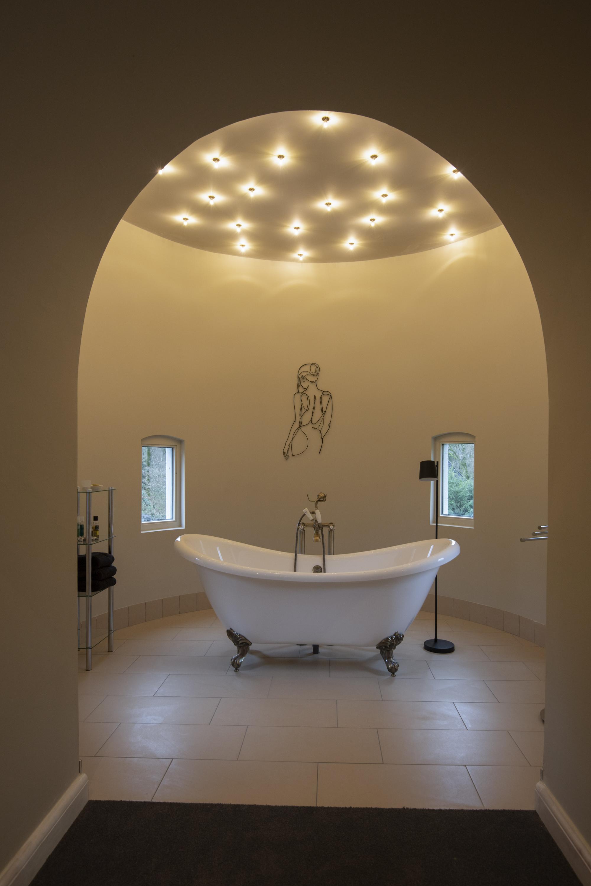 Landing with toilet, guest bedroom cum relaxation room with adjacent spa with walk-in shower, sauna and bathtub under the excellently insulated high roof on the second floor.