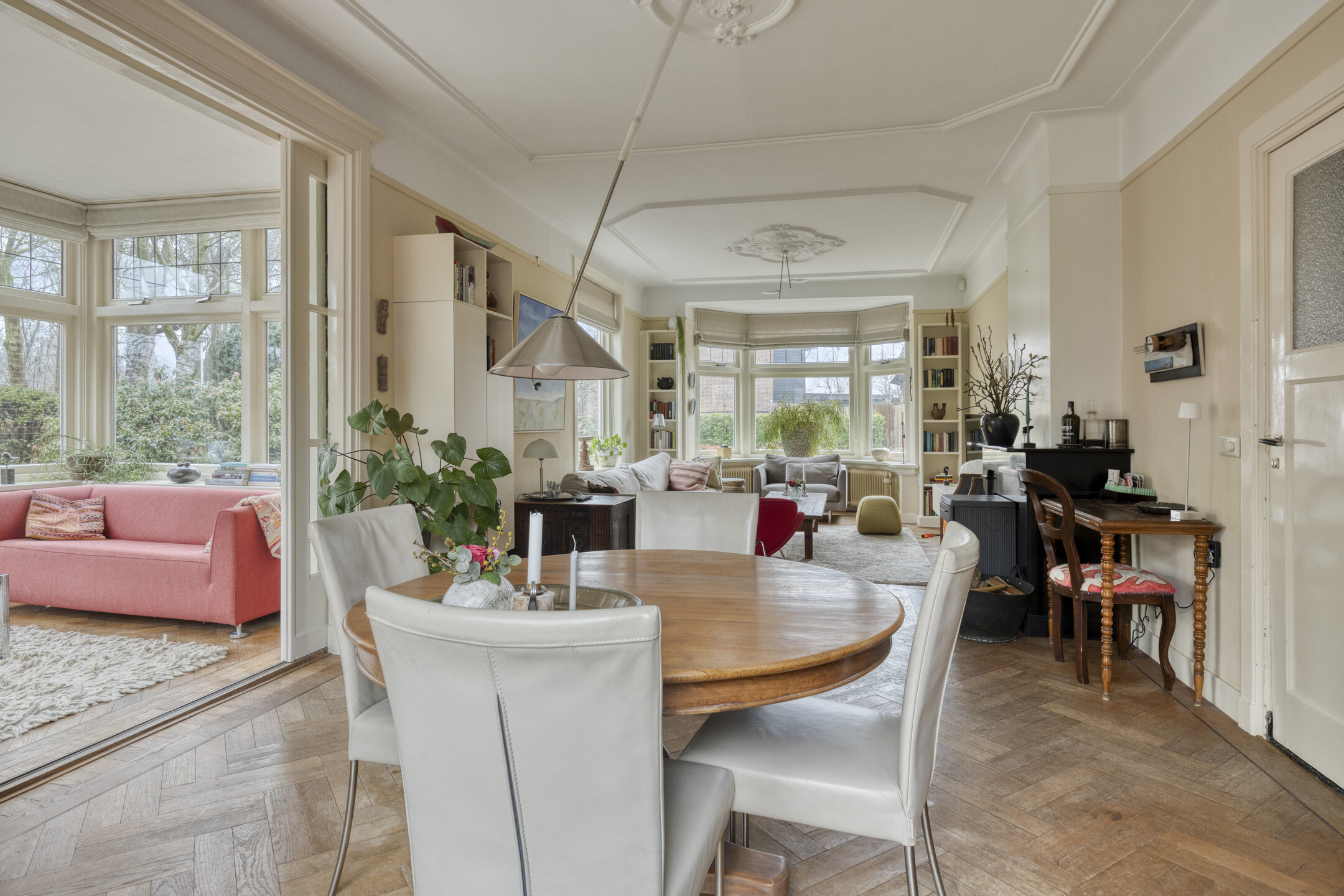 De ruime woonkamer heeft door de vele raampartijen en de karakteristieke erker een prachtige lichtinval. Vanuit de aangrenzende serre is er blijvend vrij uitzicht over het weiland. Zowel vanuit de woonkamer als vanuit de serre openen openslaande tuindeuren naar de royale tuin.