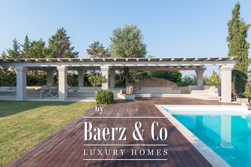 Throughout, interiors are shaped by understated luxury, merging timeless Mediterranean character with contemporary comfort. Striking wooden roof details and expansive aged marble floors create a tactile sense of elegance, while generous openings allow light to move freely across spacious reception areas. The living and dining areas flow out to broad terraces and wide balconies, perfectly framing panoramic sea views toward Spetses, Hydra, and the horizon beyond.