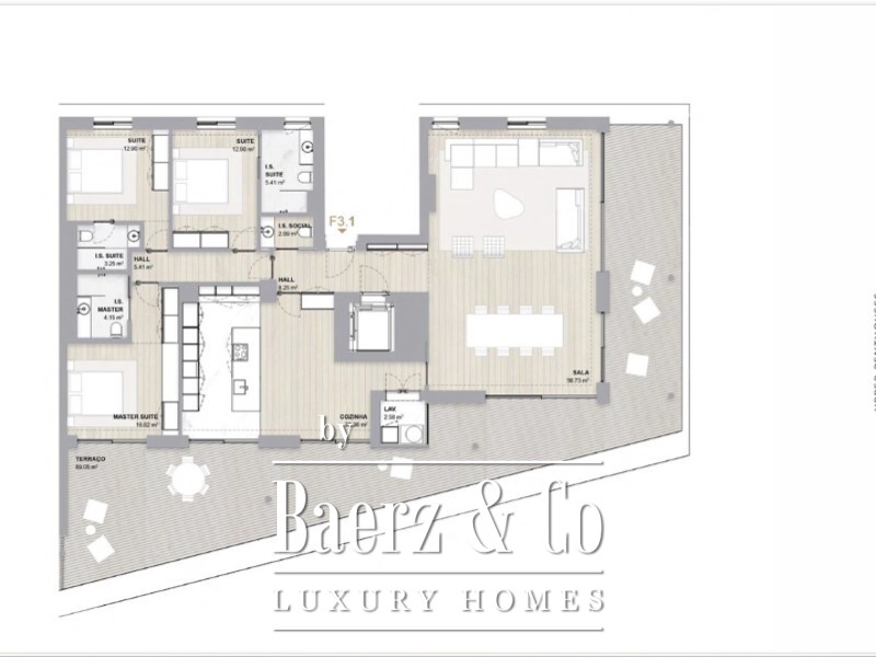 With 316 m² of living space, the apartment opens onto a generous 8 m² entrance hall, offering a graceful separation between the social and private zones. The main living room flows seamlessly towards an expansive 89 m² terrace, drawing natural light across 56.73 m² of gathering space. The design encourages an open connection between indoors and out, ideal for both morning reflection and evening gatherings. The kitchen, equipped with laundry, also grants direct terrace access, enhancing the rhythm of everyday living.