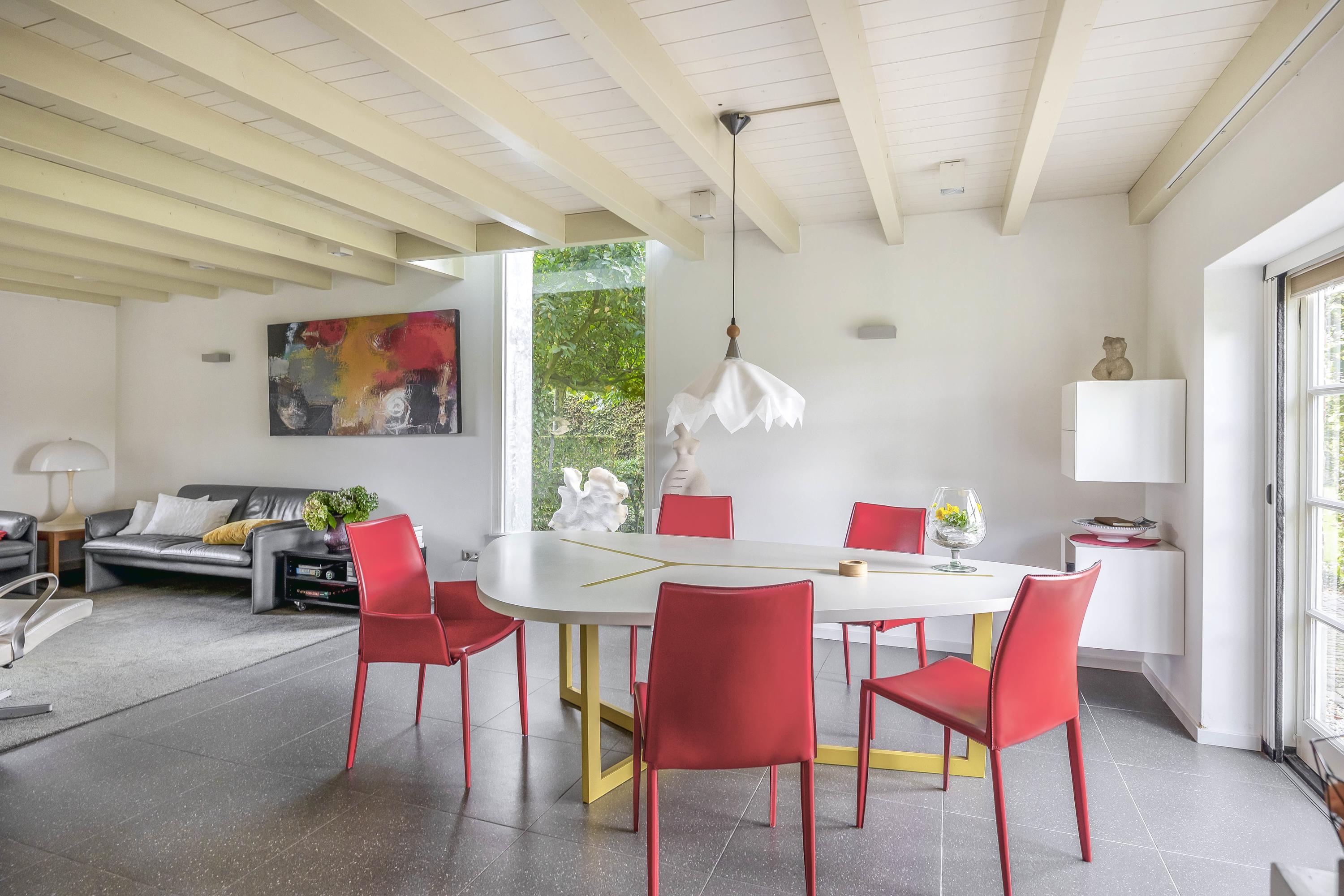 Double doors from the kitchen lead to the living room, which has a smooth, polished concrete floor with underfloor heating. The living room has stucco walls and a beautiful wooden beamed ceiling with attractive old oak beams. A large window at the front and double French doors at the rear offer a beautiful view of the garden. Here too, a wood-burning stove has been installed for extra warmth and cosiness.