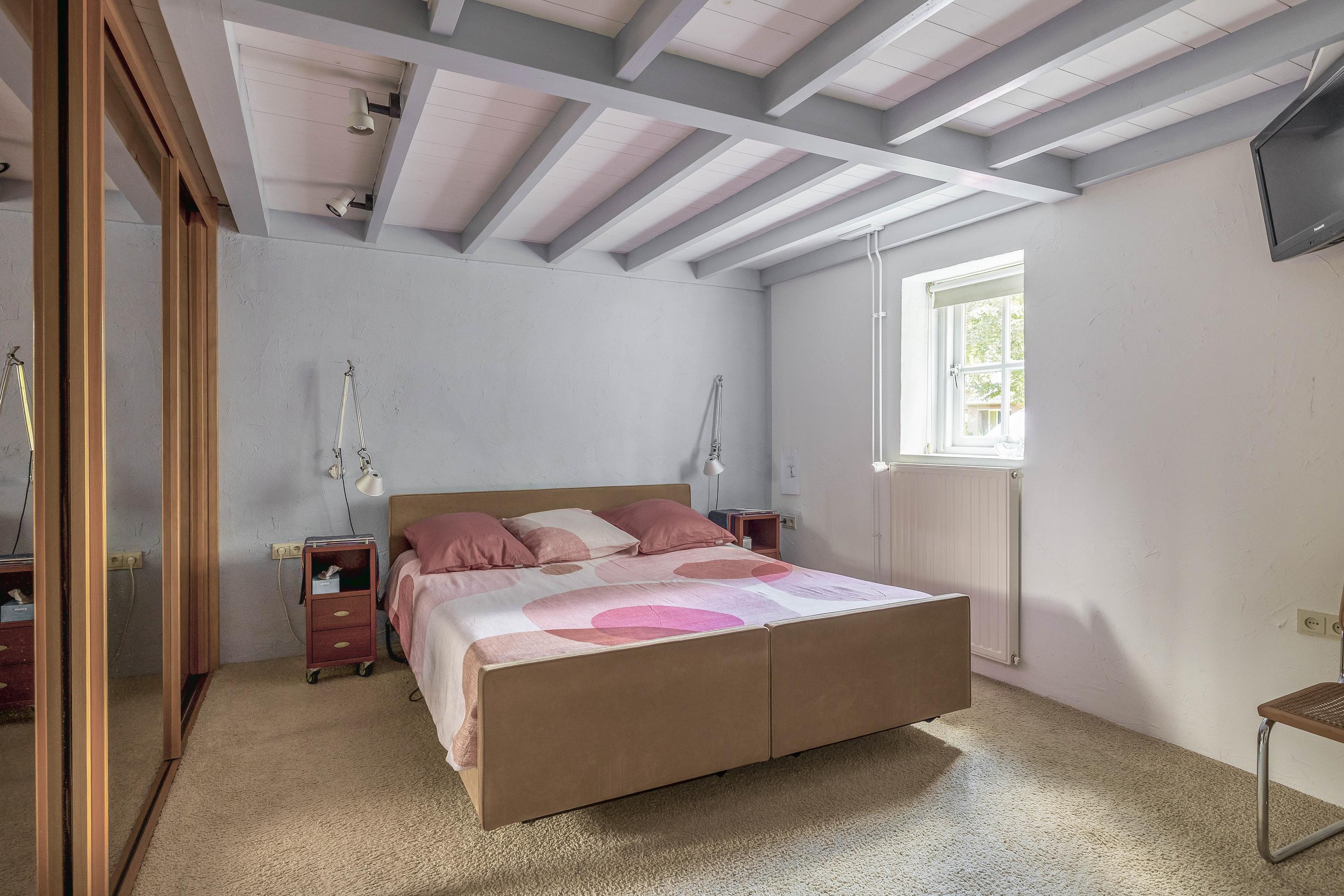 The first bedroom on this floor, located entirely on the left side of the farmhouse, is finished with carpet, stucco walls, and a beamed ceiling. This room has a large Velux skylight at the rear and a beautiful high window that extends into the kitchen on the ground floor. This spacious bedroom also has a built-in bookcase in the wall. Bedroom two, located in the middle of the house, has a similar finish and three large skylights that provide plenty of light.