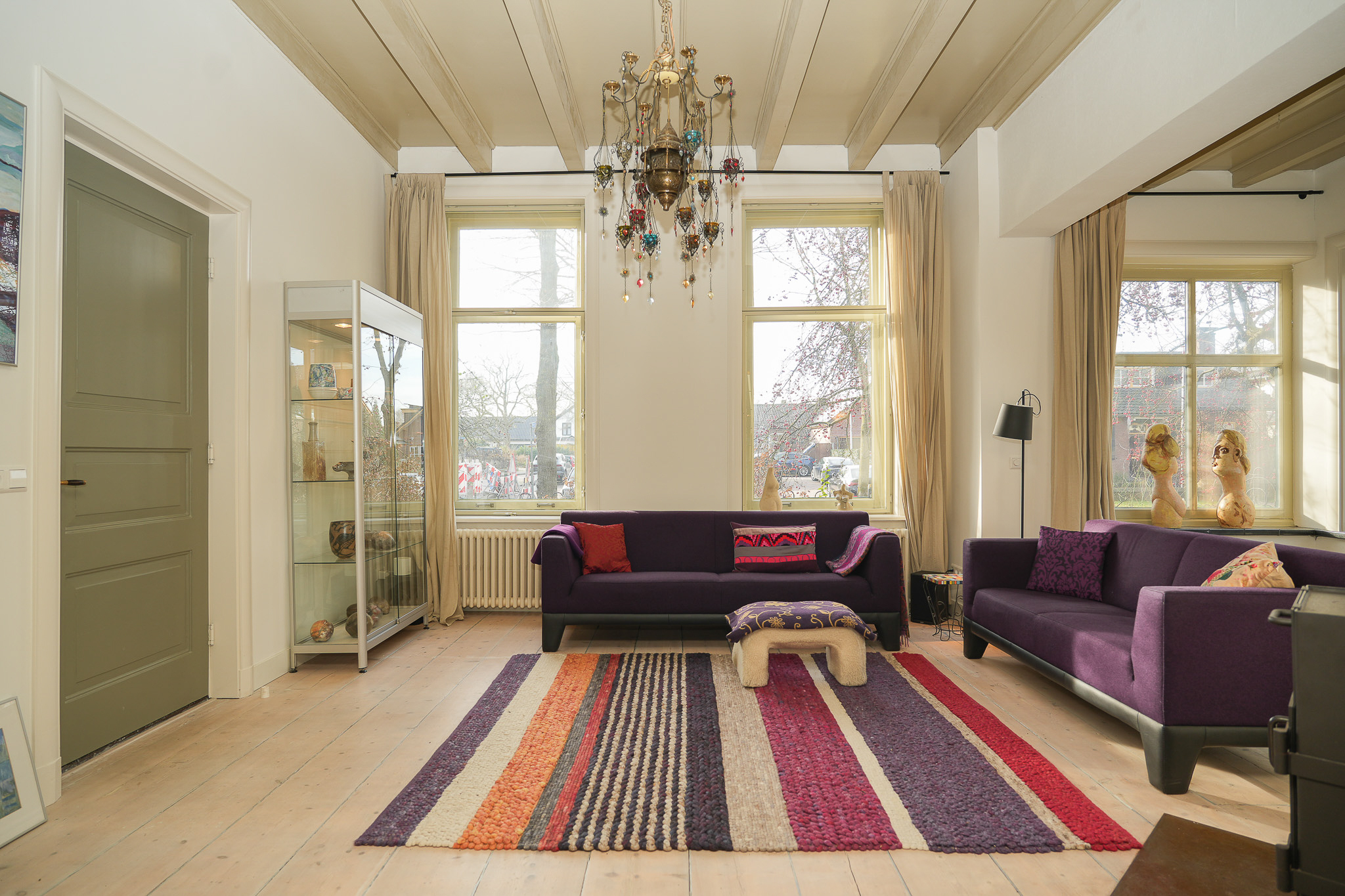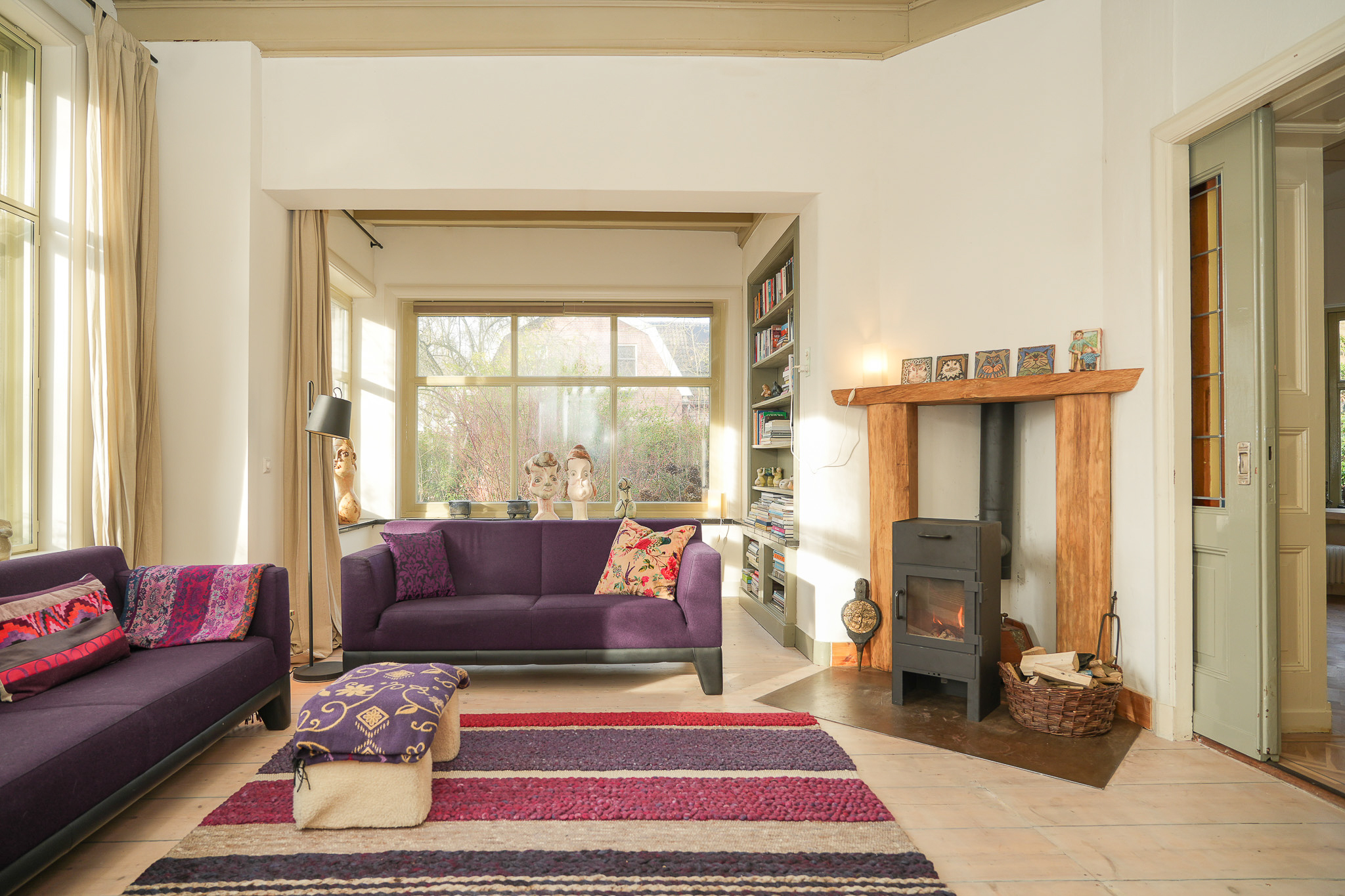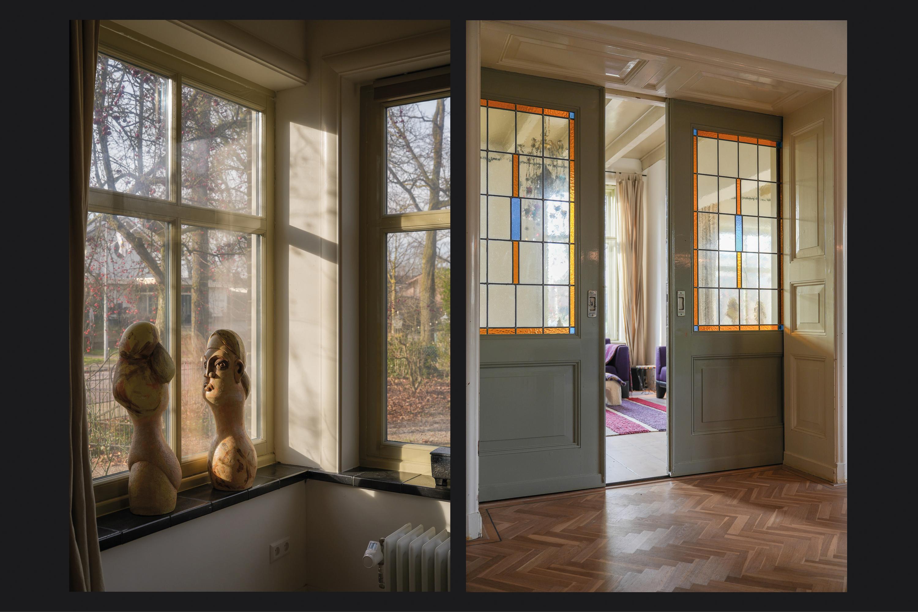 De entree voert naar een L-vormige gang, die toegang geeft tot de verschillende vertrekken, waar licht en hoogte meteen opvallen. Halverwege de gang bevindt zich de fraaie trap naar de eerste verdieping met een karakteristiek bordes. Aan de voorzijde ligt de woonkamer en suite, verdeeld in een zit- en eetgedeelte. Deze ruimte wordt gekenmerkt door originele schuifdeuren met glas-in-lood en een erker. In het eetgedeelte zorgen de parketvloer en vaste inbouwkasten voor een rustige en verzorgde uitstraling; in het zitgedeelte dragen het balkenplafond, de maatwerk wandkasten en de stoere houtkachel bij aan een warme, huiselijke sfeer.