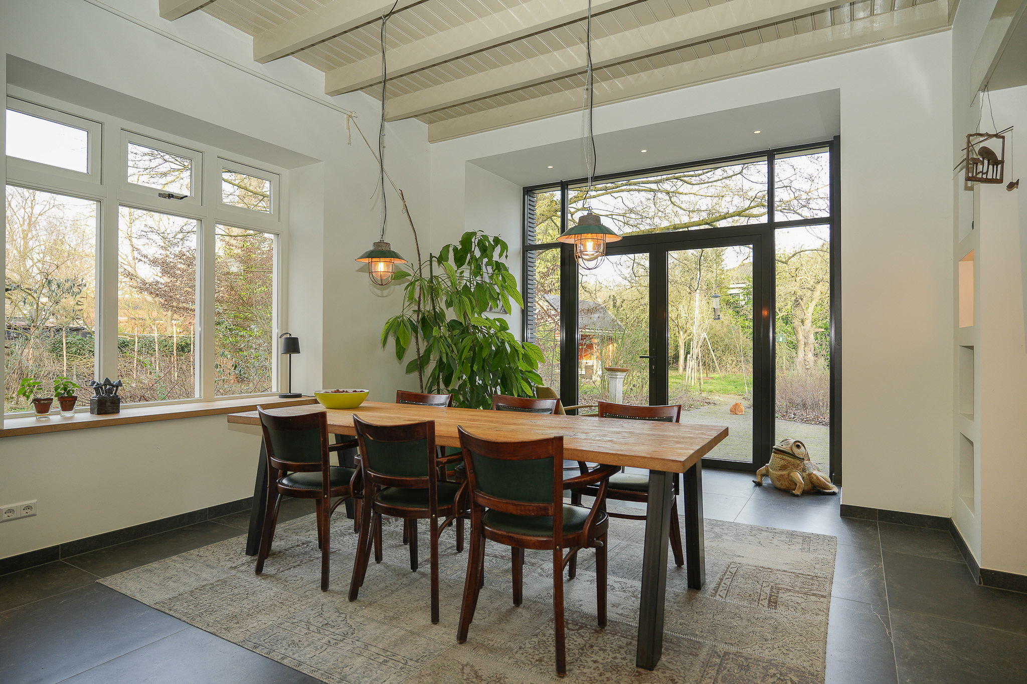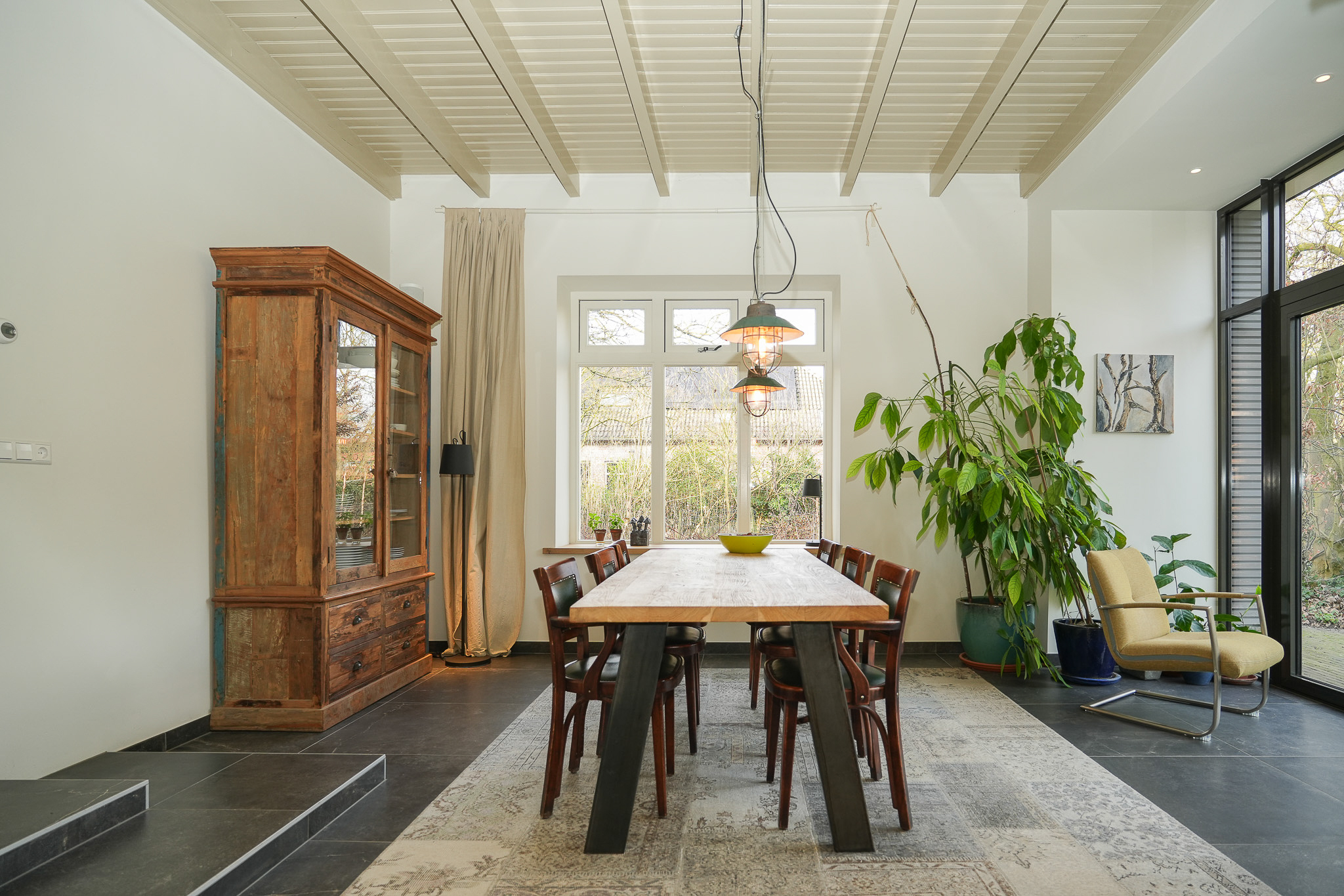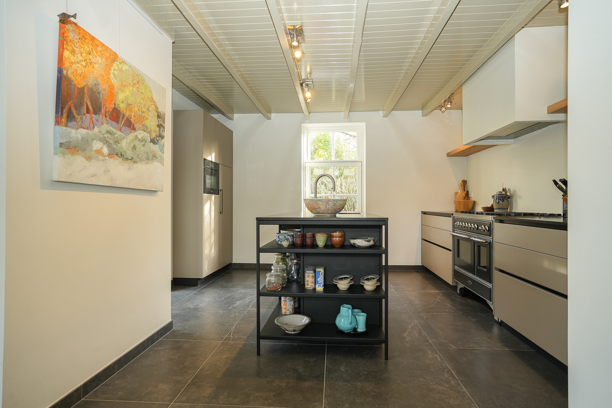 Aan het einde van de gang bevindt zich de woonkeuken, waar in 2021 de achtergevel is getransformeerd om een maximale verbinding tussen binnen en buiten te creëren. Het betreft een comfortabele, lichte leefruimte met vloerverwarming. De keuken is ingericht met een maatwerkkeuken van Culimaat, voorzien van een kookeiland en een wandopstelling met diverse inbouwapparatuur waaronder een stoomoven met vaste wateraansluiting. Daarnaast is er een vrijstaand Boretti gasfornuis met twee elektrische ovens. Het eetgedeelte sluit hier naadloos op aan en biedt plaats aan een royale eettafel met zicht op de tuin.