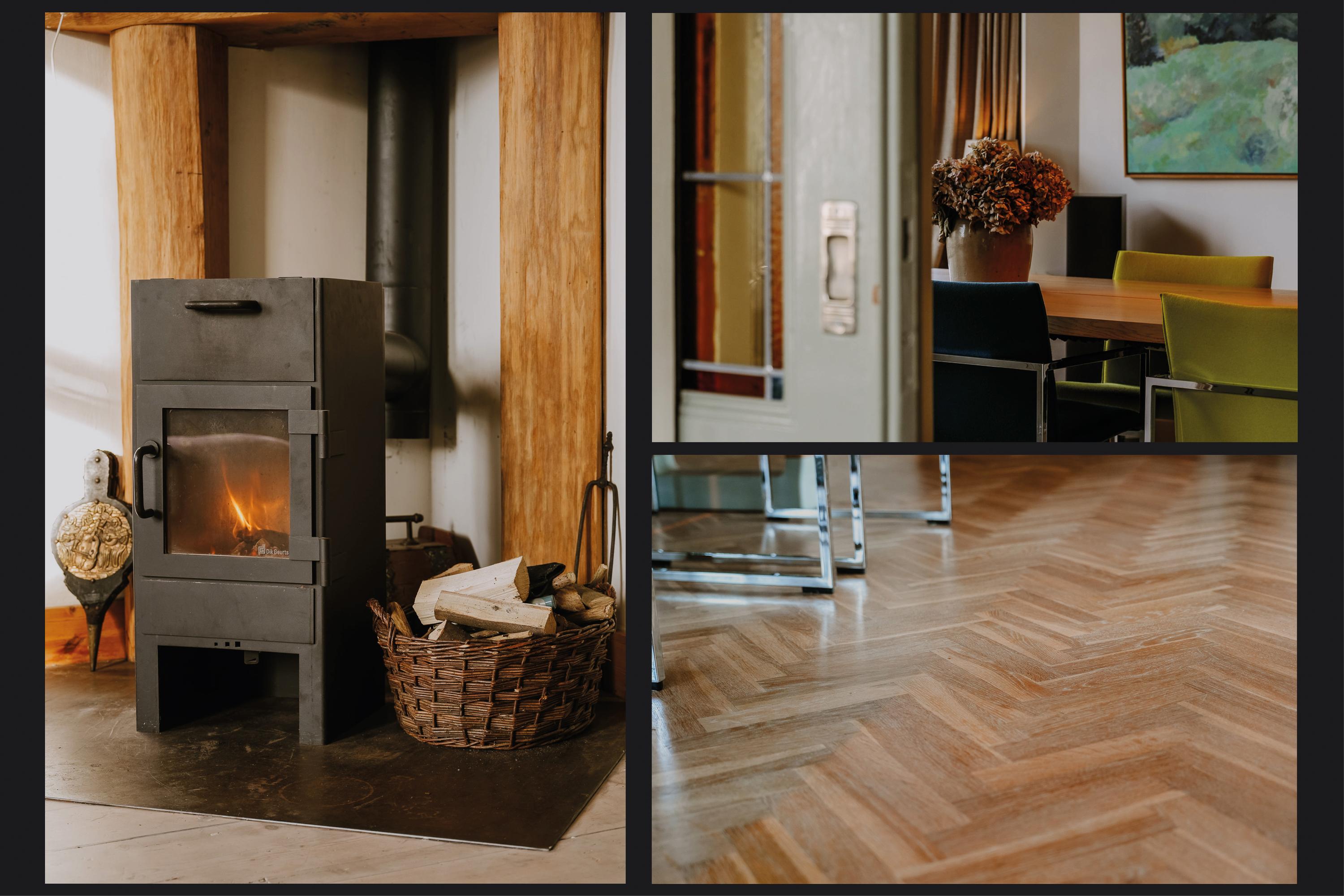 Entree en gang met granitovloer, voorkamer met houtkachel en suitedeuren naar de achterkamer met erker, werk-/muziekkamer met boekenwand, werk-/slaapkamer in de opkamer, gelegen boven de wijnkelder, tuingerichte woonkeuken met maatwerkkeuken, wasruimte en toilet op de begane grond.