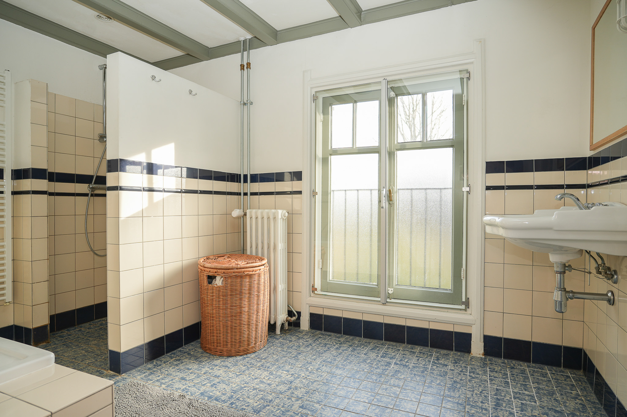 De badkamer is eenvoudig, maar functioneel en beschikt over een douche, ligbad en wastafel. Er is een ruime separate toiletruimte met wastafelmeubel.