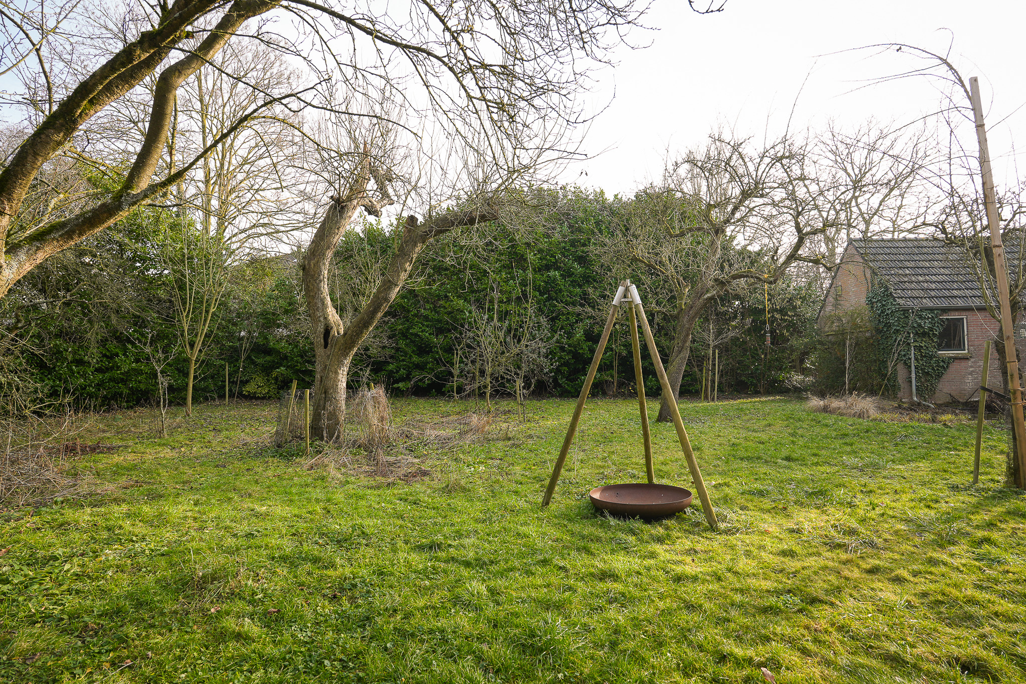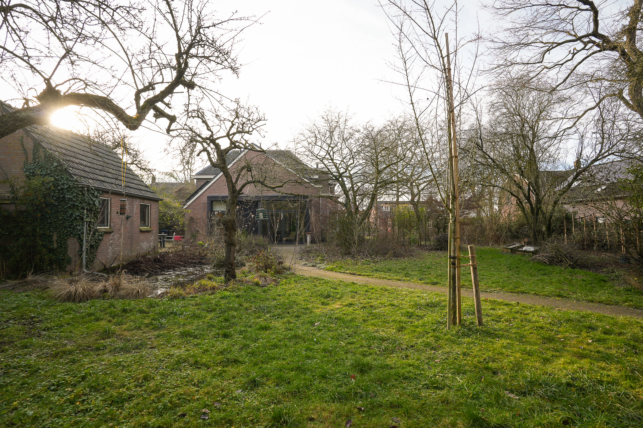 De tuin is ingericht als natuurtuin met elementen van een voedselbos. Volwassen bomen, een groot gazon, een vijver en diverse borders zorgen voor privacy en een groene setting in elk seizoen. In deze natuurlijk ingerichte tuin zijn veel eetbare gewassen aanwezig, waaronder diverse bessen, bramen, frambozen, (kwee)peren, appels, een amandelboom, walnotenboom, druiven en hazelaars.