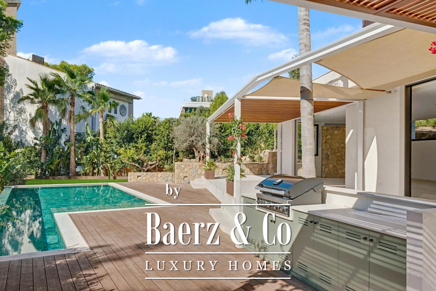 A green-tiled pool, Mediterranean garden with palms, and carefully crafted outdoor barbecue area reinforce the sense of sanctuary and ease. Villas in Sant Elm rarely present this blend of privacy, direct natural access, and modern ease, set within a coastal enclave famed for tranquil coves and access to iconic trails such as those leading toward Sa Dragonera.