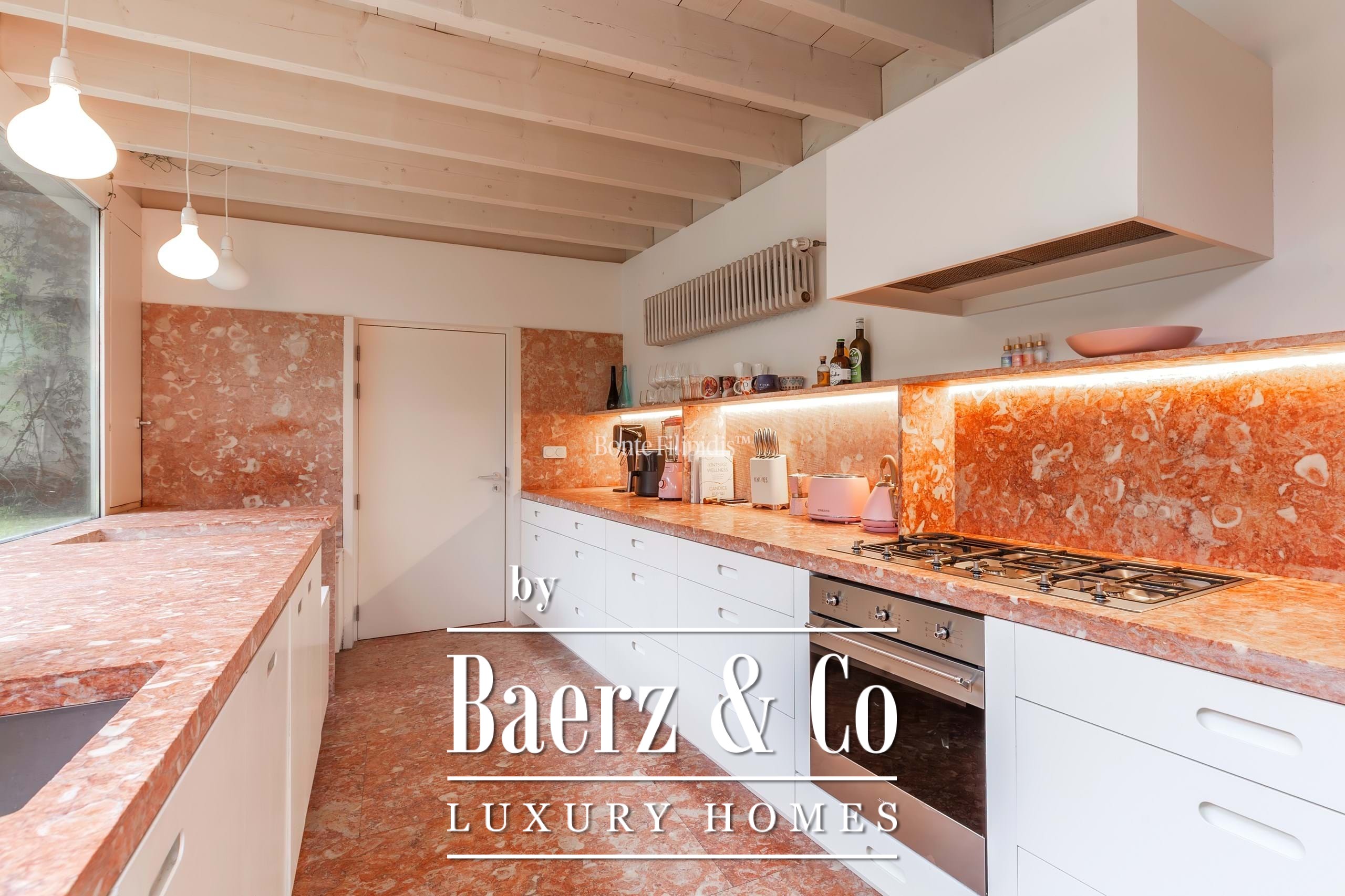 The primary living spaces are marked by original stone flooring and softly vintage accents, with large panoramic windows drawing natural light into the open-plan social area. Here, living and dining zones flow seamlessly out to an 80 m² private garden, a tranquil retreat bordered by mature greenery for quiet moments or reserved gatherings. Subtle material choices and precise detailing lend an understated sophistication to every space.
