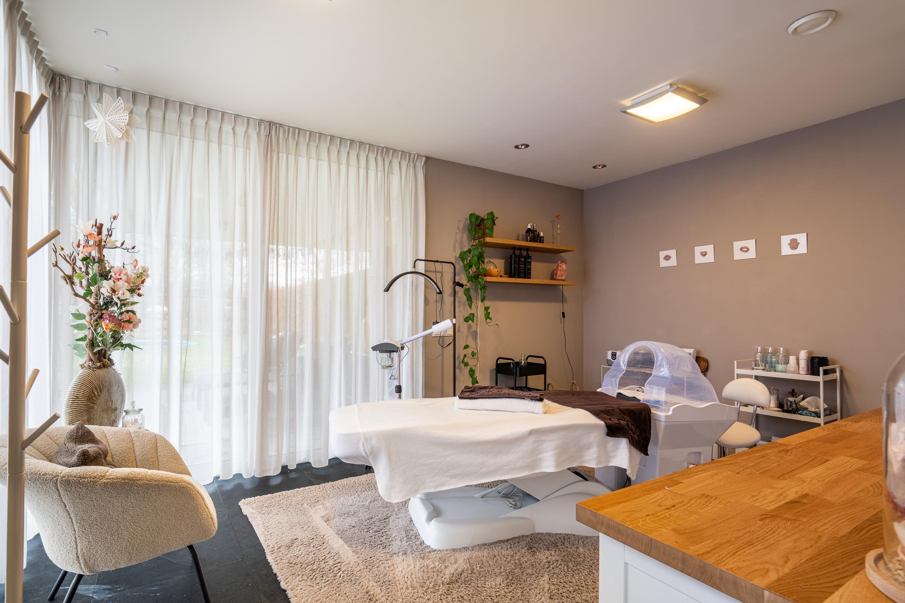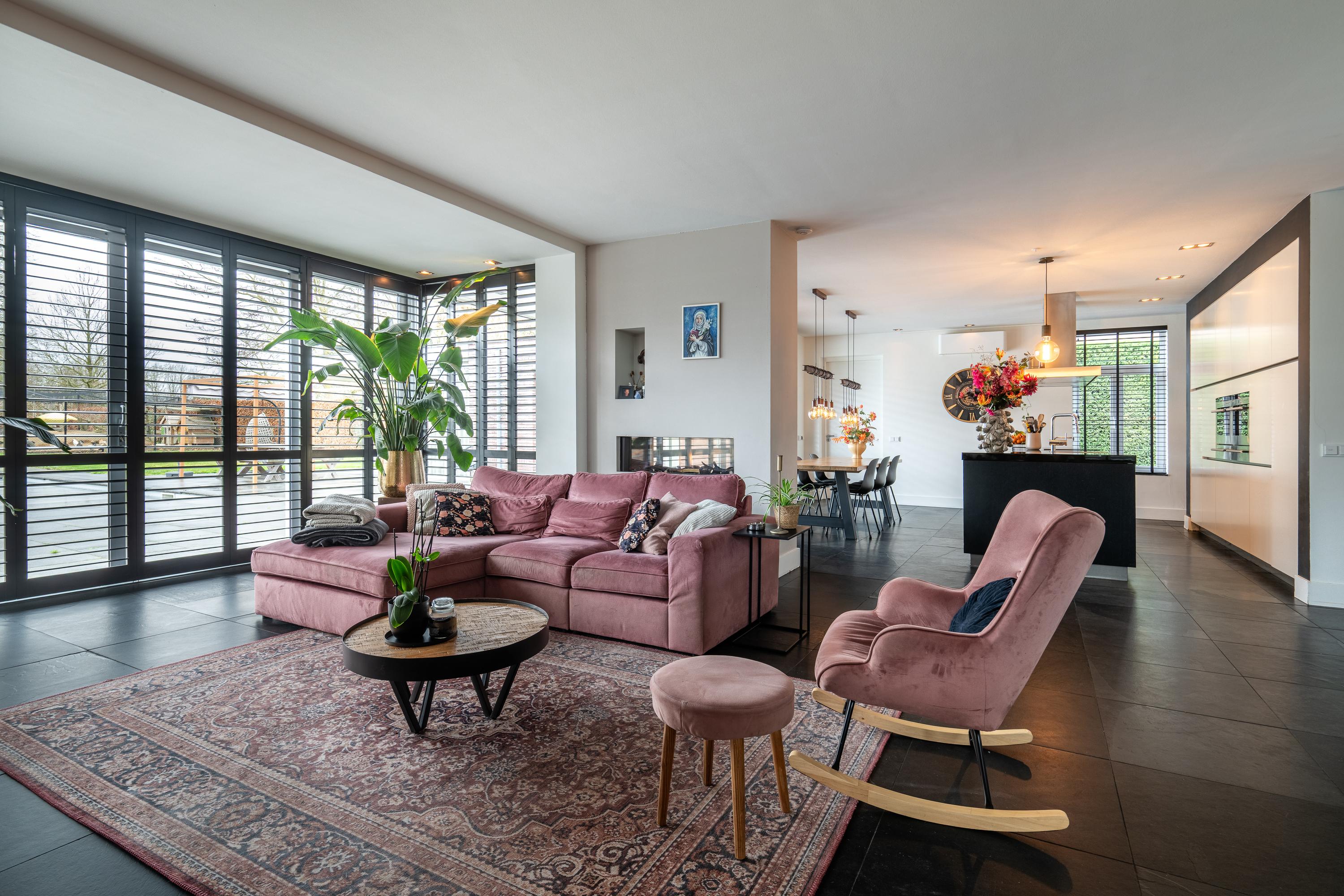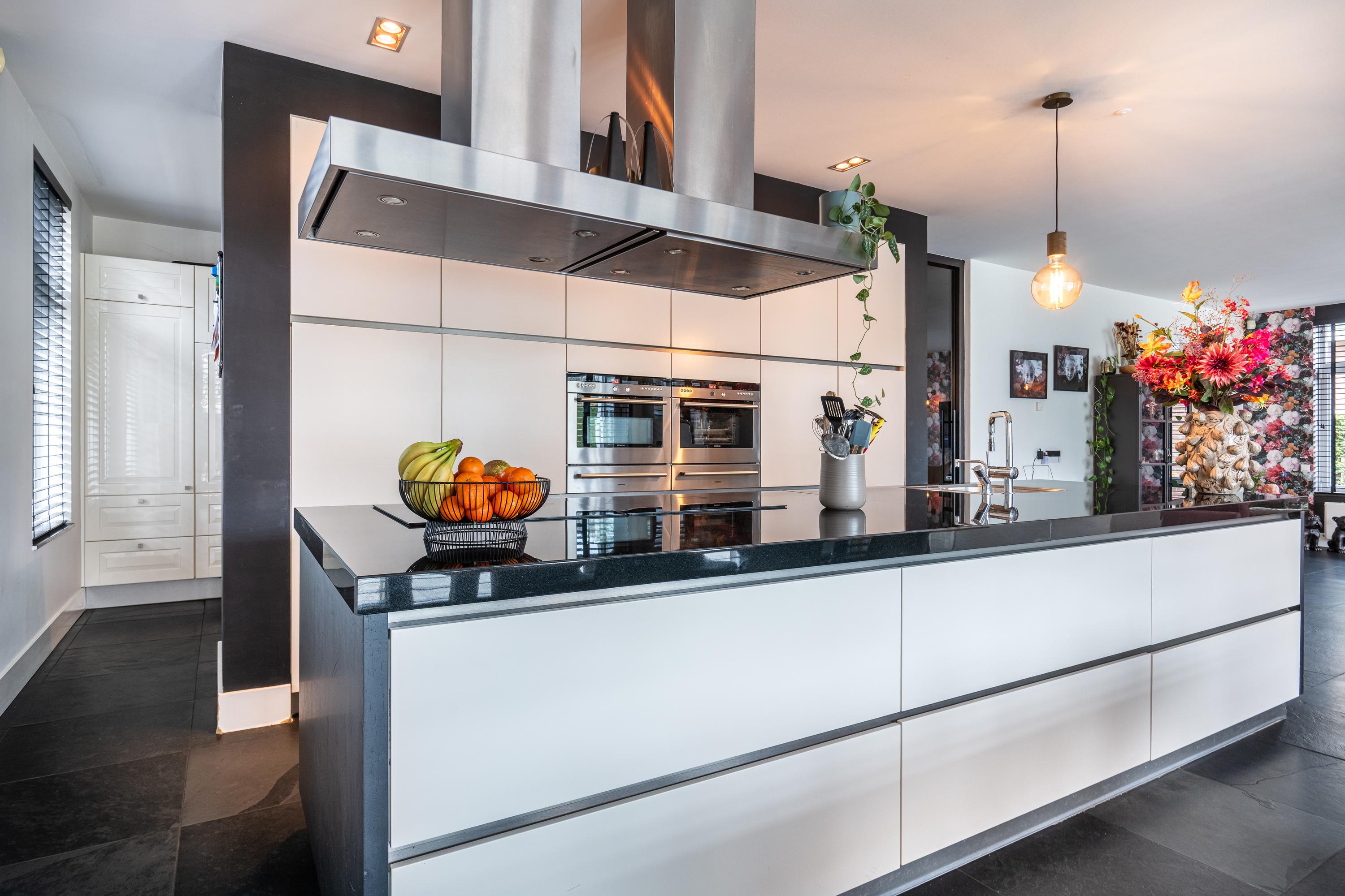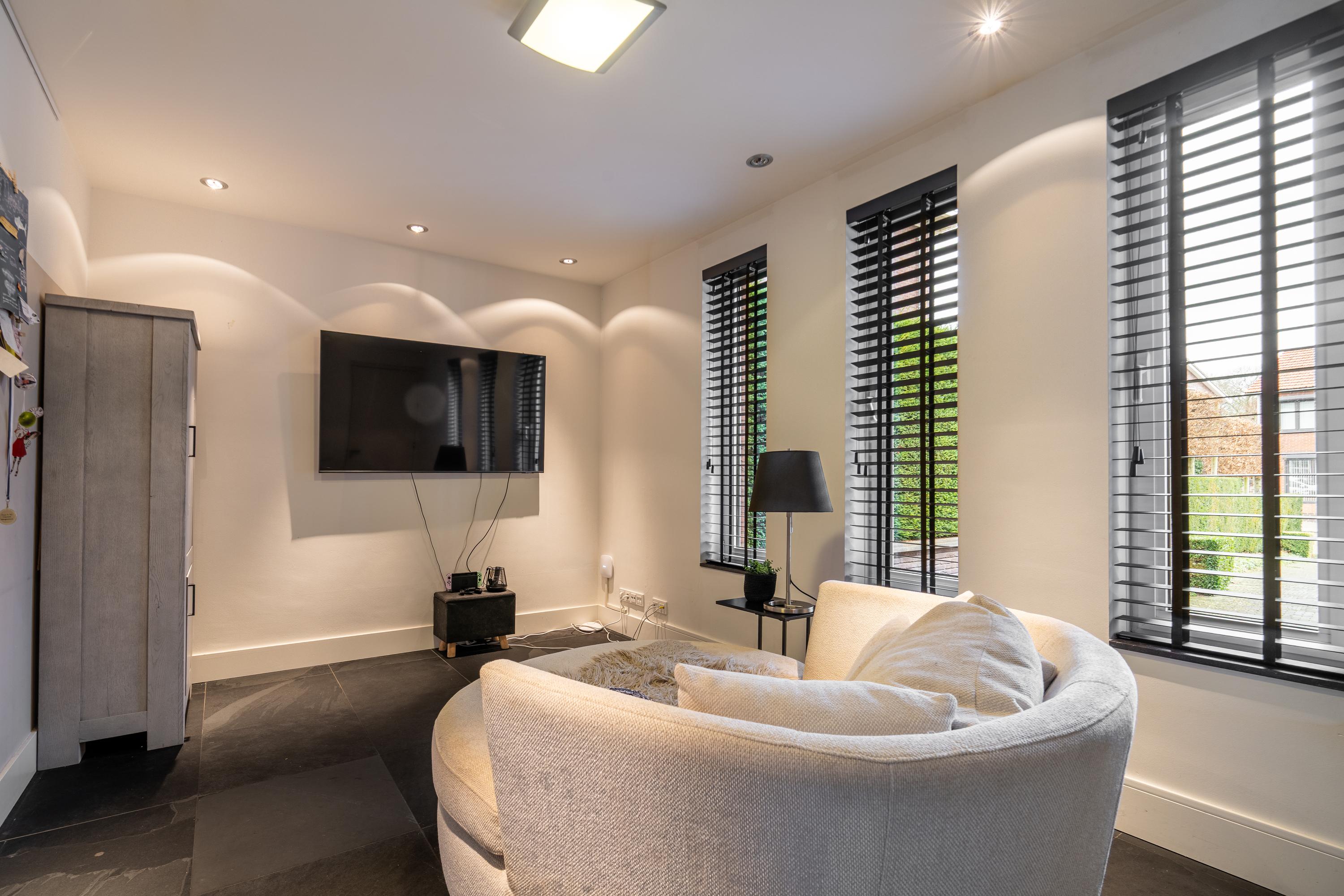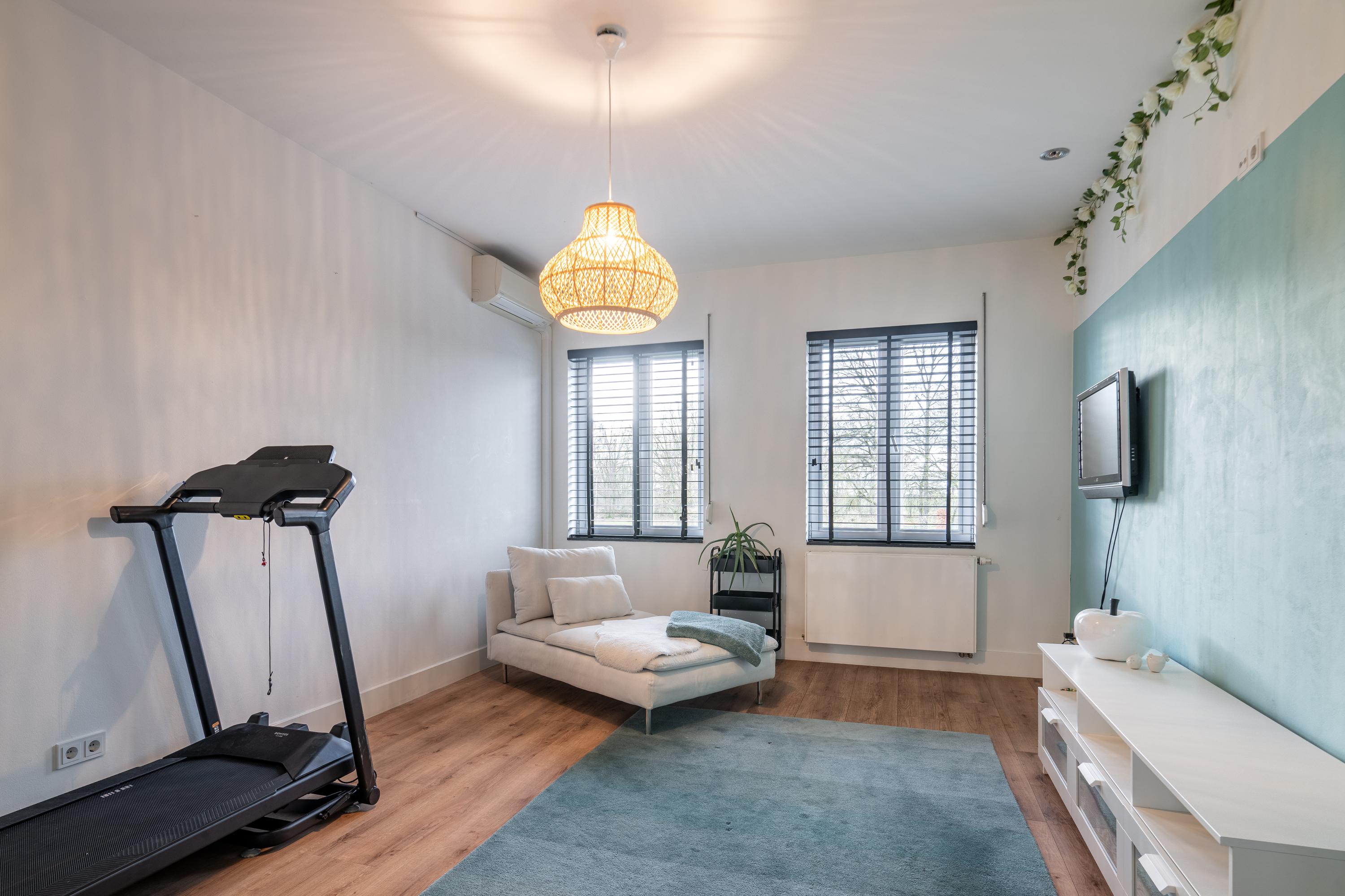 The impressive entrance/hallway offers plenty of space and access to the meter cupboard, toilet, cloakroom, utility room, and office space (approx. 21m²), which could potentially be added to the living room. A modern pivot door leads to the living area. The spacious living room with adjoining open kitchen (approx. 73m² in total) exudes atmosphere and luxury thanks to its cozy interior and optimal garden view. There is also a practical air conditioning system and an attractive decorative gas fireplace. The kitchen with spacious cupboards and island is equipped with various built-in appliances and provides access to the utility room (approx. 11m²) behind it, which has a complete second kitchen. Adjacent to the living area is a multifunctional room, currently used as a TV room/game room (approx. 15m²). From here, you can also access an extra room with a shower, toilet, and access to the garden and the room currently used as a practice room. For extra comfort, the ground floor has underfloor heating.