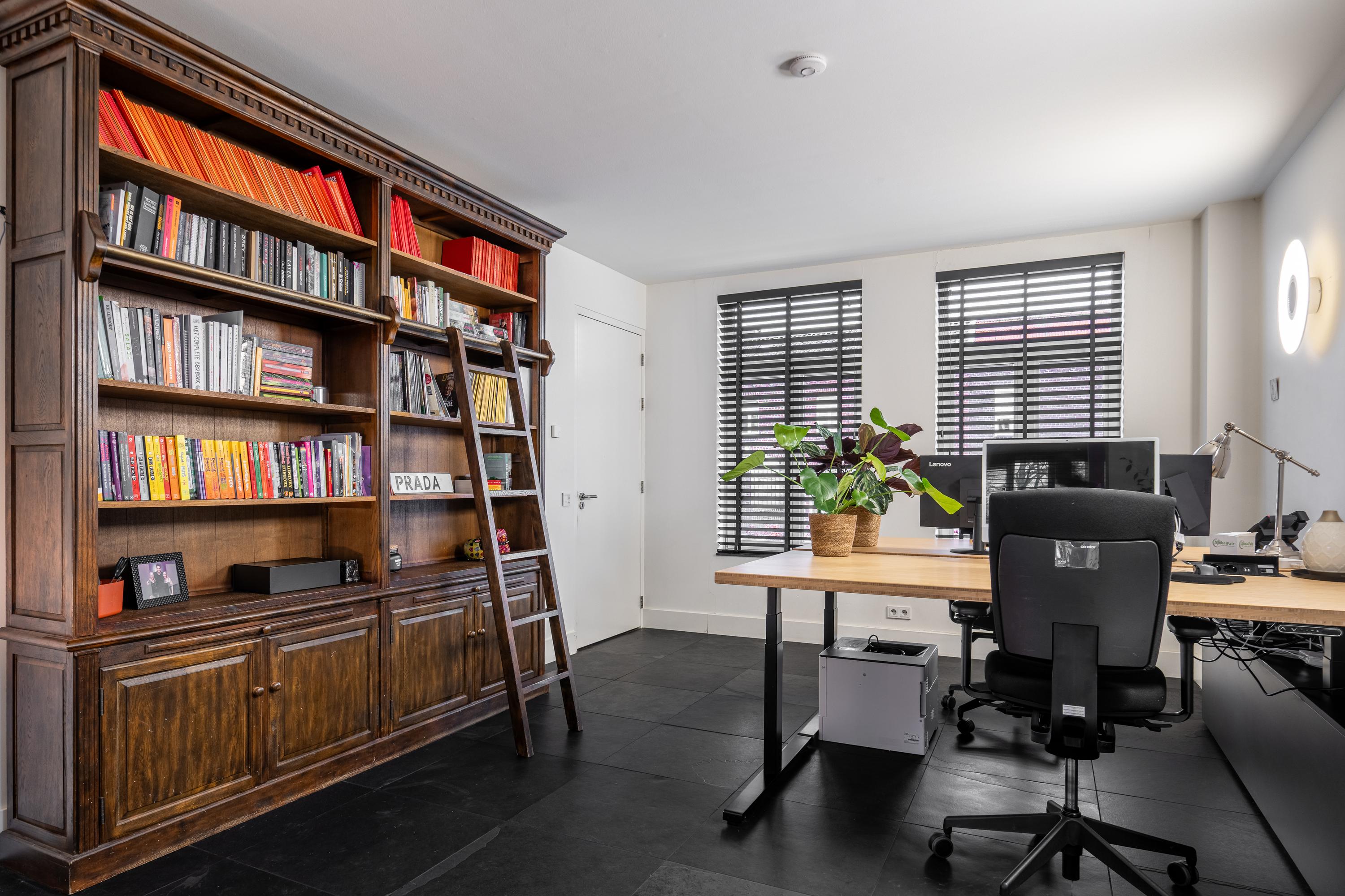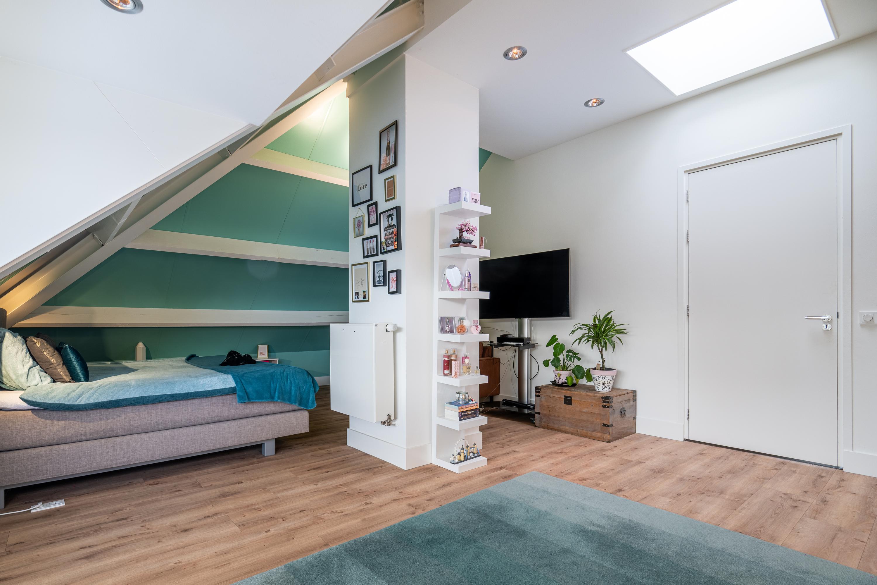 A fixed staircase leads to a landing with access to the walk-in closet, the boiler room, and the fourth bedroom with en-suite bathroom. The bedroom (approx. 29m²) has a practical dormer window and therefore offers a beautiful view of the garden. From the bedroom, there is open access to the third bathroom (13.5m²), which is equipped with a freestanding bathtub, double sink, walk-in shower, and toilet. The walk-in closet has custom-made cupboards on both sides.