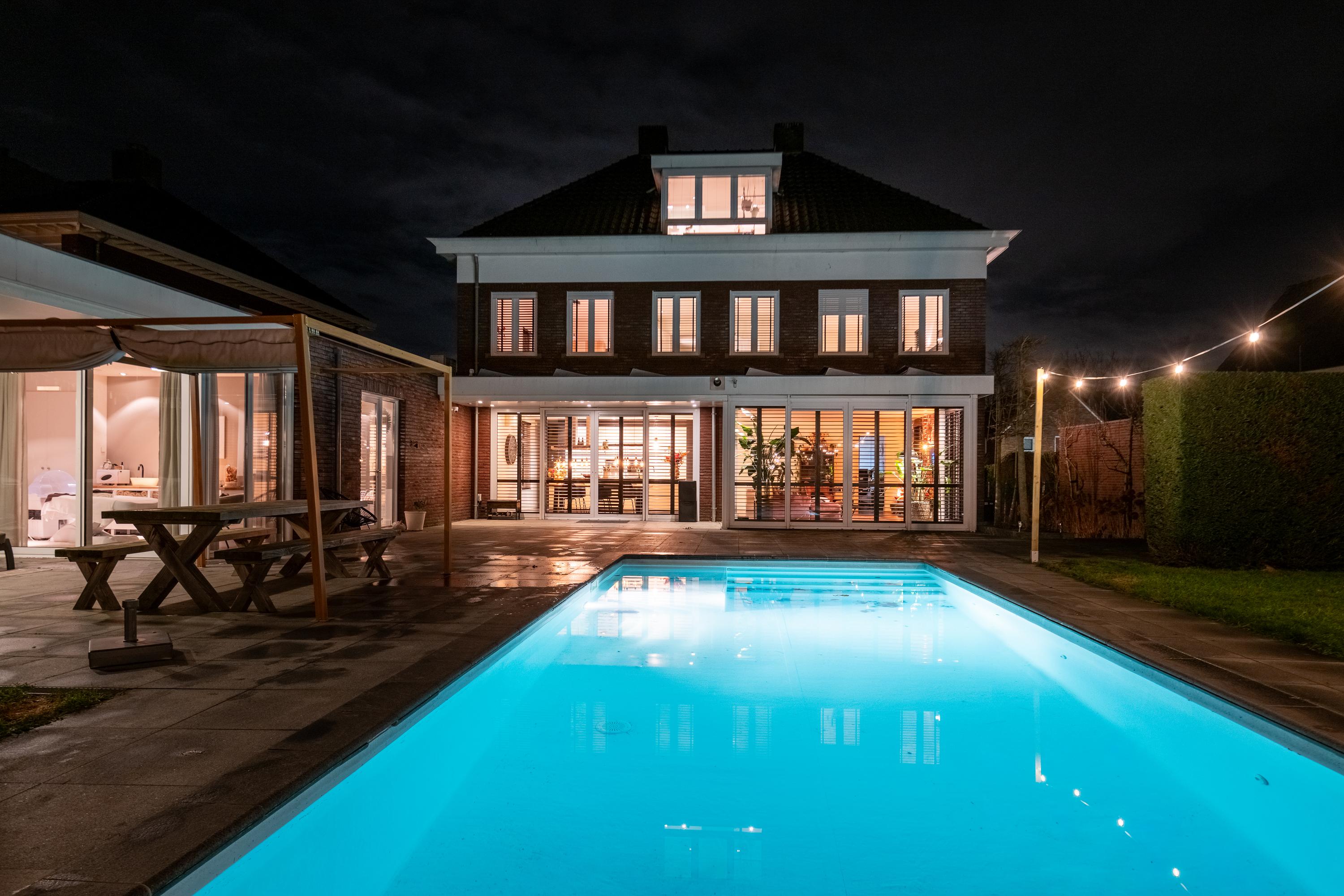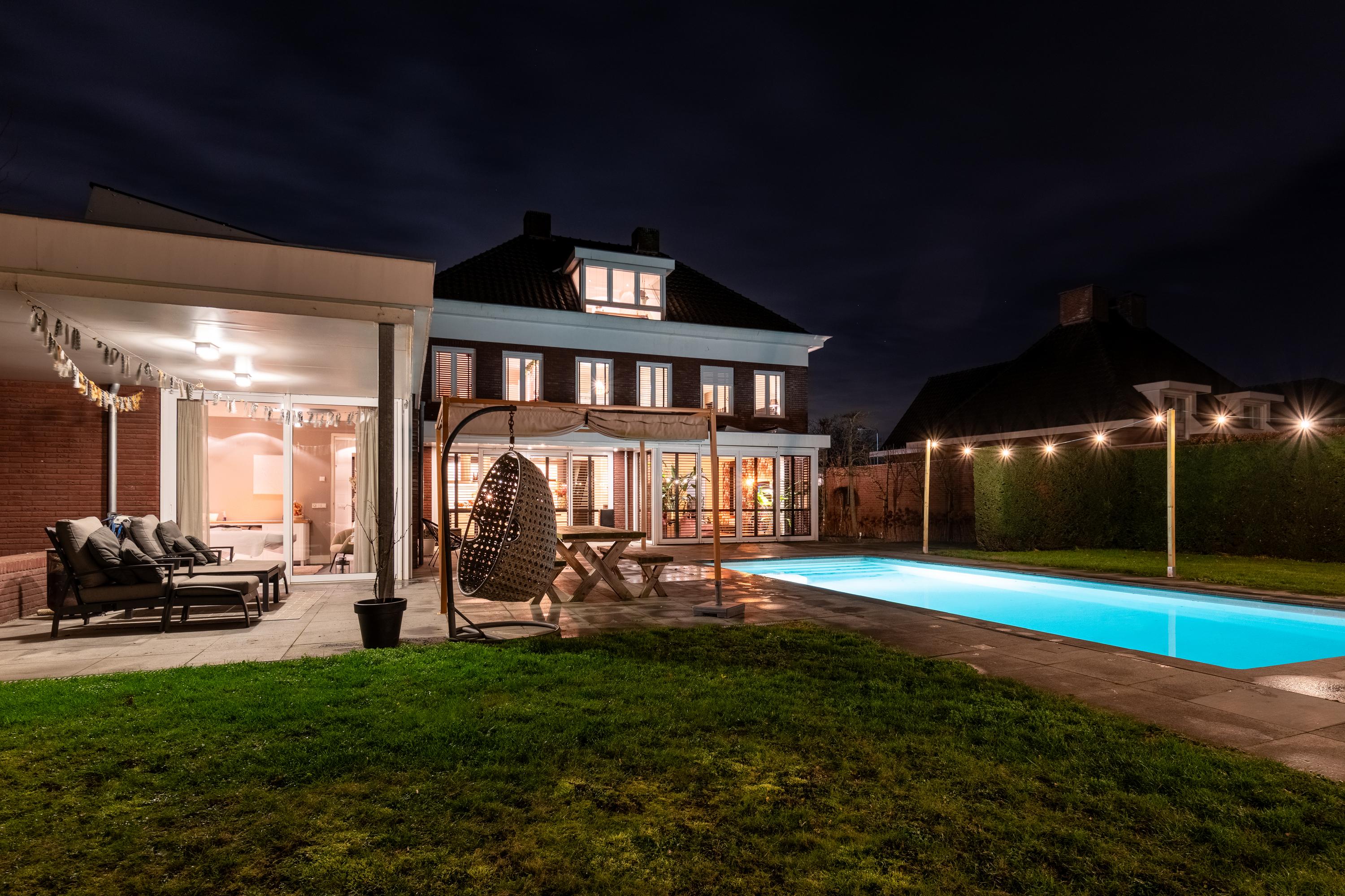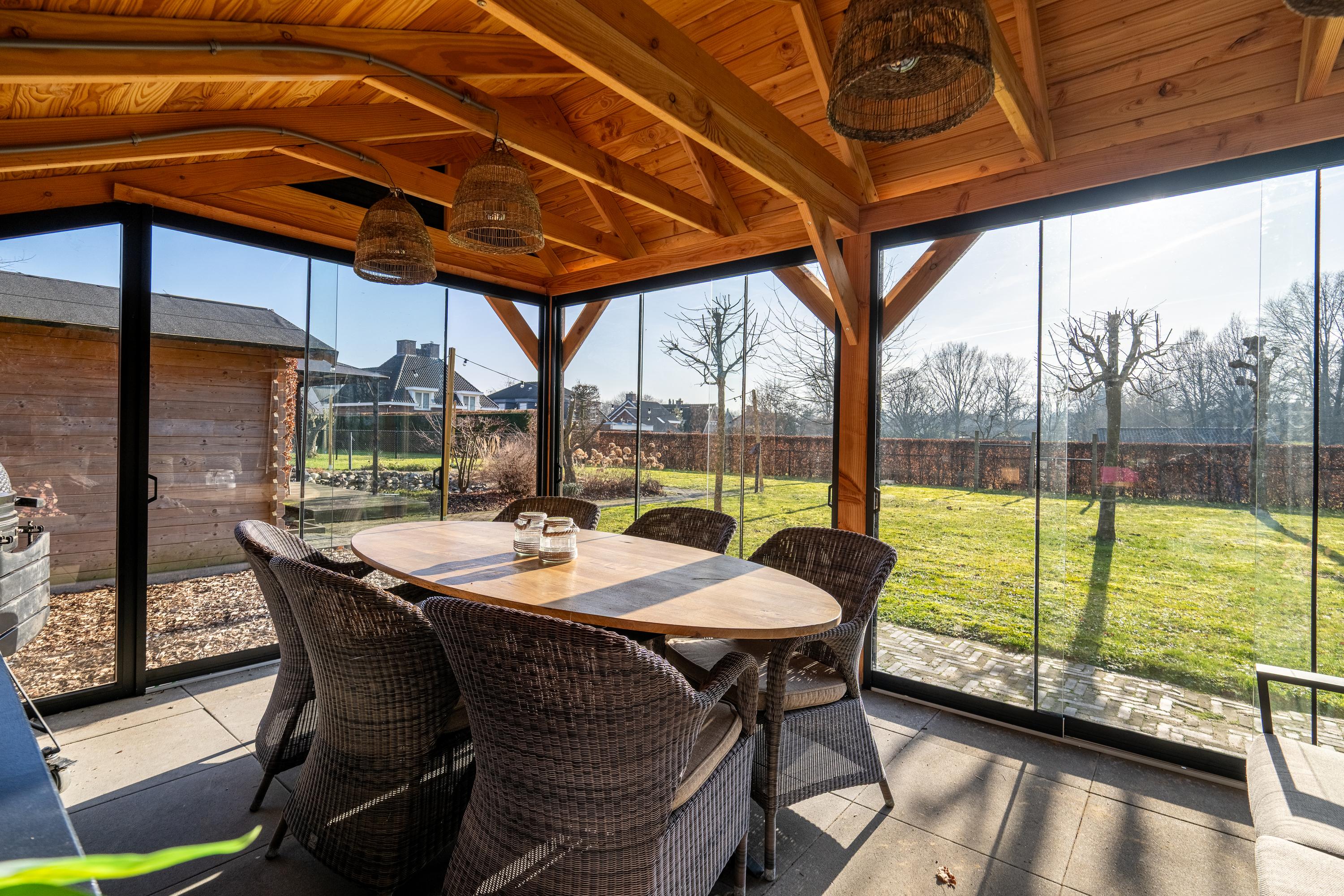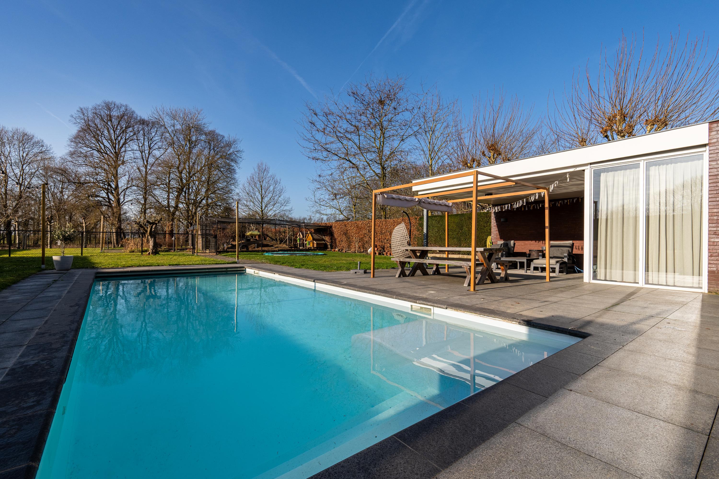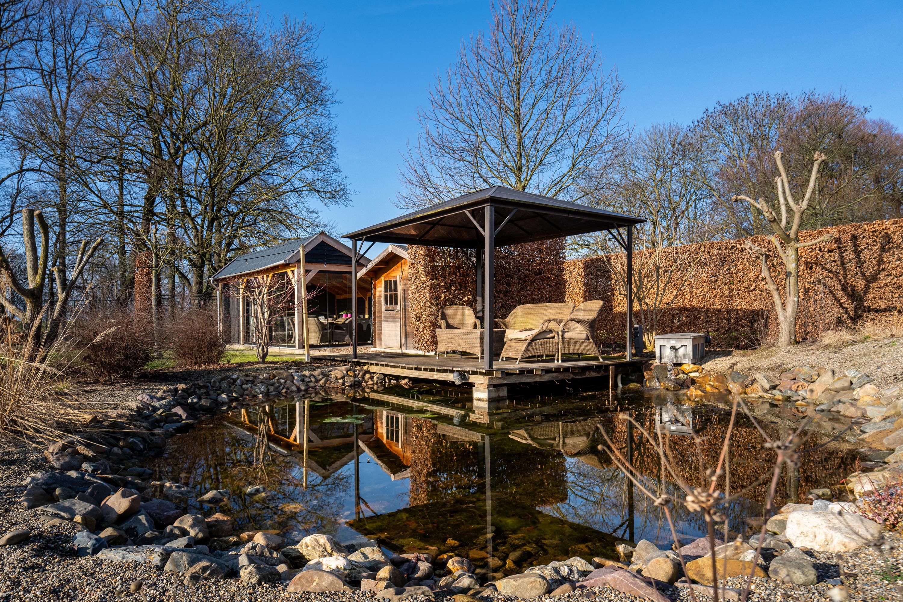The house is centered on the plot, so the garden surrounds the house. This spacious backyard of approx. 1,575 m² has several (sun) terraces, a large lawn, and borders with green plants. Because of the forest plot behind it, this backyard gives a feeling of peace, space, and privacy. The backyard also features a heated swimming pool, a charming pond, and several (covered) seating areas. In this garden, you can enjoy optimal privacy and all the beauty that this wonderful environment and nature has to offer.