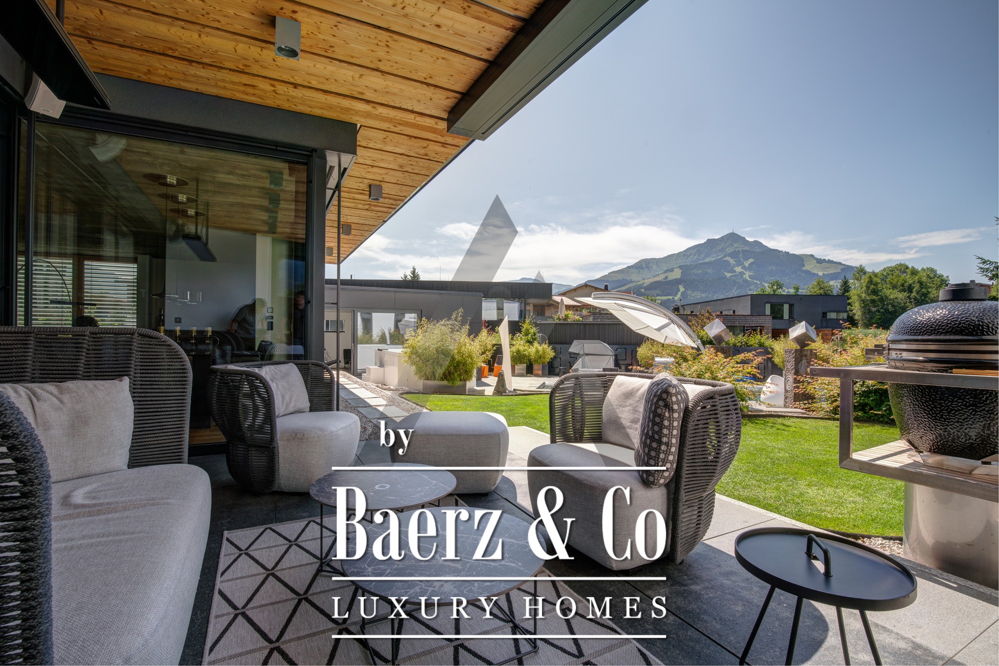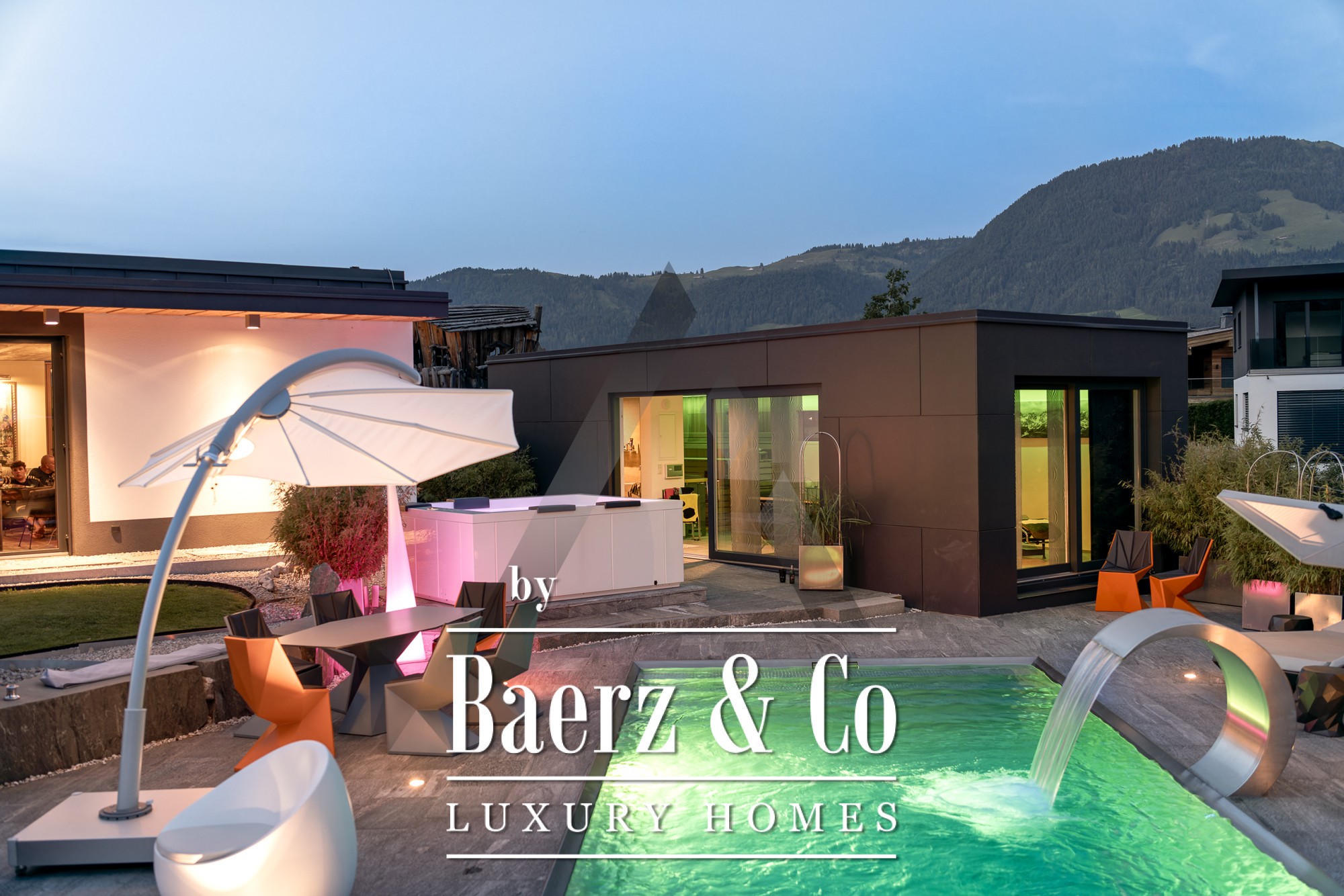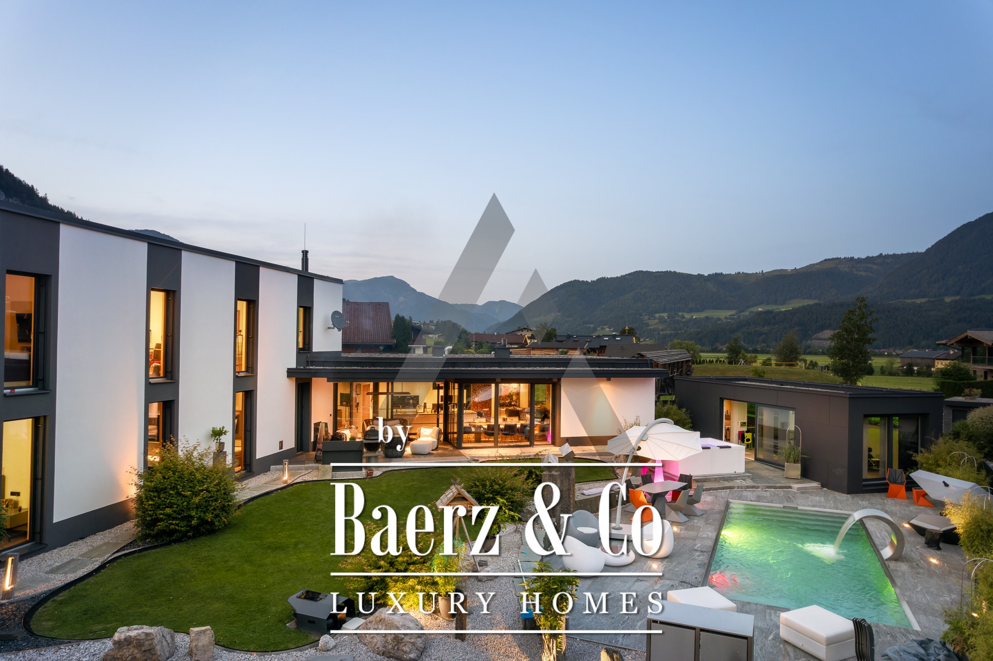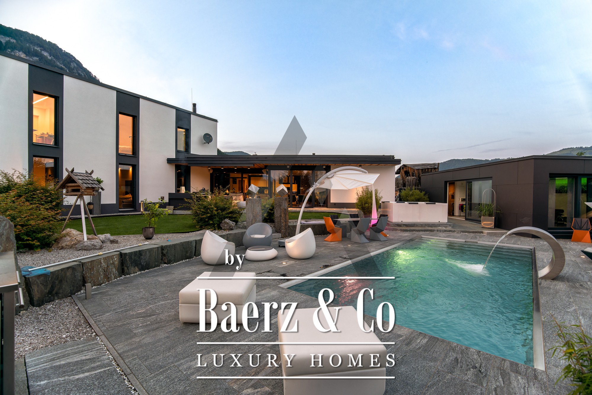 Detached house St. Johann in Tirol is set in a tranquil, sun-drenched position, offering sweeping views of the Kitzbühel Horn and Wilder Kaiser mountains. This contemporary property, offering 418 m² of living space on a 1,186 m² plot, captures the essence of refined alpine living. An idyllic landscape unfolds with a pond, landscaped streams, expansive terraces, and panoramic mountain vistas. The outdoor realm is enhanced by a stainless steel pool, a Treesse designer whirlpool, and a sauna, inviting leisurely mornings and restorative afternoons.