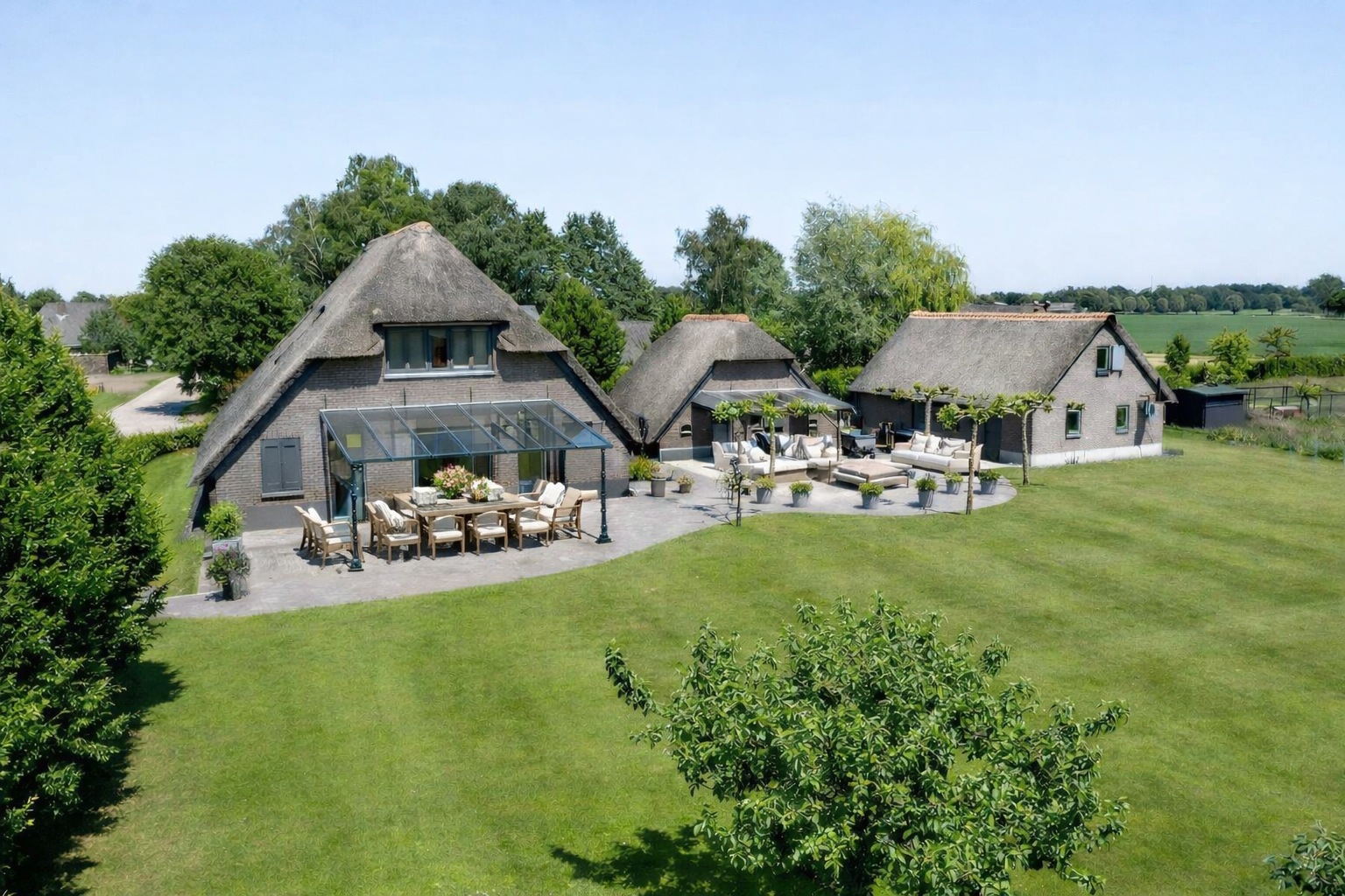 Accessed via an impressive entrance gate from the Quabbenburgerweg through the Wellinkhofweg, the estate immediately conveys a sense of exclusivity. The ensemble comprises a characterful main residence, a stylish detached guest house with veranda and sauna, and a substantial thatched double garage with loft, all designed in harmonious architectural style.