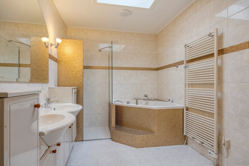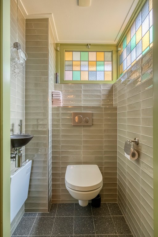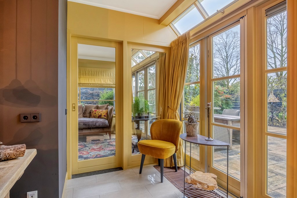 The live-in kitchen is modern and fitted with luxury appliances such as a large gas stove, a canopy extractor, dishwasher, fridge and freezer, air conditioning and a Quooker tap. Here you cook with a view of the garden, while natural light beautifully glides across the kitchen’s golden fronts. The conservatory and back garden can also be accessed via the kitchen. Adjacent, you reach on one side the practical utility room with laundry connections, and on the other a very spacious bedroom with an equally spacious walk-in closet and an en-suite bathroom. Sliding doors connect the bedroom to the garden, and the garden can also be easily reached via the walk-in closet. The generous bathroom features light tiling and a skylight, a whirlpool bath, double vanity, walk-in shower, wall-hung toilet and plenty of storage space.