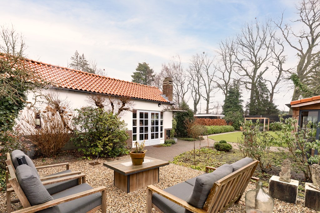 De woning is gelegen op een riant perceel van 1.043 m². Zowel aan de voor- als aan de achterzijde is de tuin groen, ruim en verzorgd en beschikt het over een ruime veranda met sfeervolle houtkachel. De in 2021 aangelegde achtertuin ligt op het zuidoosten en biedt veel privacy door hoge bomen en beschikt over een beregeningsinstallatie en fraaie tuinverlichting. Door de diverse terrassen, is er op elk moment van de dag een zonnige plek te vinden.