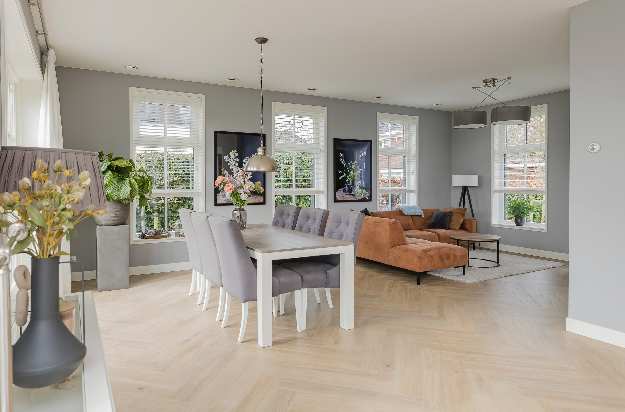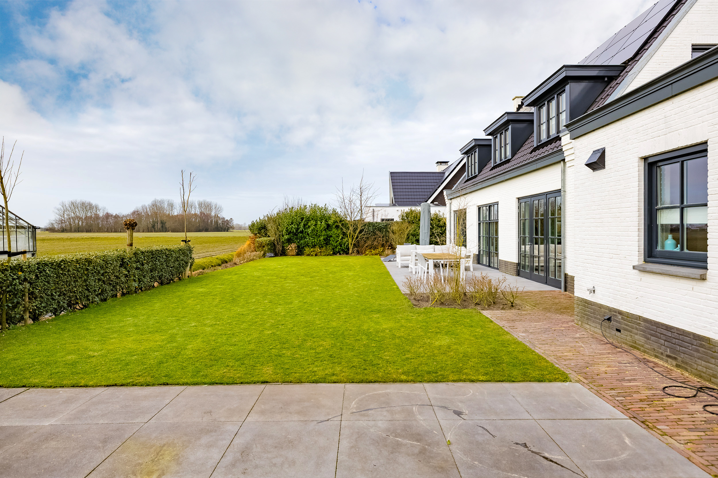 The living room is spacious and bright thanks to the large windows with white muntin bars and French doors leading to the terrace and the surrounding garden. The floor features stylish light wood flooring. At the rear, you can enjoy a fantastic unobstructed view of the bulb fields.