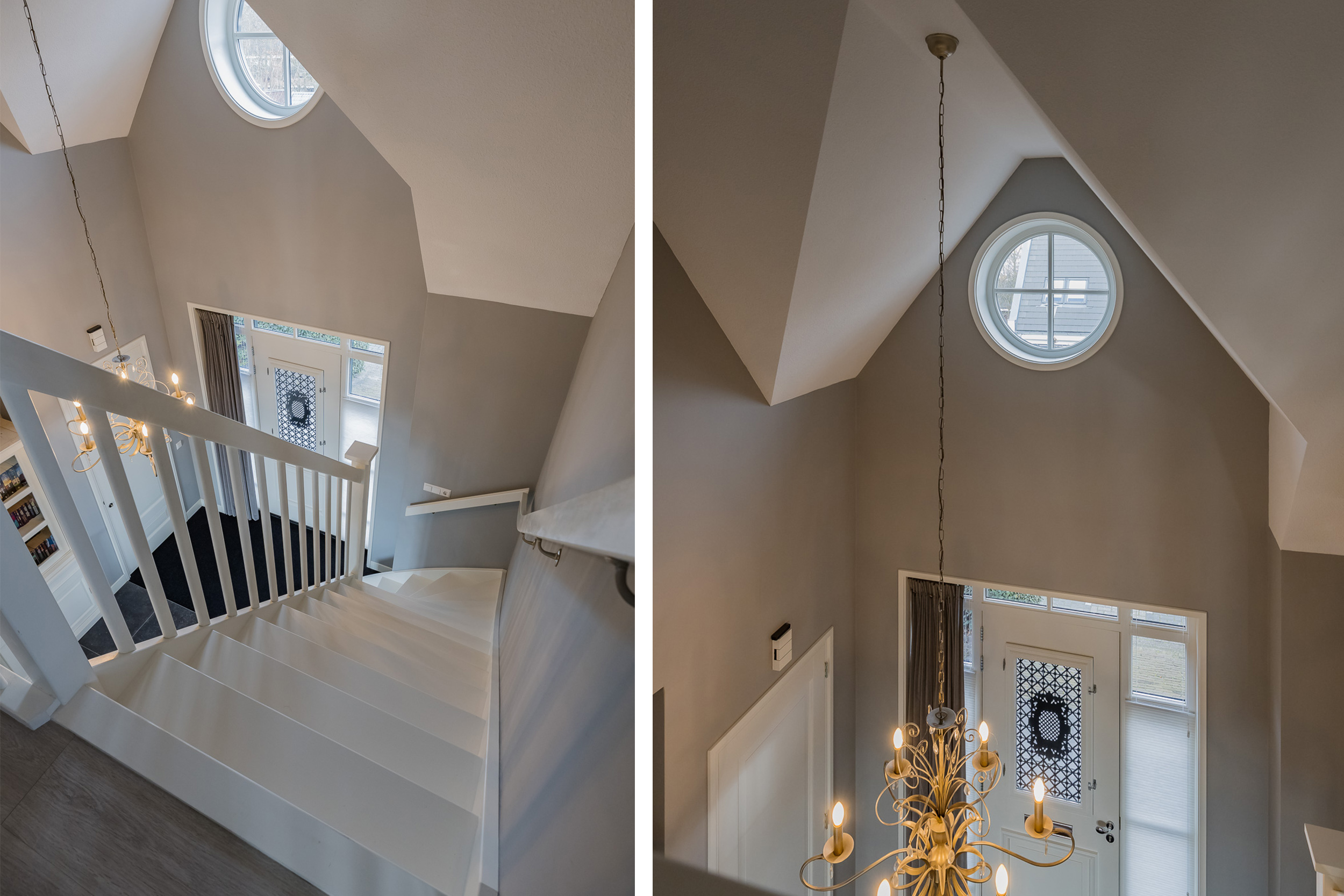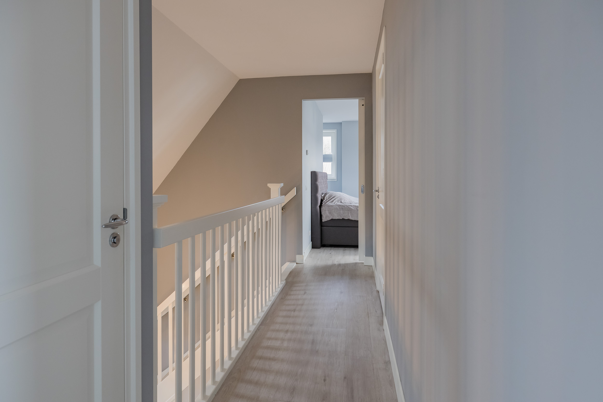 As soon as you step inside, you’ll experience the tranquility and high-quality finishes. The impressive entryway with a loft opens onto the spacious living room. Everywhere you look, you’ll see sleek, tone-on-tone finishes in shades of gray combined with plenty of white, creating a bright and modern atmosphere.