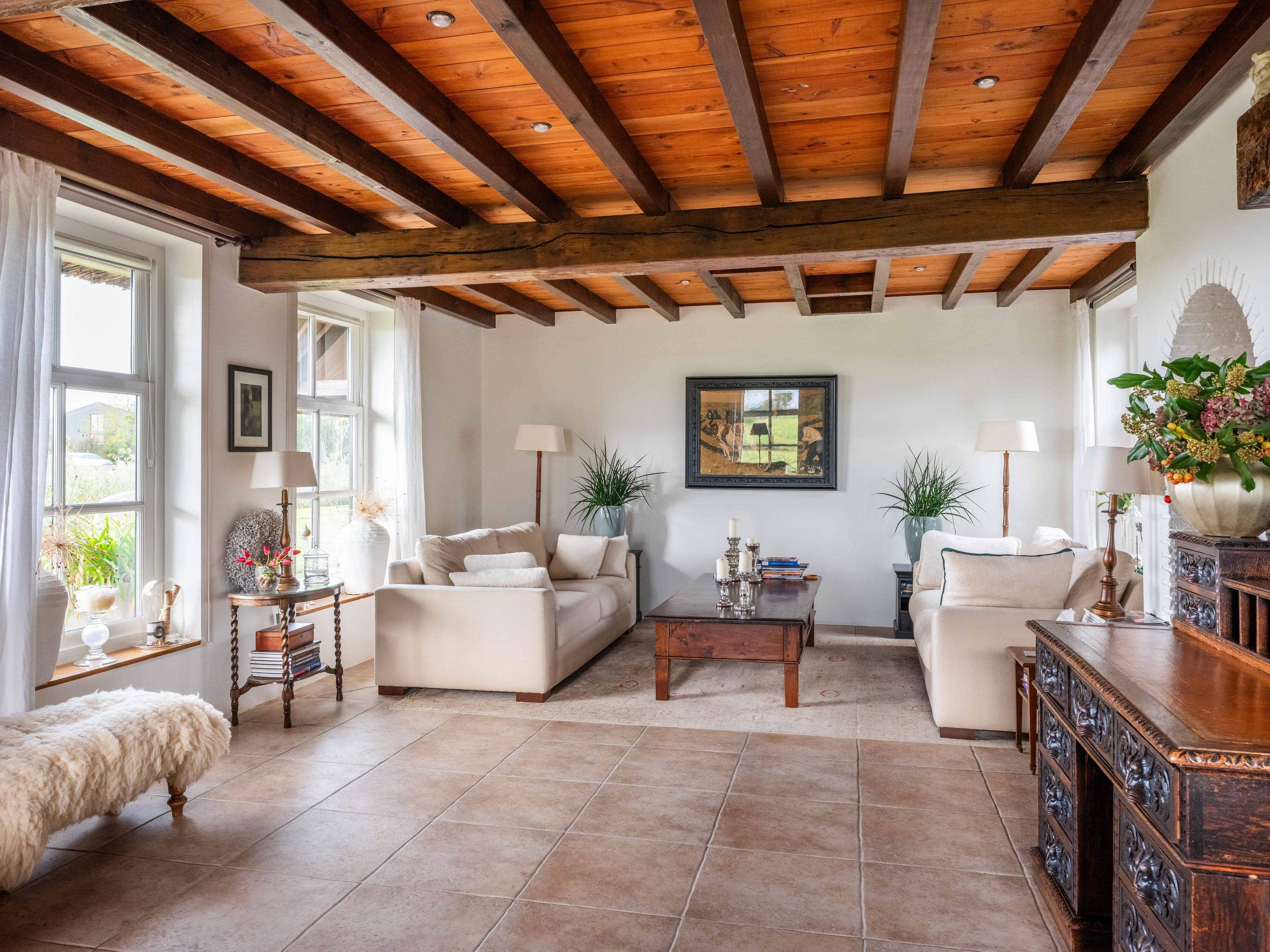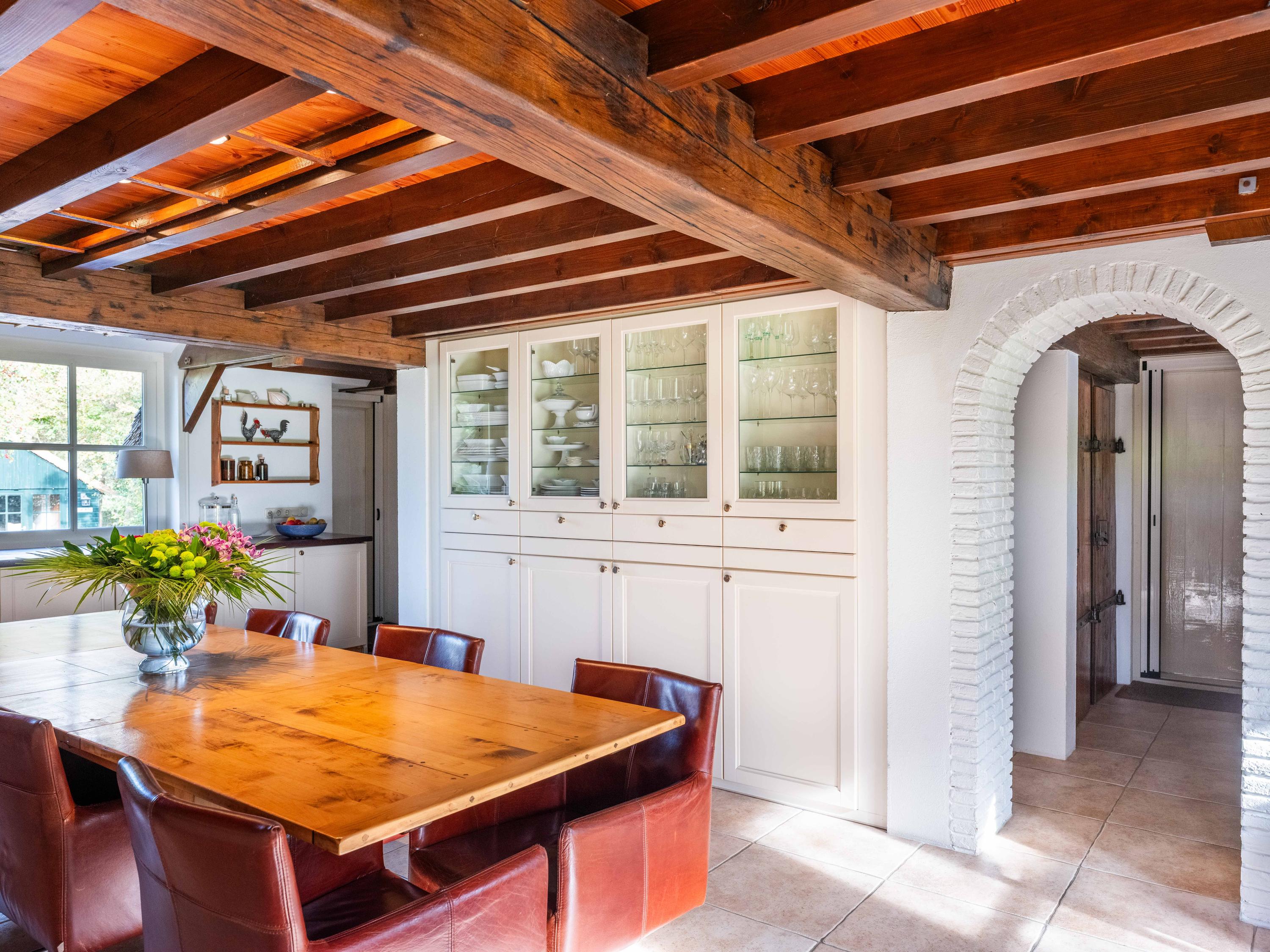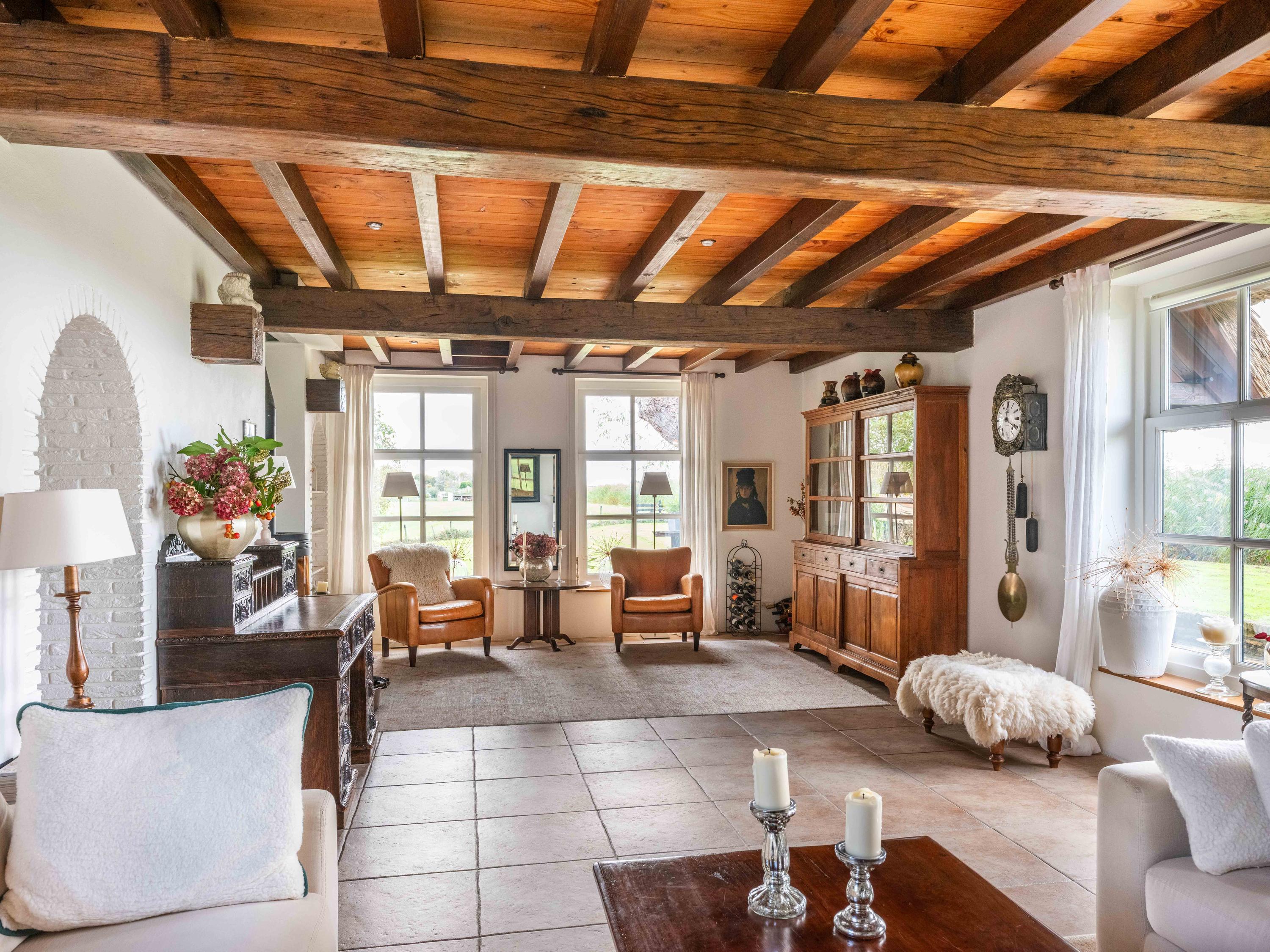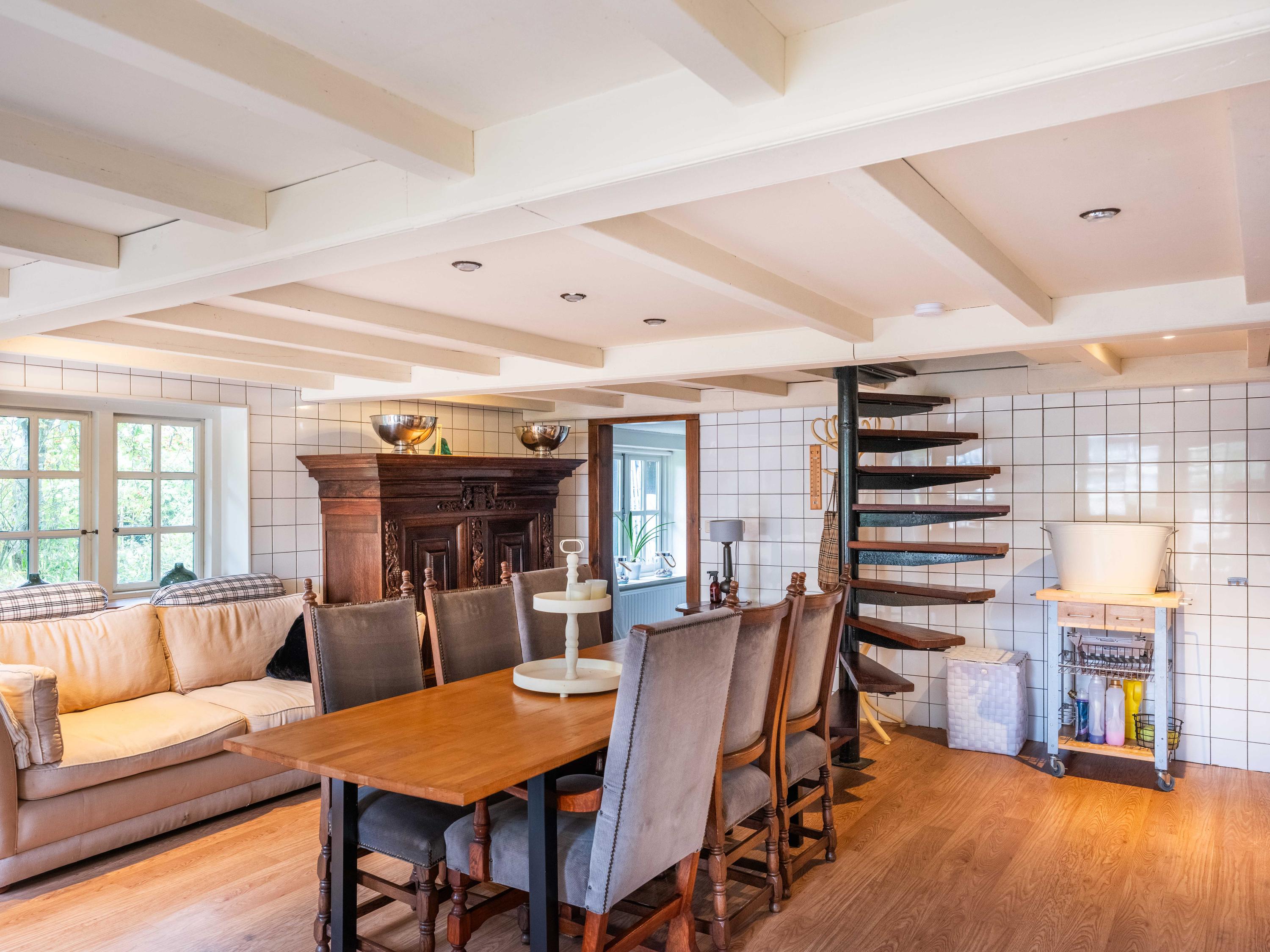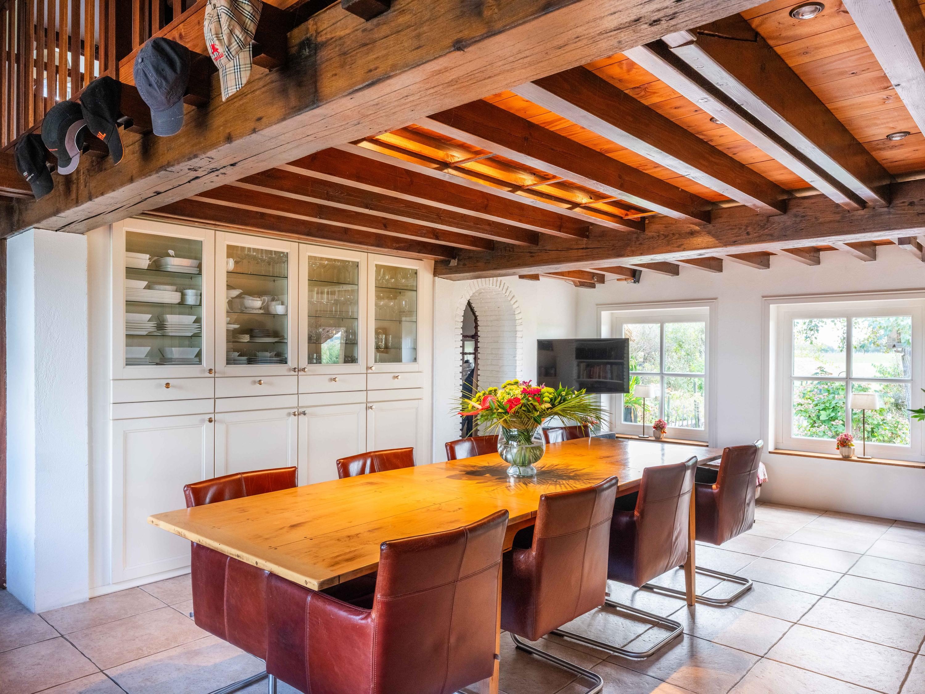 The country-style kitchen is fitted with built-in cabinets and ample storage space. From here, you can also access the spacious cellar, ideal for storage or as a wine cellar. The generous kitchen forms the heart of the home, featuring authentic details such as an English cooker with four ovens and characteristic beamed ceilings. The kitchen flows seamlessly into the inviting living room, where abundant natural light and views over the water immediately draw your attention. This room feels spacious and welcoming, enhanced by the centrally positioned wood-burning stove that adds a warm, homely touch.