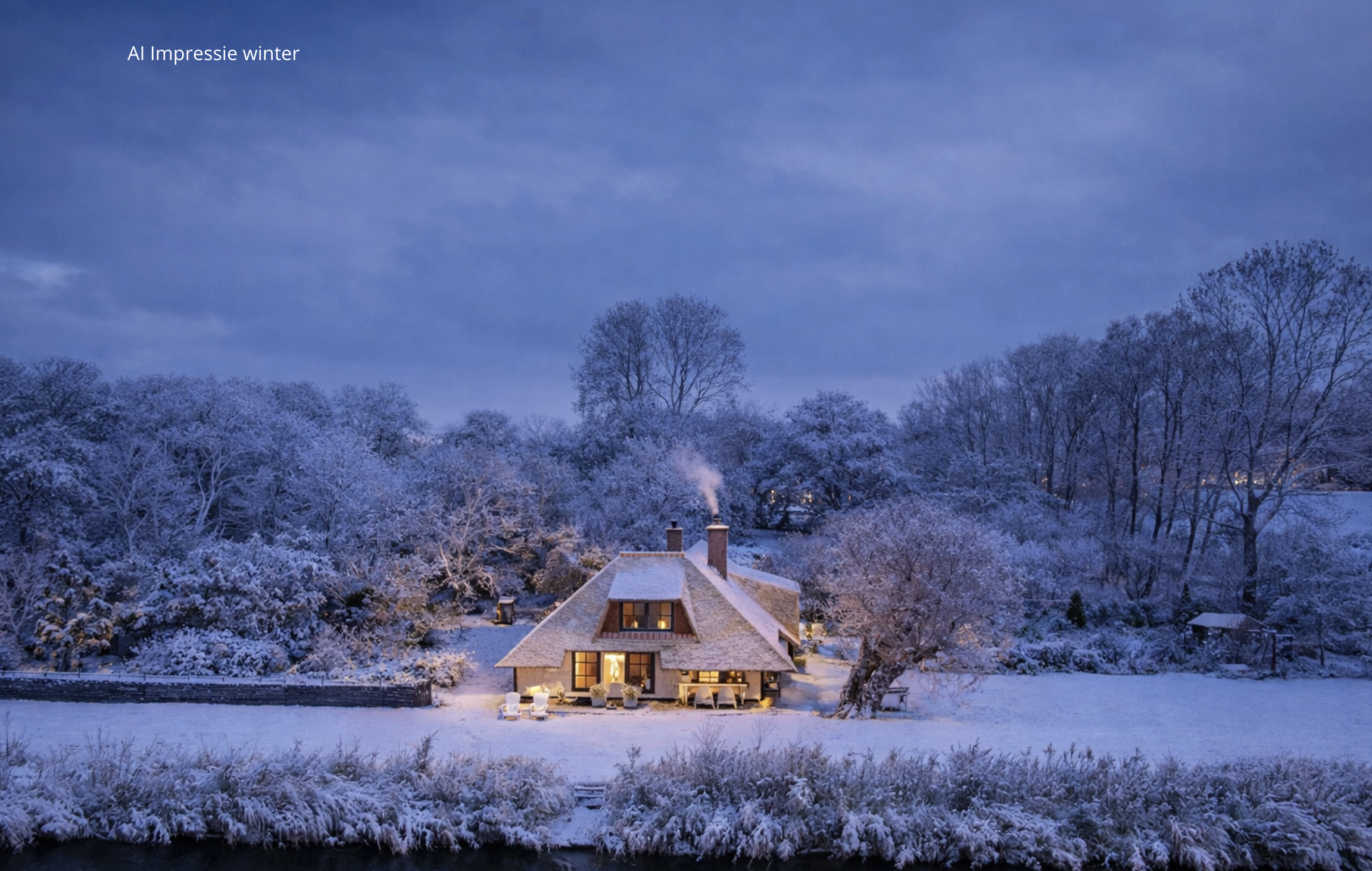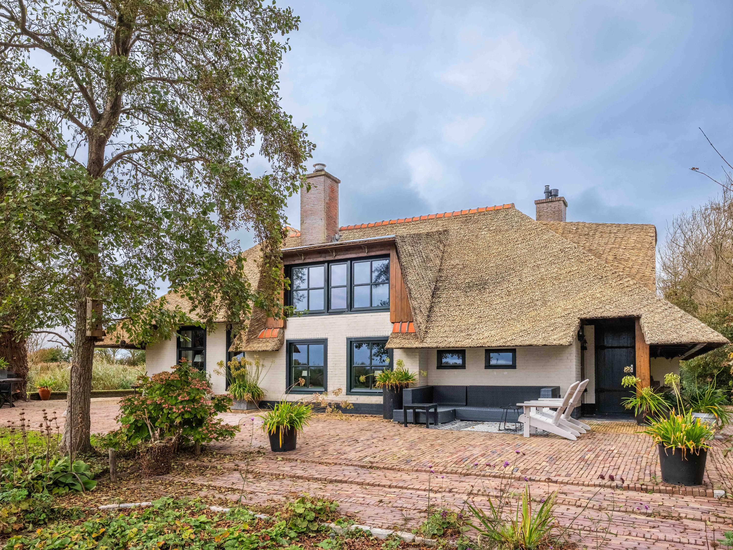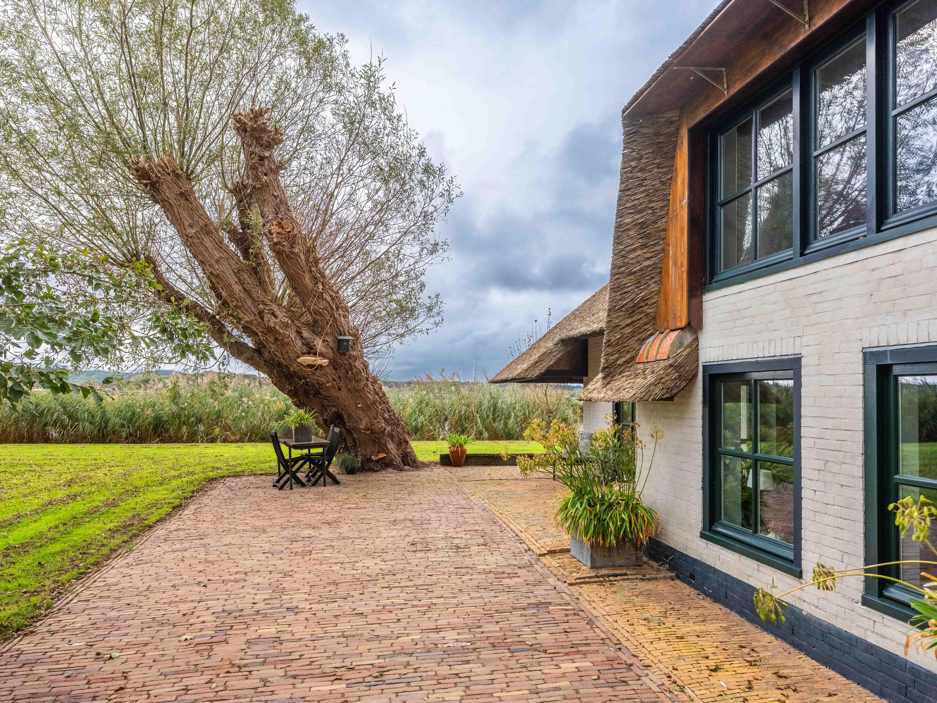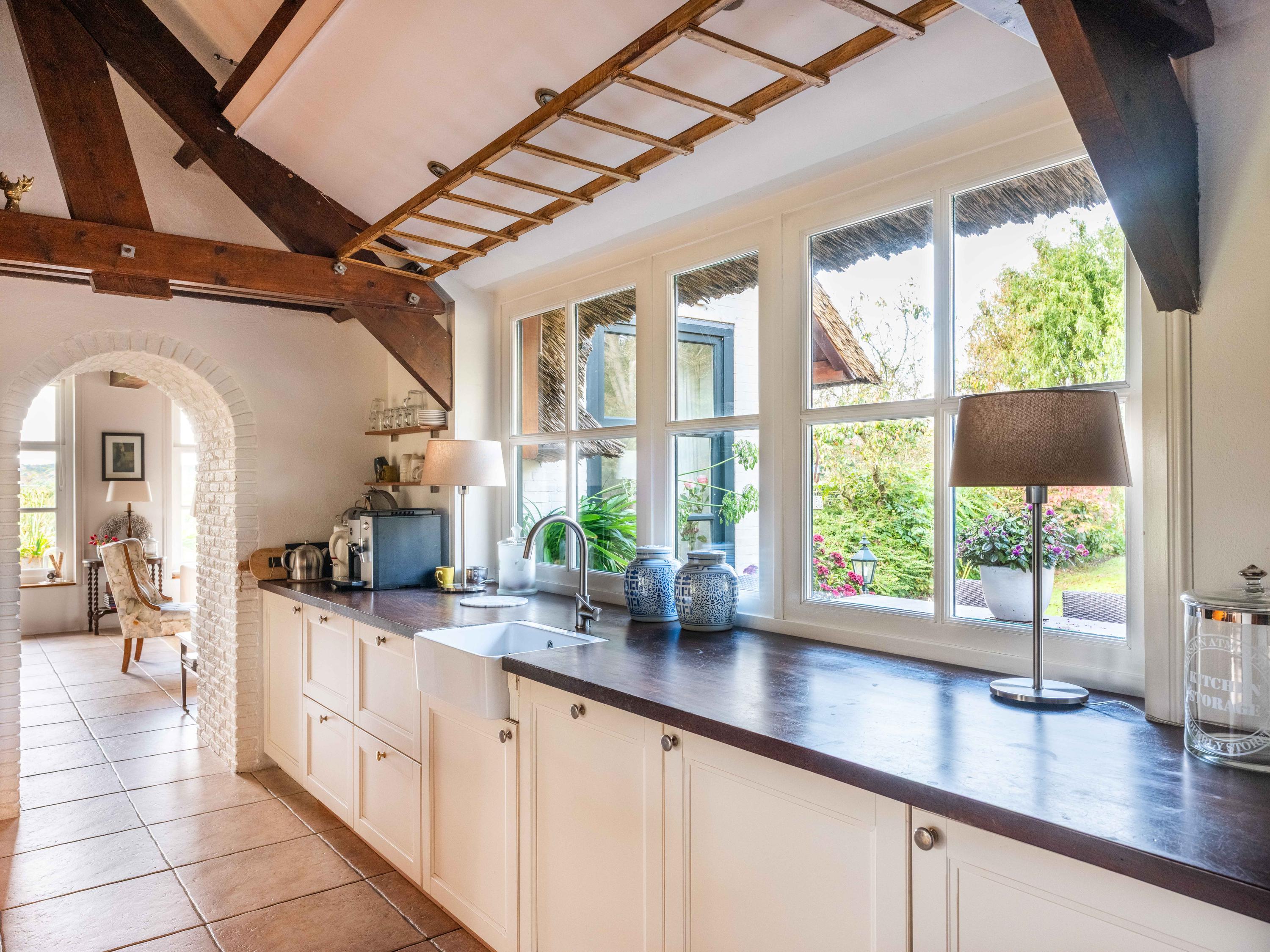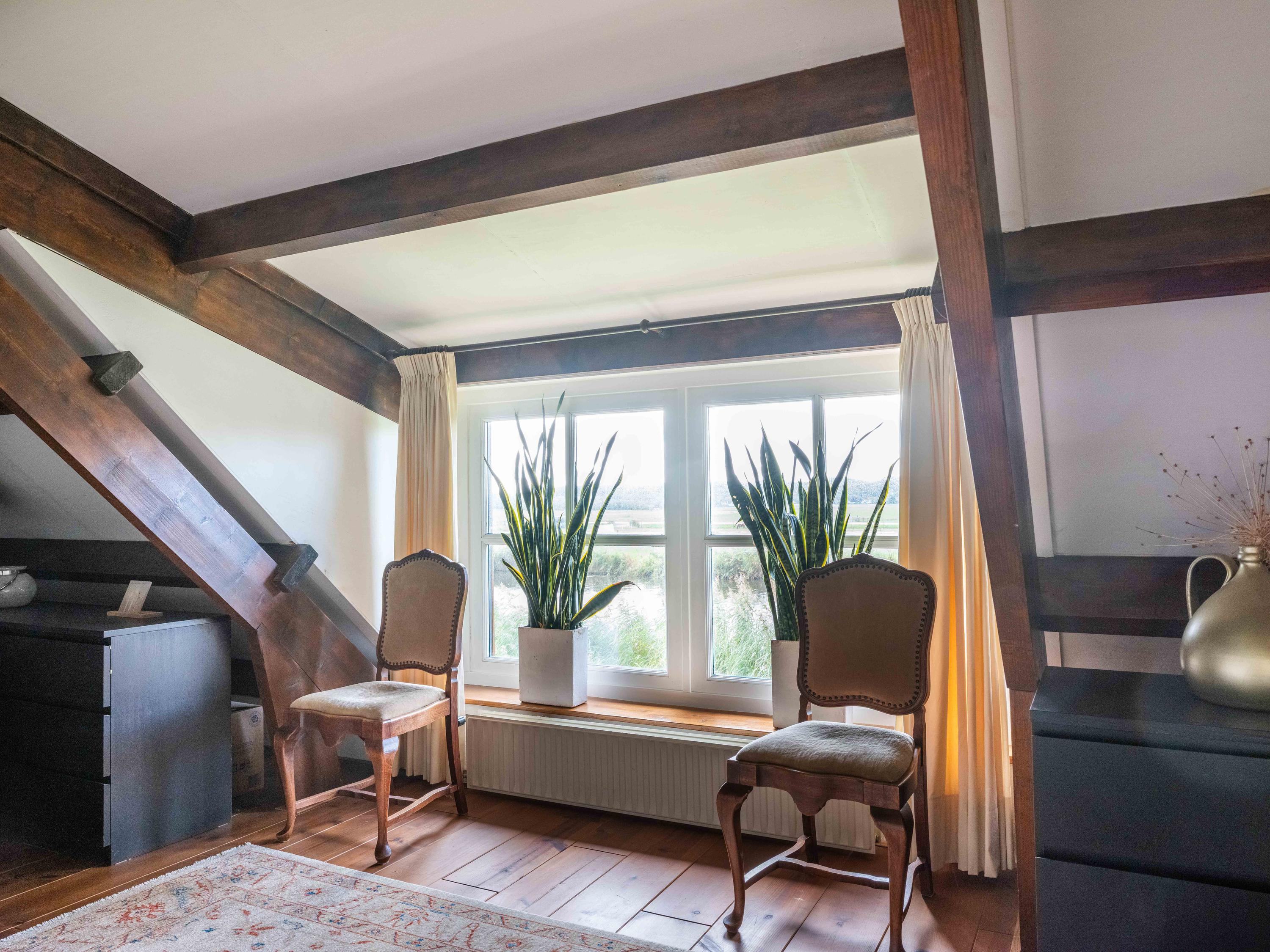 The country-style kitchen is fitted with built-in cabinets and ample storage space. From here, you can also access the spacious cellar, ideal for storage or as a wine cellar. The generous kitchen forms the heart of the home, featuring authentic details such as an English cooker with four ovens and characteristic beamed ceilings. The kitchen flows seamlessly into the inviting living room, where abundant natural light and views over the water immediately draw your attention. This room feels spacious and welcoming, enhanced by the centrally positioned wood-burning stove that adds a warm, homely touch.