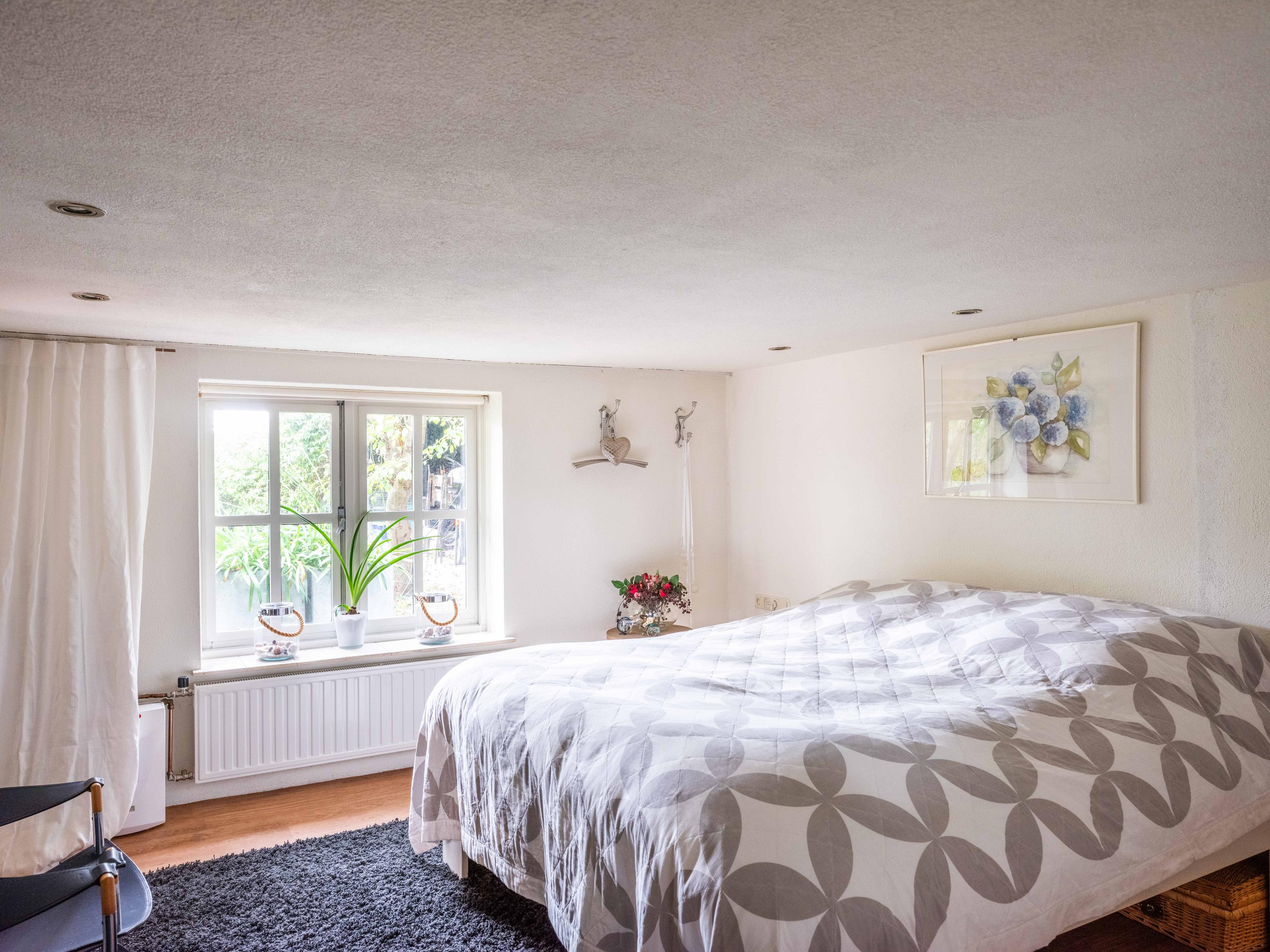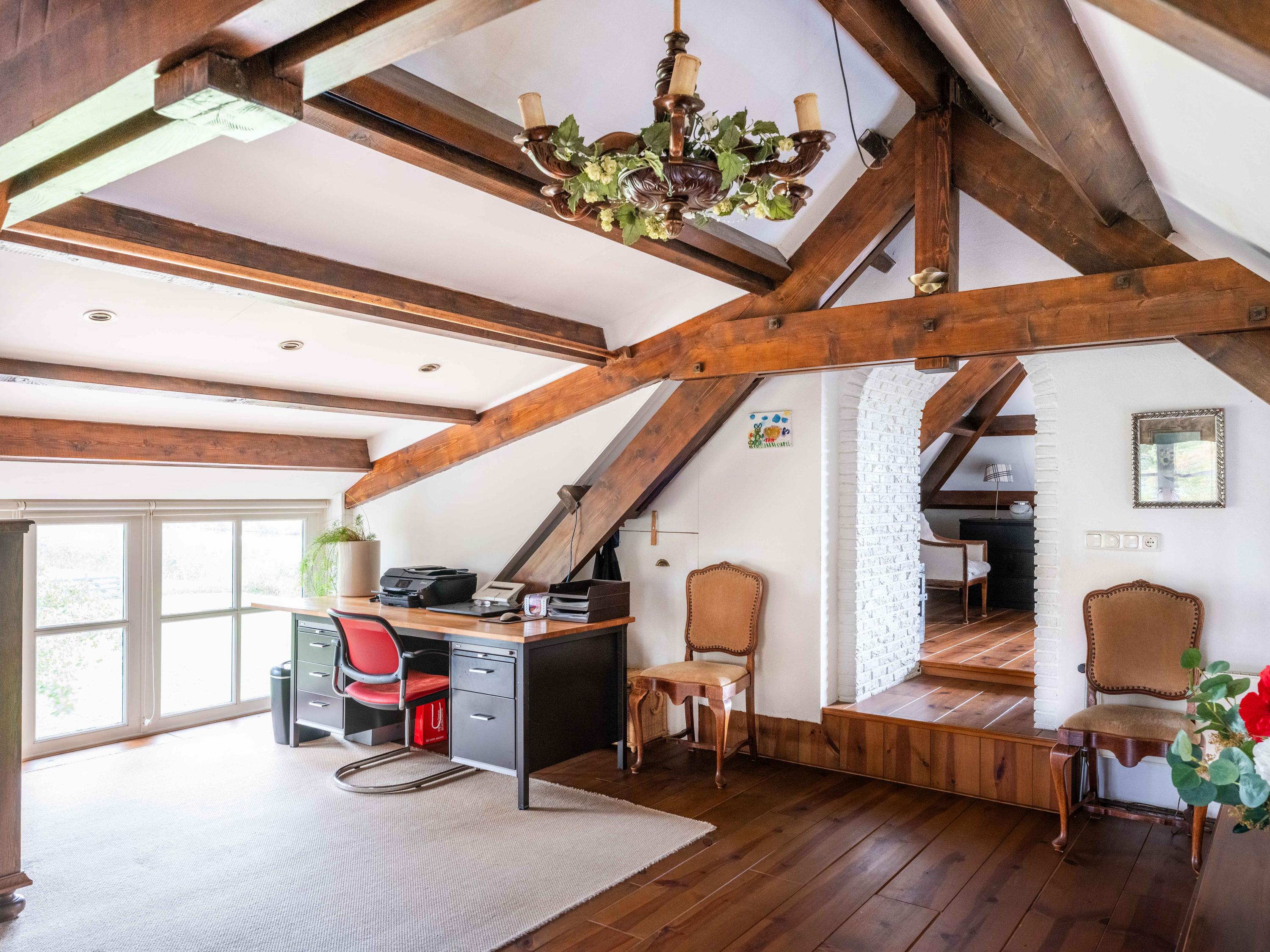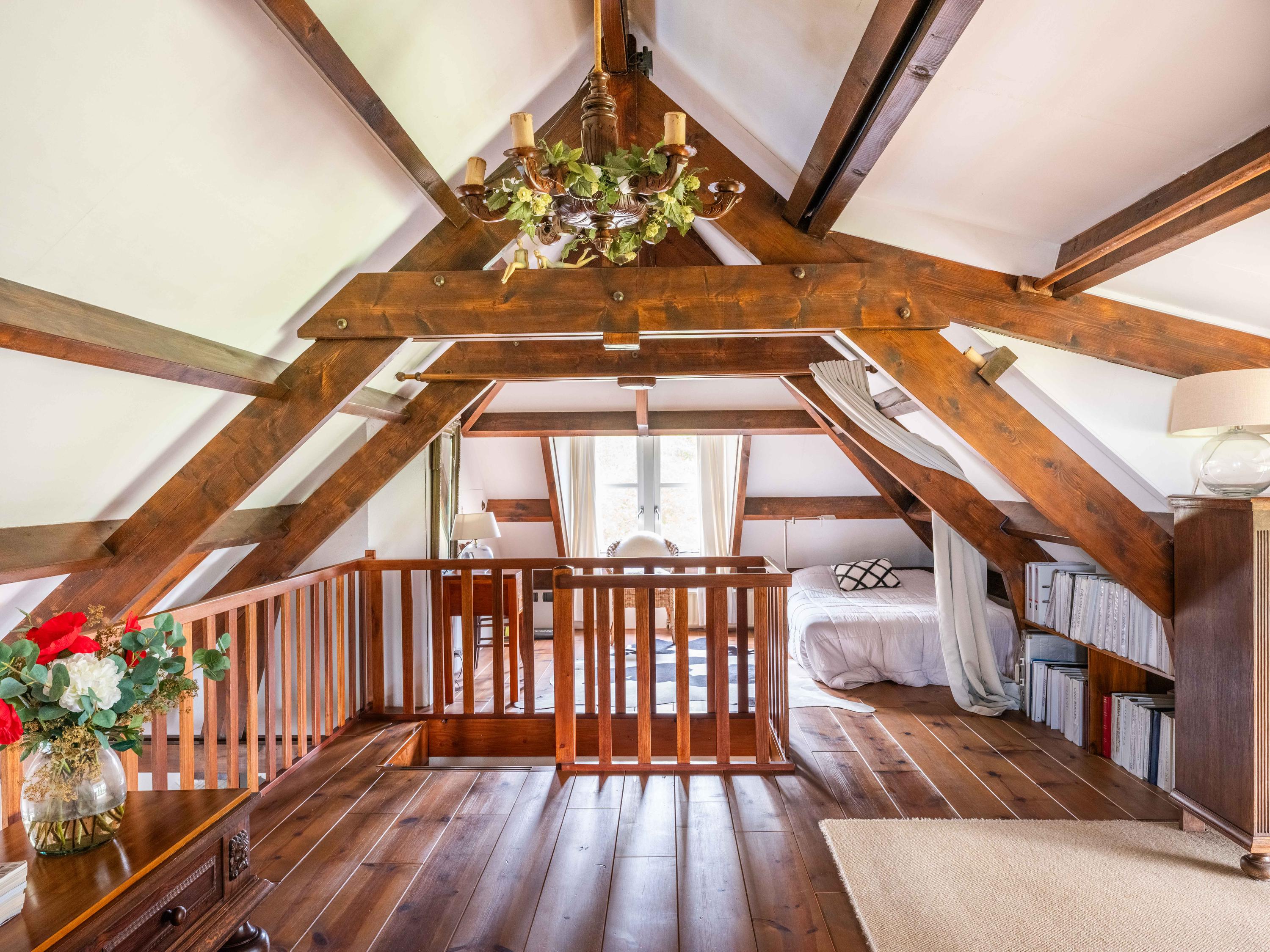 The staircase leads to a large open mezzanine overlooking the kitchen below. This area currently serves as a workspace and guest room, offering lovely views of the garden. Through the open passage, you enter the spacious bedroom, which boasts stunning views over the garden and the wide-open meadows beyond. Thanks to its favorable orientation, this room enjoys sunlight and tranquility throughout the day.