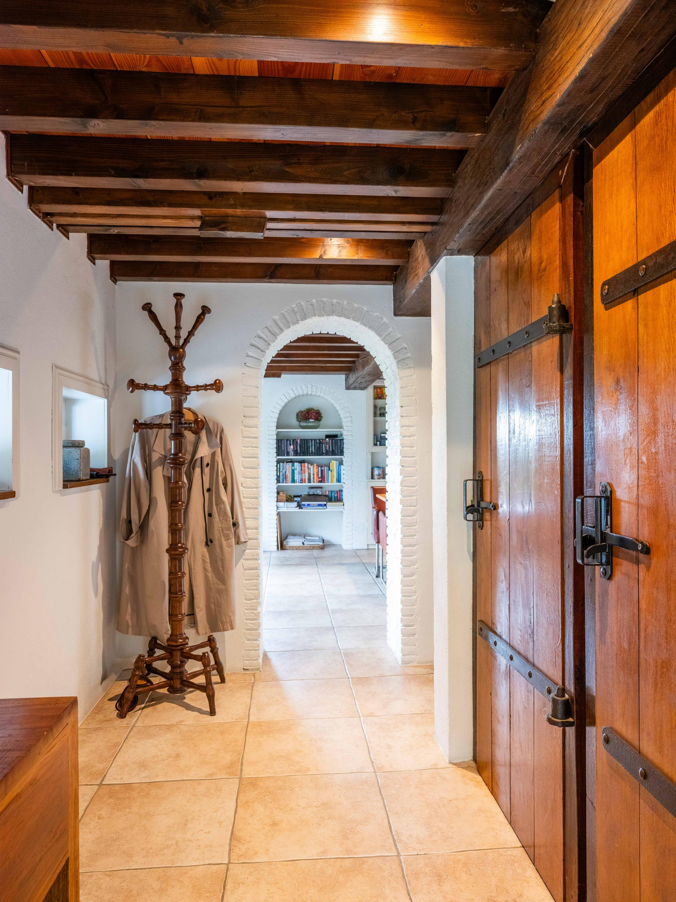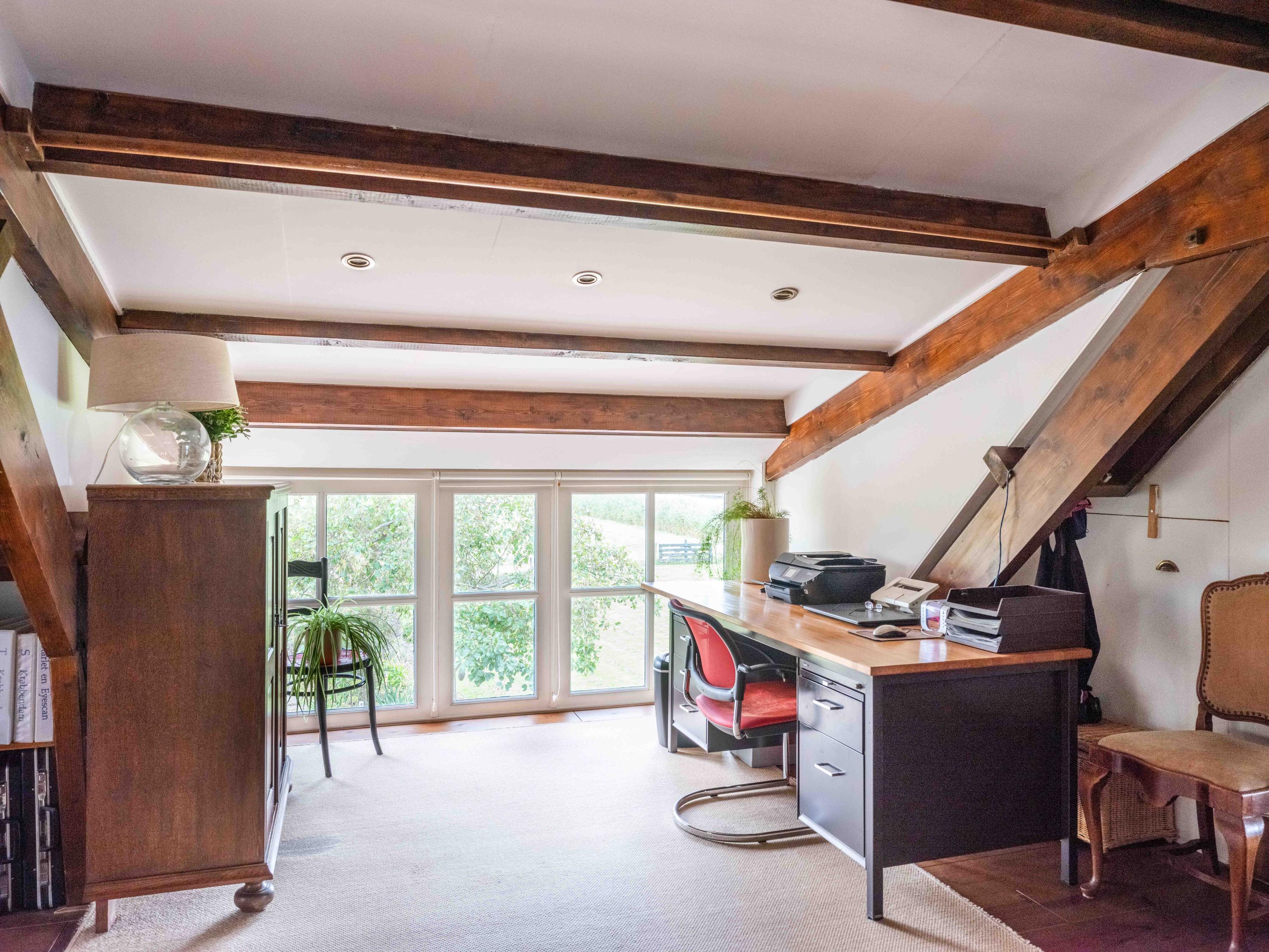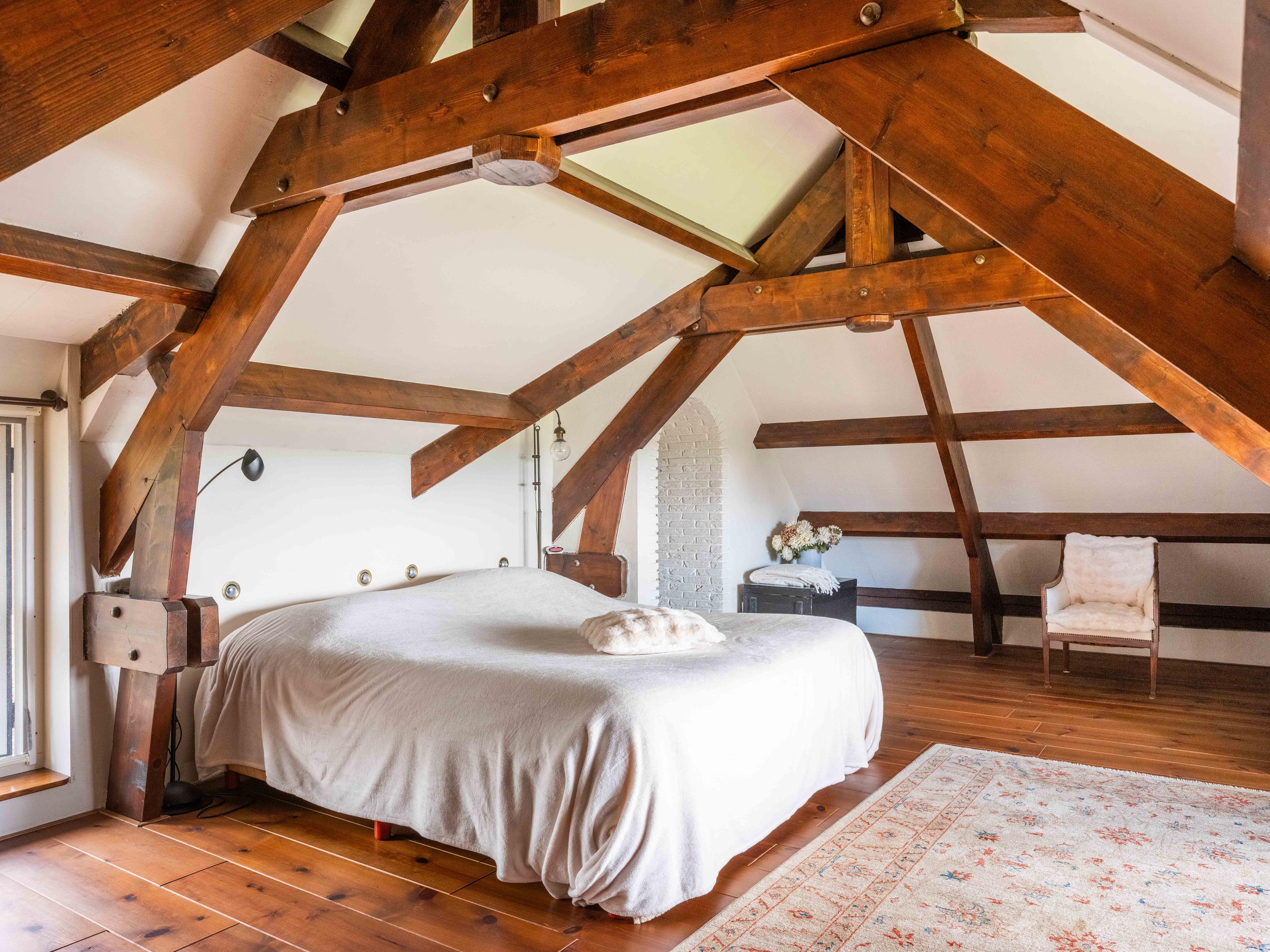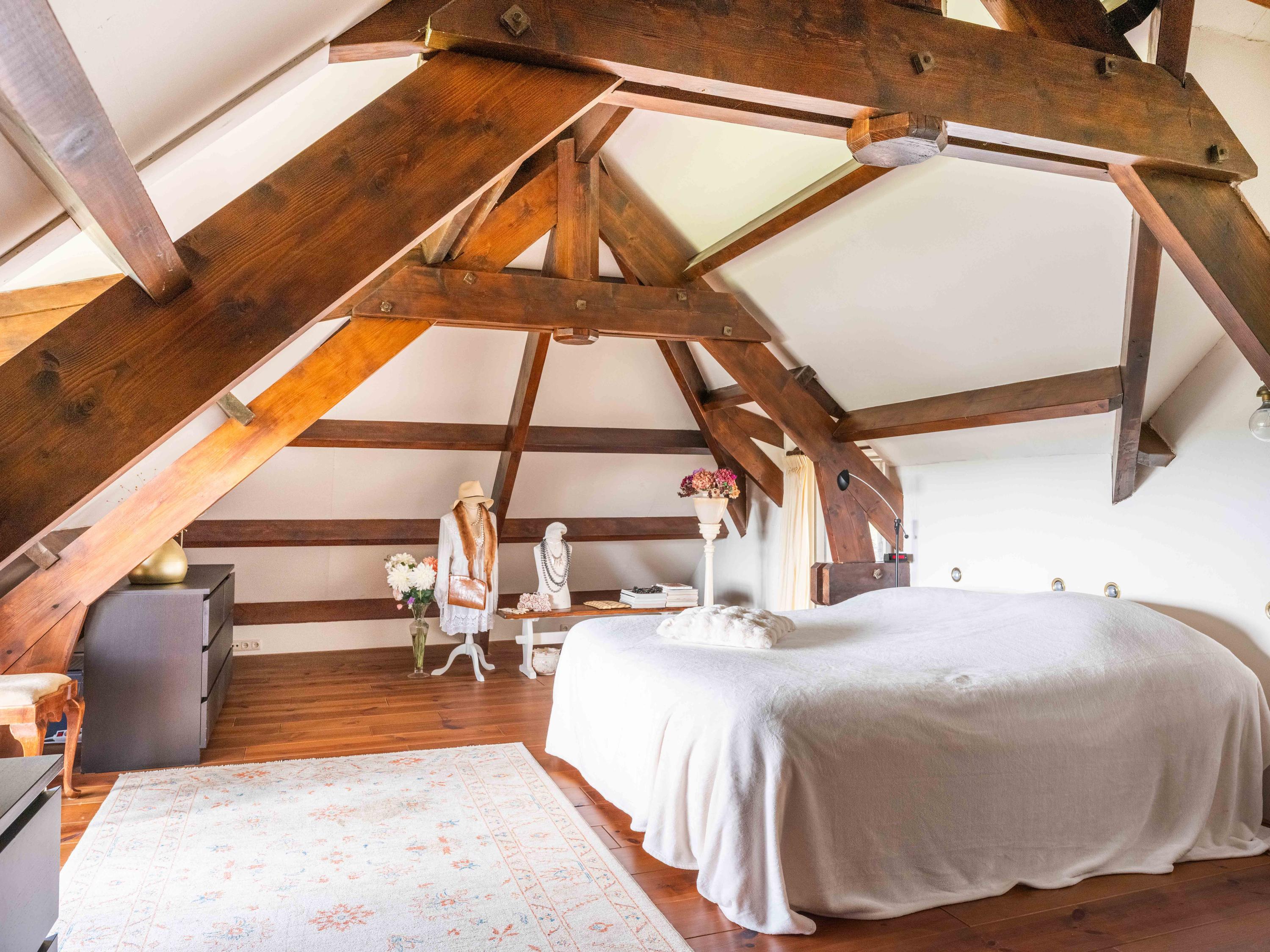 The staircase leads to a large open mezzanine overlooking the kitchen below. This area currently serves as a workspace and guest room, offering lovely views of the garden. Through the open passage, you enter the spacious bedroom, which boasts stunning views over the garden and the wide-open meadows beyond. Thanks to its favorable orientation, this room enjoys sunlight and tranquility throughout the day.