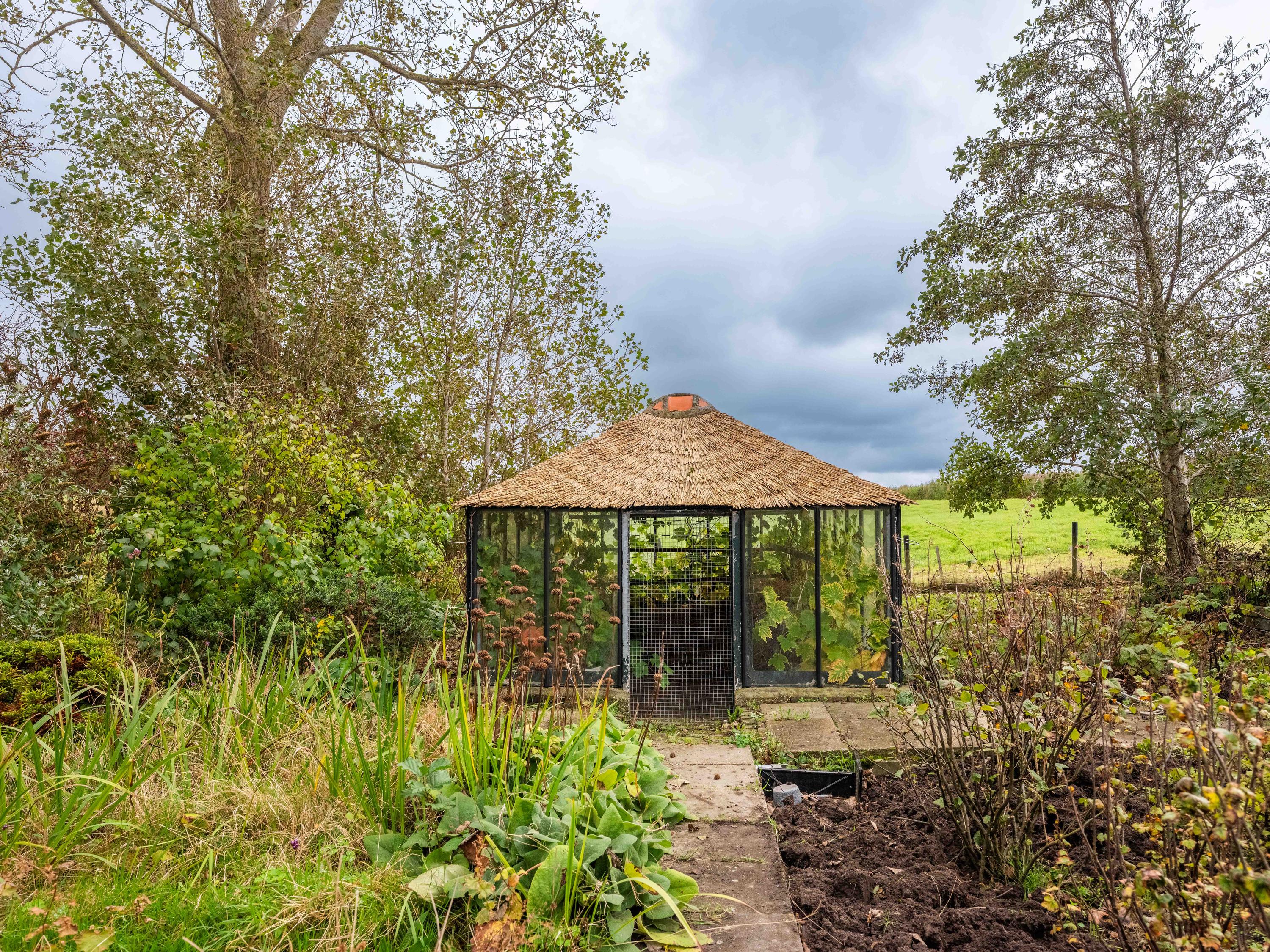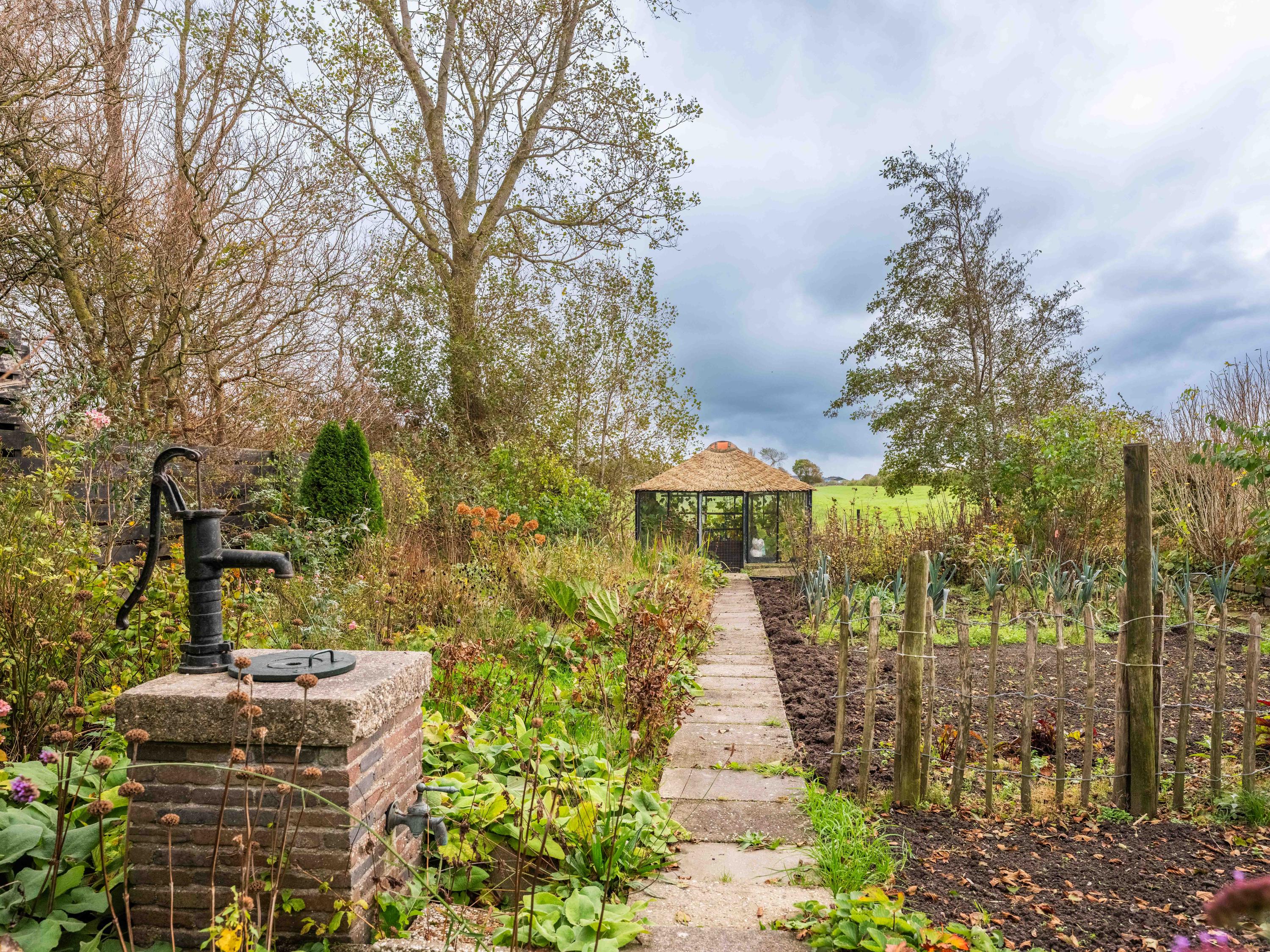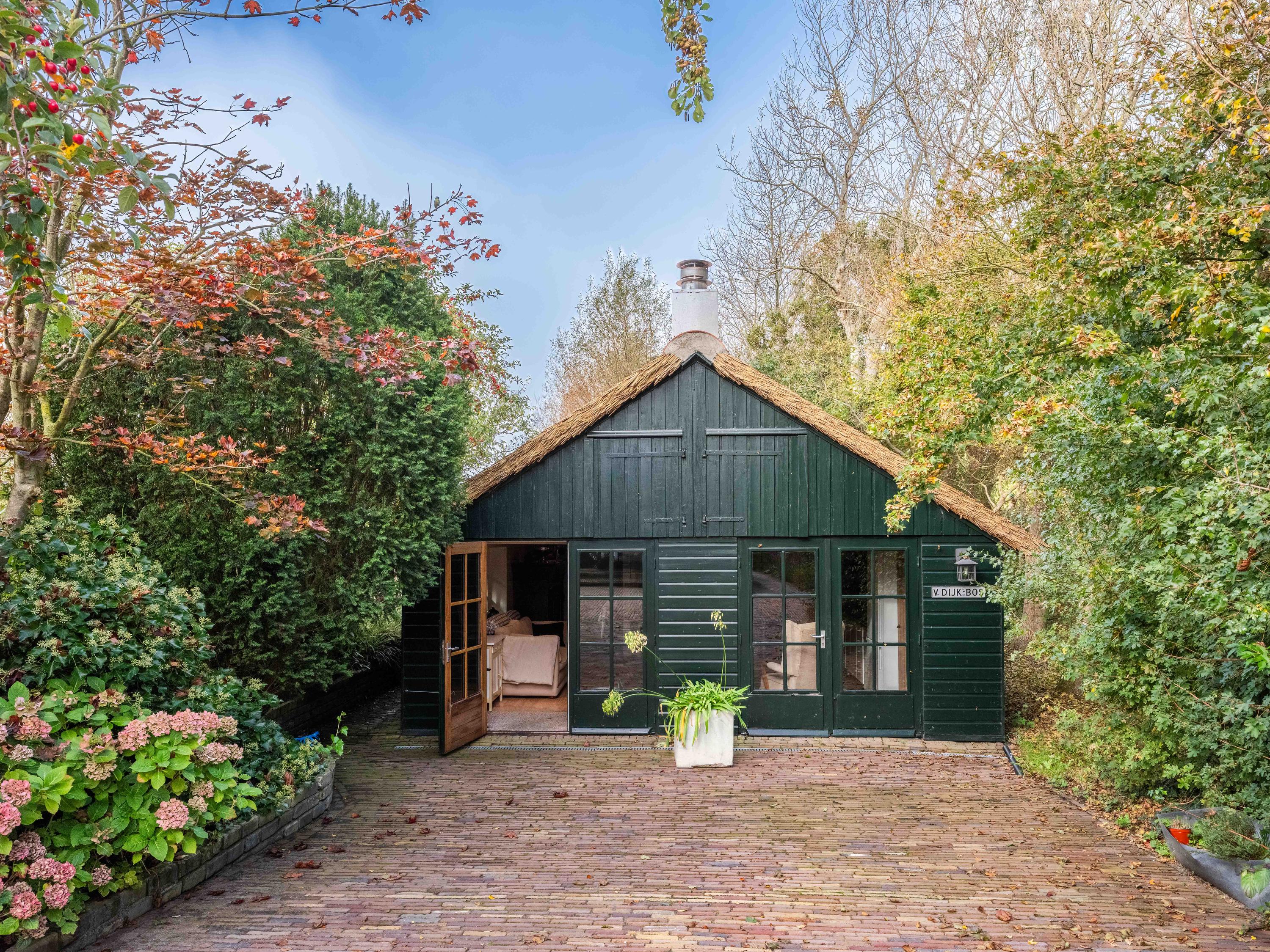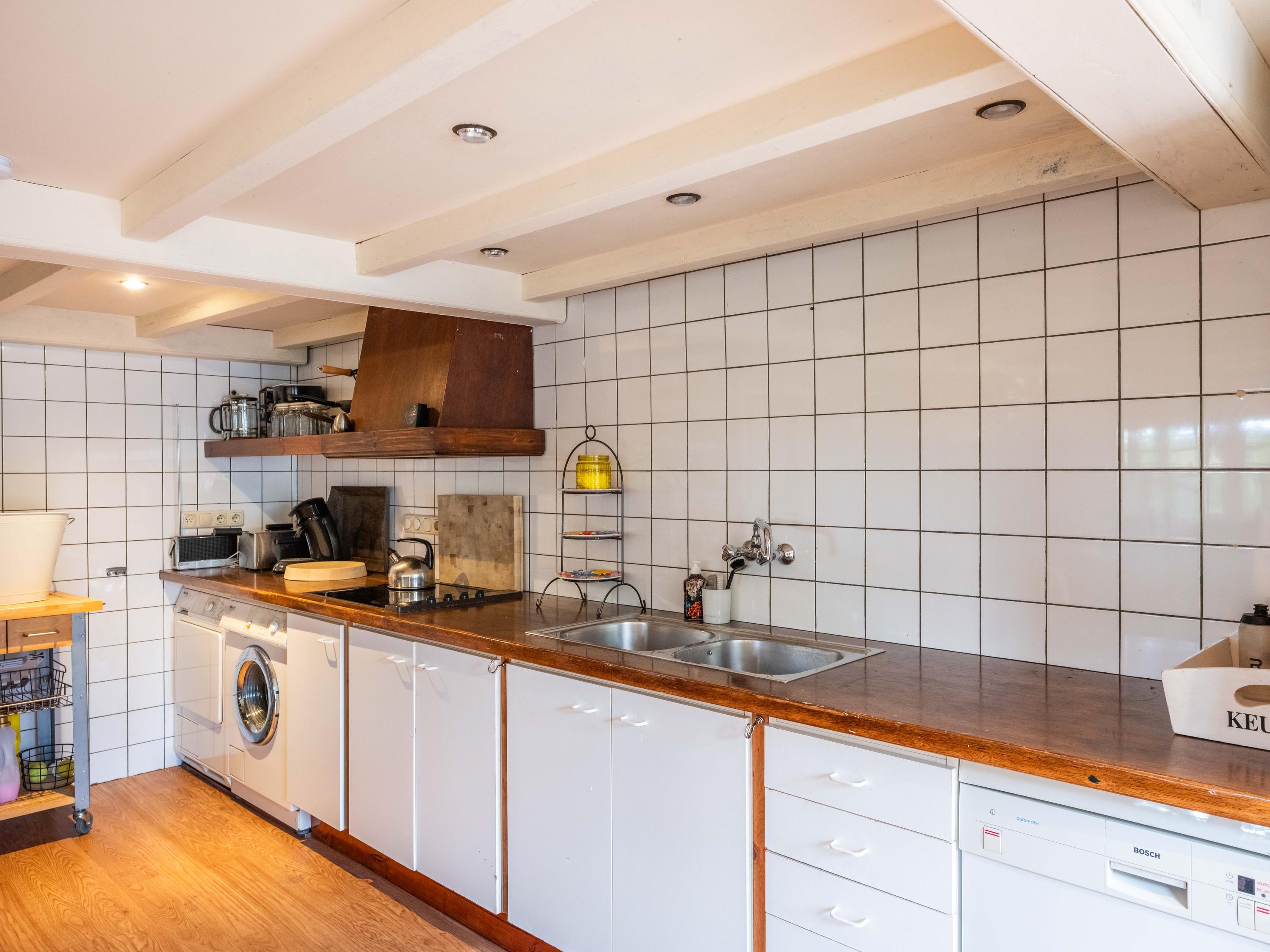 In the beautifully landscaped garden, you will find a fully equipped guesthouse with its own wood stove, open kitchen with complete appliances, washer and dryer, dining area, and radiators. The bedroom includes a private shower, and there is also a separate toilet with washbasin. A attic above provides additional storage space.