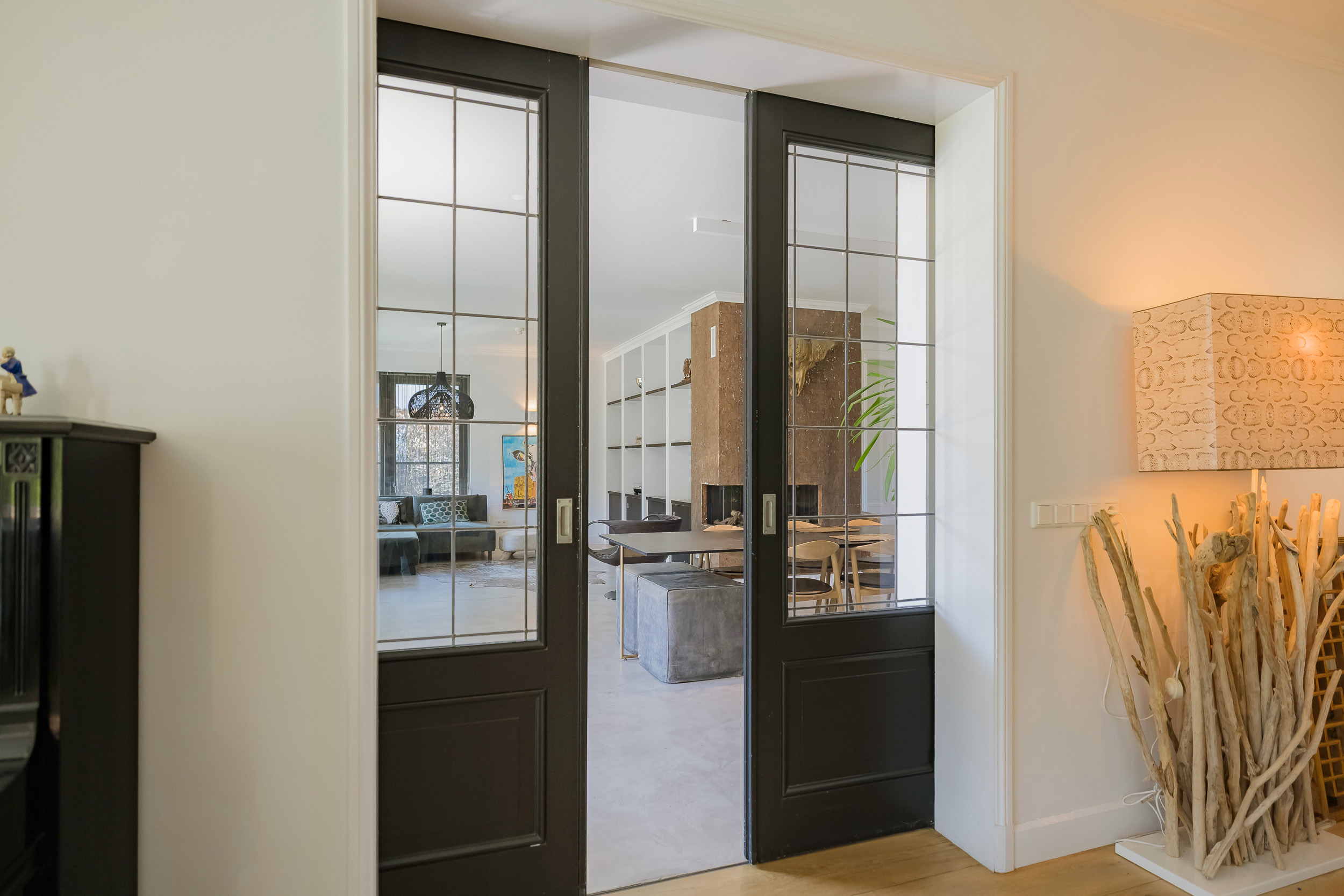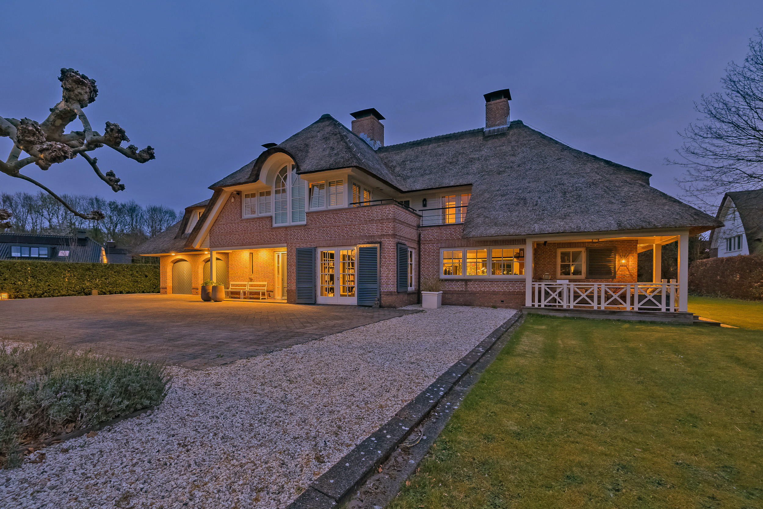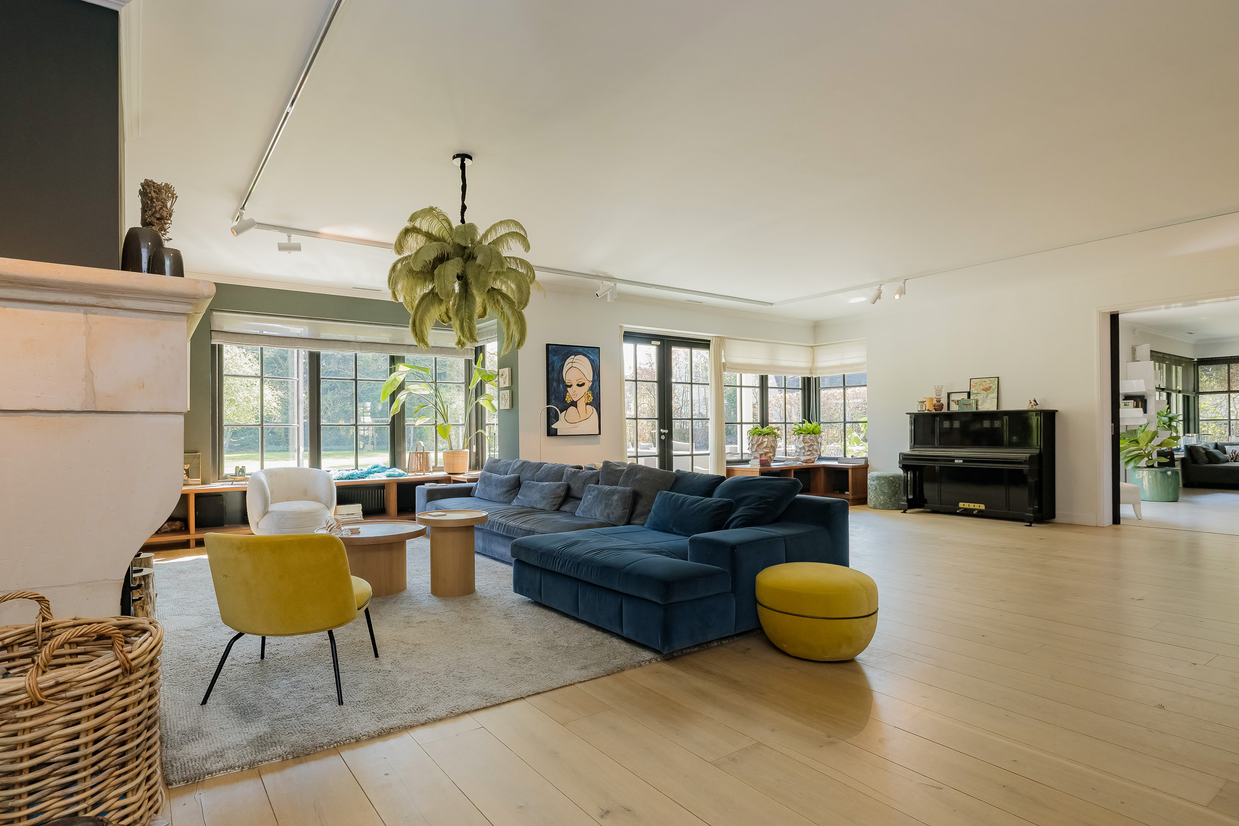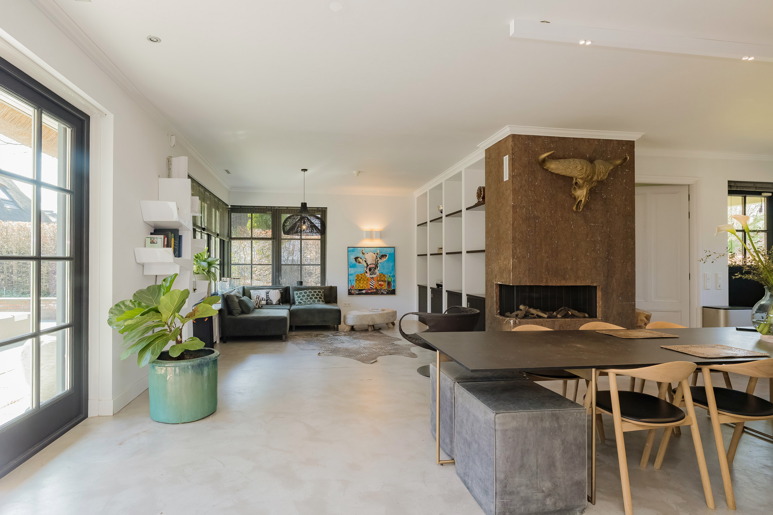 Step into the spacious hall with guest toilet and immediately feel the stylish atmosphere that continues throughout the house. The spacious living room with a beautiful sandstone fireplace and large windows offers a fantastic view of the surrounding garden. For cozy movie nights, there is a separate TV room directly to the right of the entrance. The beautiful concrete-look floor (hallway and living kitchen), luxury steel doors and the high-end kitchen with work island and high-quality appliances provide a modern, yet warm feel. In the living kitchen is further created a lovely sitting area, with access and view of the garden and a modern gas fireplace. Furthermore, on the first floor you will find a practical utility room, double garage, and have access to a spacious porch and a large terrace, where you can fully enjoy the outdoors.