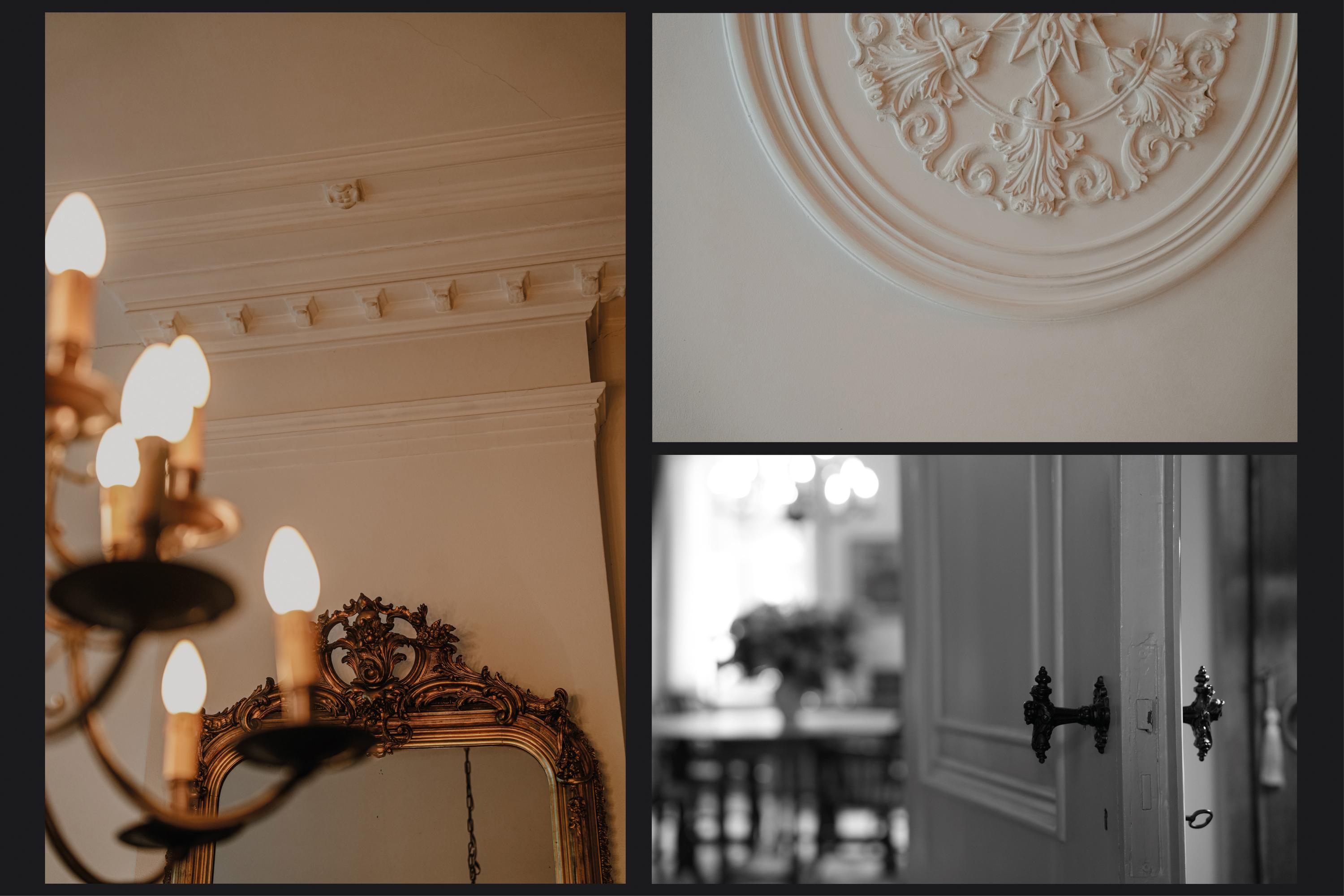 Large hallway, front room with high stucco ceiling, garden-facing rear room with fireplace, hallway, garden-facing dining kitchen, utility room, and pantry cellar on the ground floor
